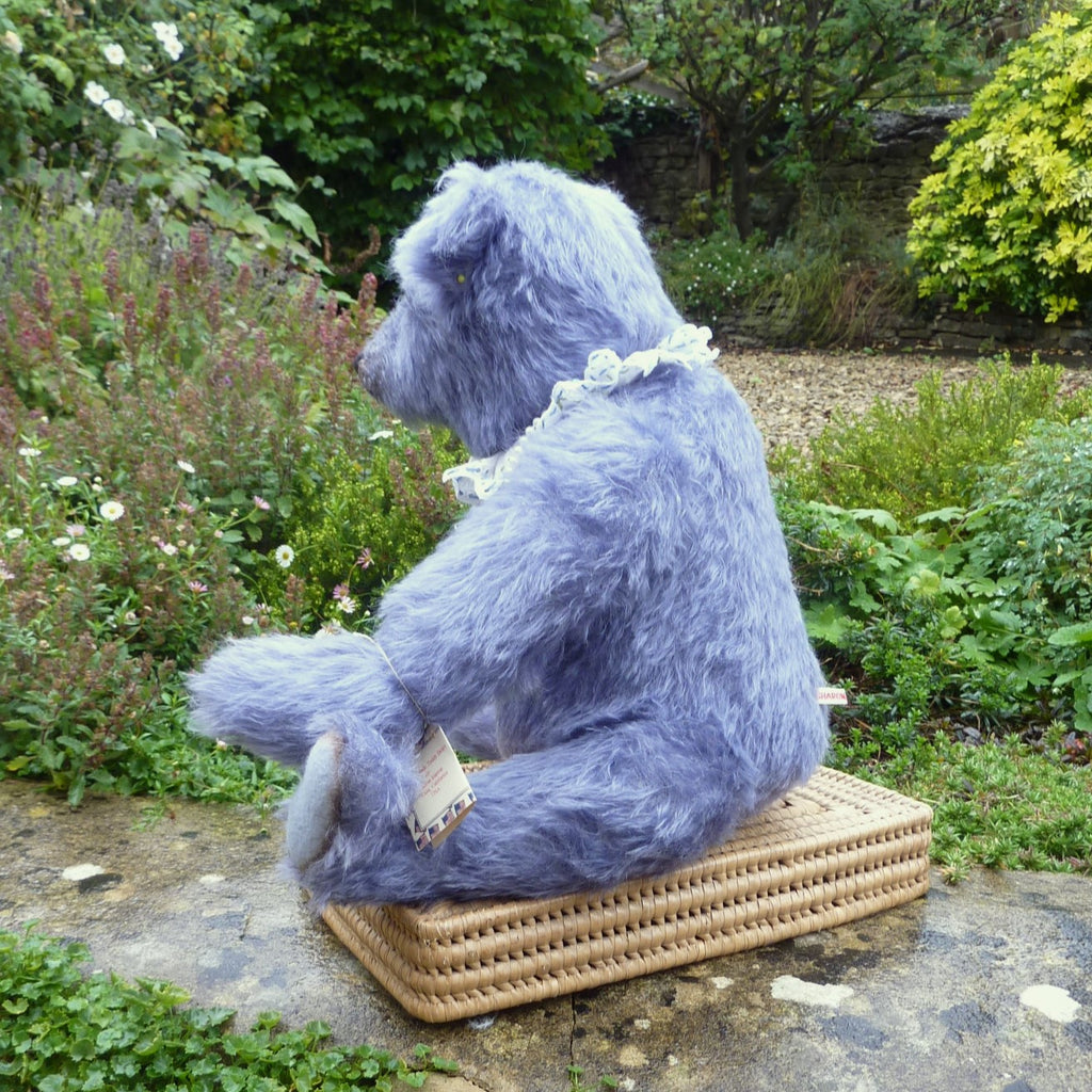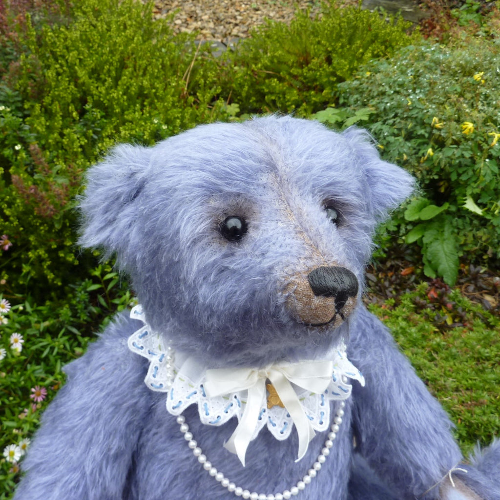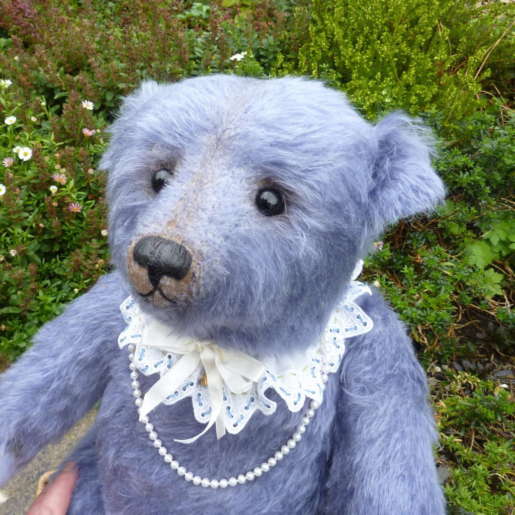 This large and striking bear is made of unusual lightly distressed, blue mohair with a centre seam head, black glass eyes, a waxed thread nose and very subtle airbrushed shading on her face and the edges of her felt paw pads. Softly filled with polyfibre with glass beads added for weight, Bethany wears a vintage lace collar and a string of pearls. (If bought by someone outside the UK, there will be a GBP55 surcharge towards the airmail cost.)