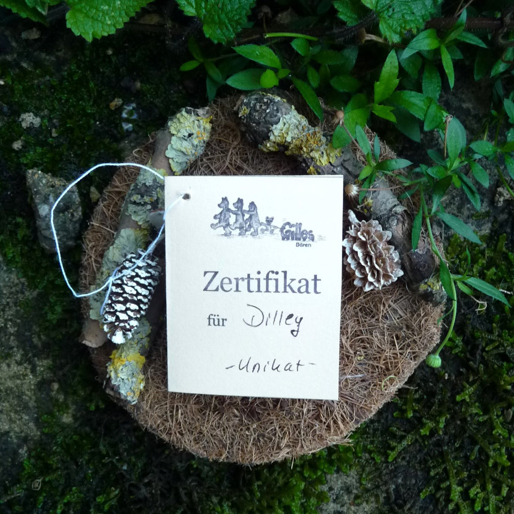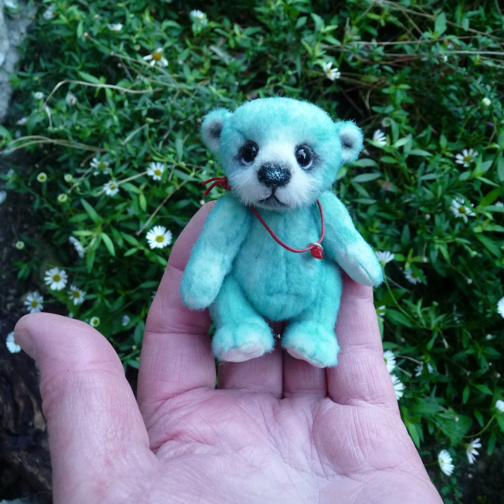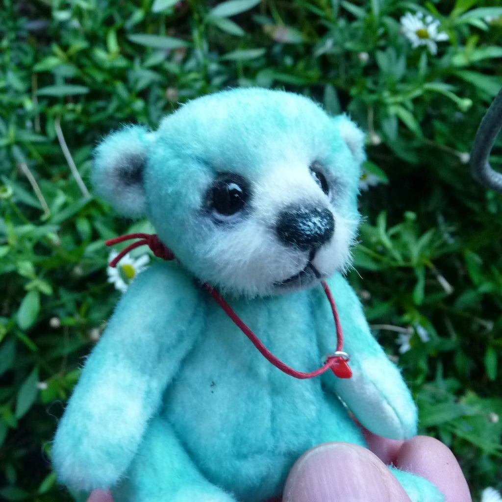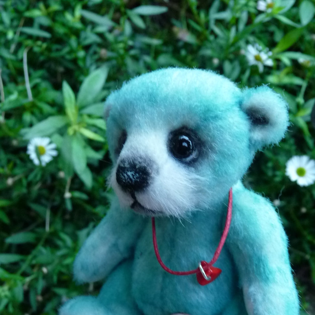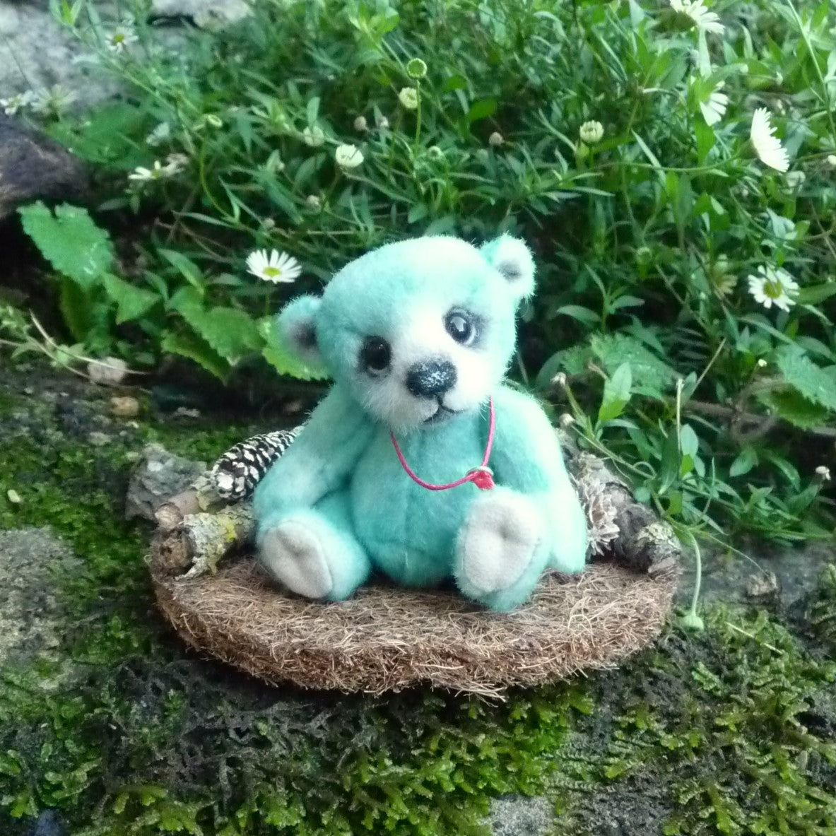 This super-cute, little bear is made of high quality, soft and dense, turquoise-tipped white manmade plush with felted black glass eyes and faux suede foot pads. Softly filled with polyfibre and slightly weighted with mineral granules Dilley wears a red stone pendant and comes on the woodland tableau as shown.