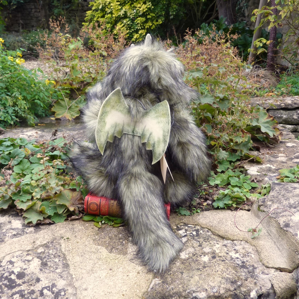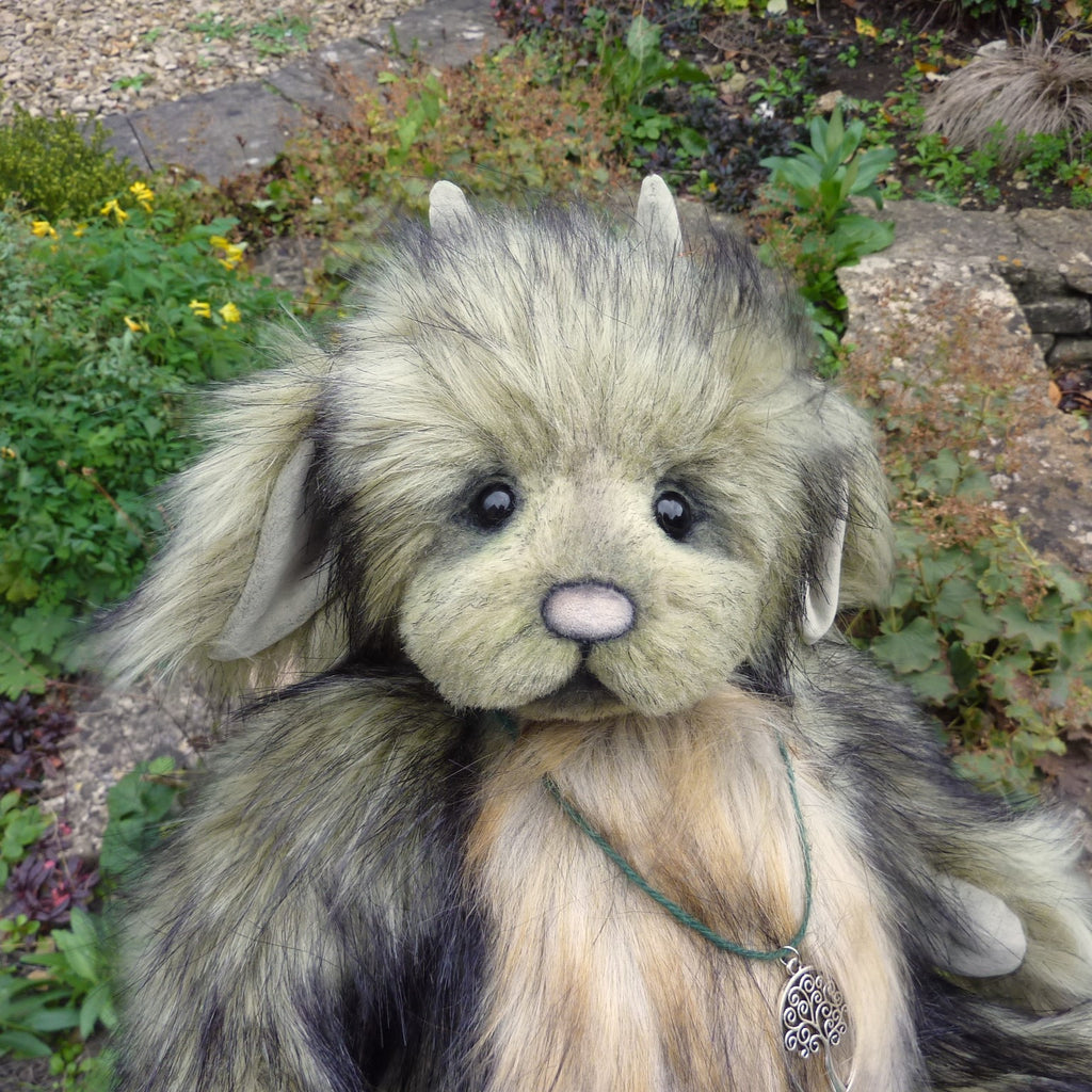 This large and gentle-looking dragon is made of extra-long and soft, black-tipped, high quality, pale green manmade plush with a beige plush front. He has black glass eyes (with felt behind), fsuedine horns and paw pads, and subtly hand-painted felt wings. Softly filled with polyfibre and weighted with mineral granules. he wears a tree of life pendant.