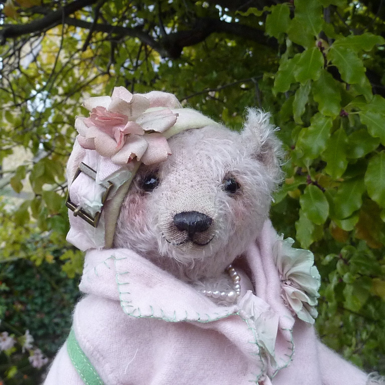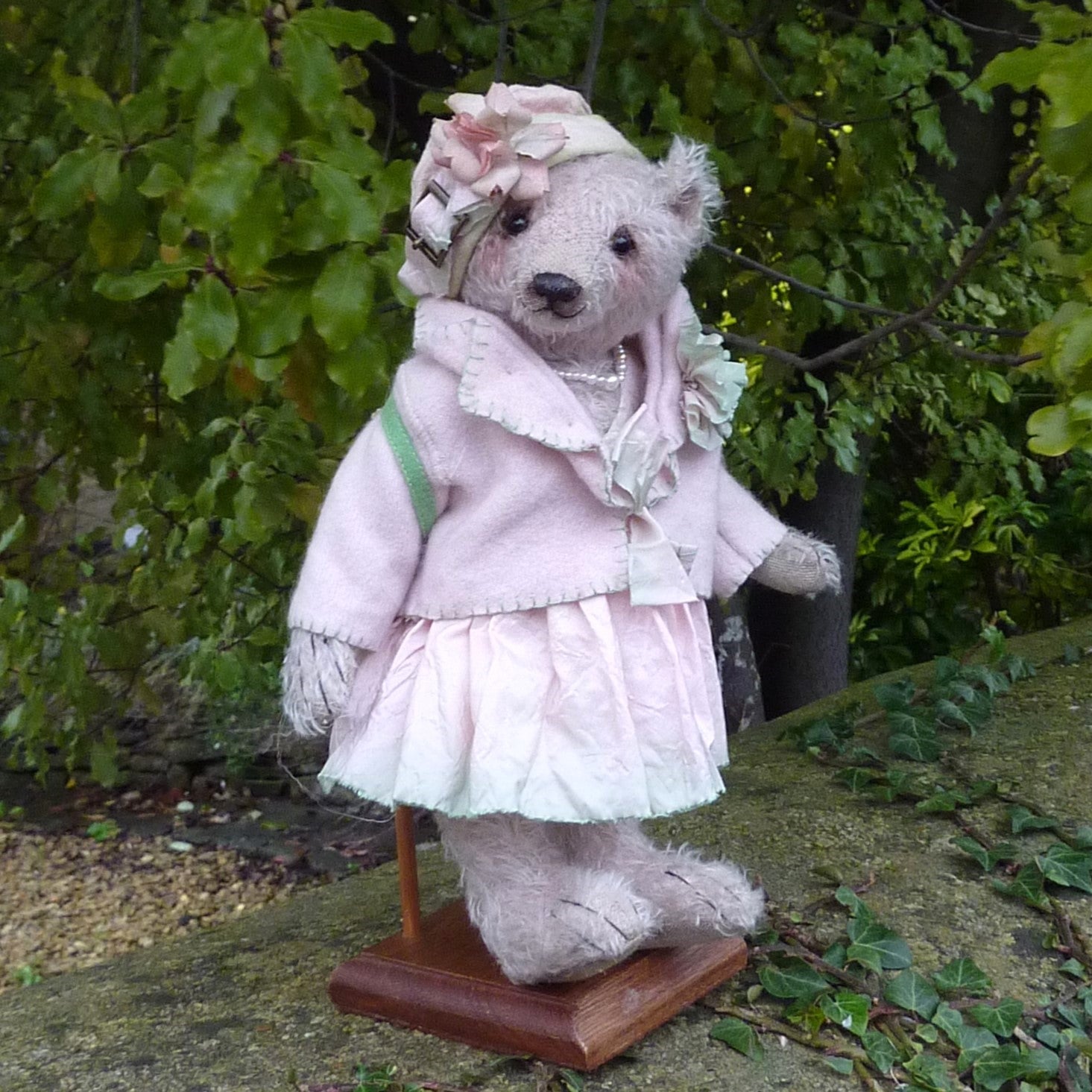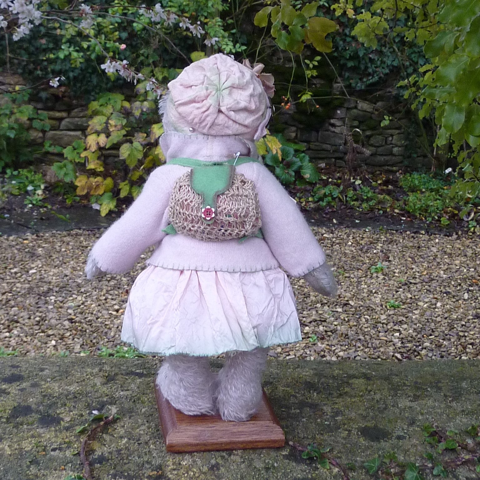 This stunning bear is made of sparse and distressed, grey mohair with black glass eyes, a waxed thread nose, rouged cheeks, wired arms and linen paw pads. She is stylishly dressed in a two-toned silk dress, an elegant and harmonising, wool jacket and a hat made of similar vintage materials. She carries a crocheted back-pack. Antoinette is filled with a mixture of wood shavings, polyester fibre and tiny mineral stones.