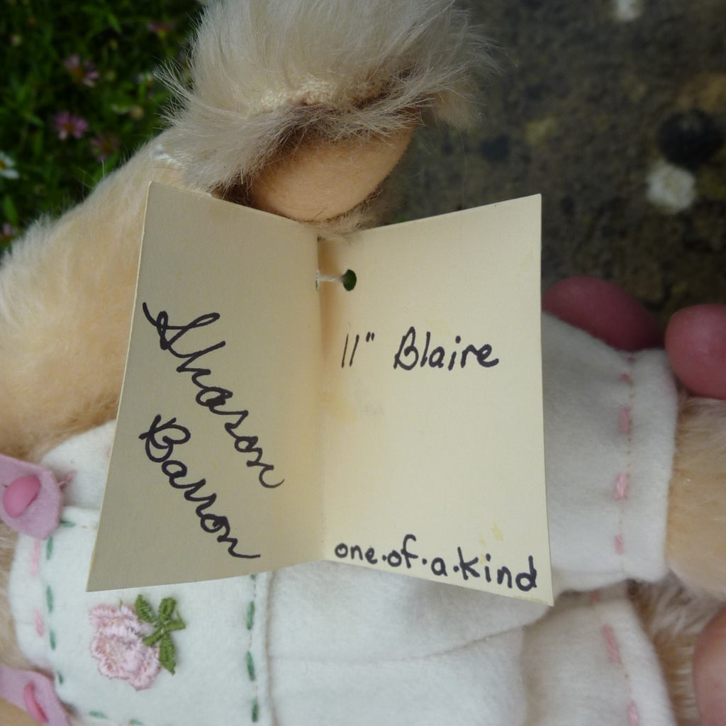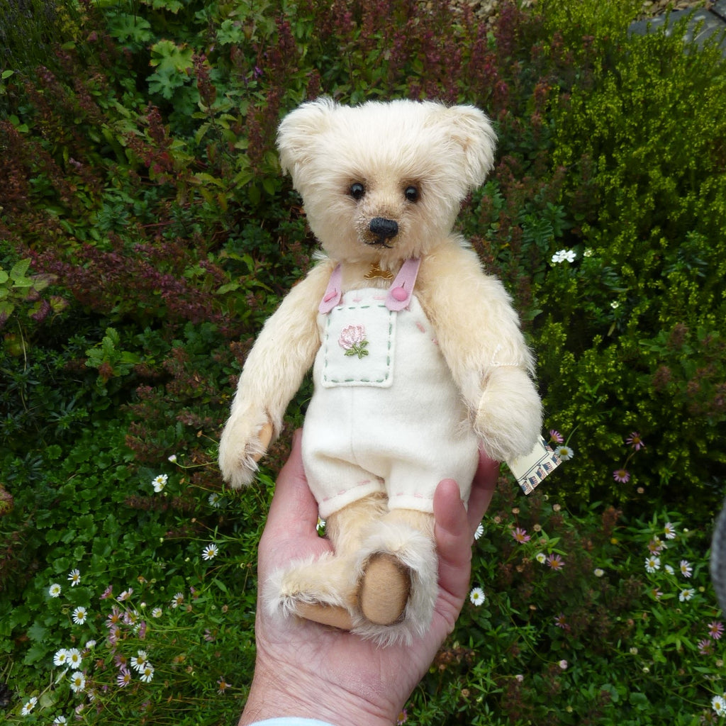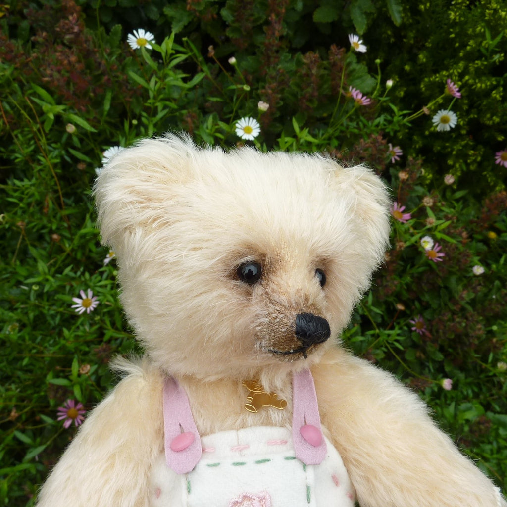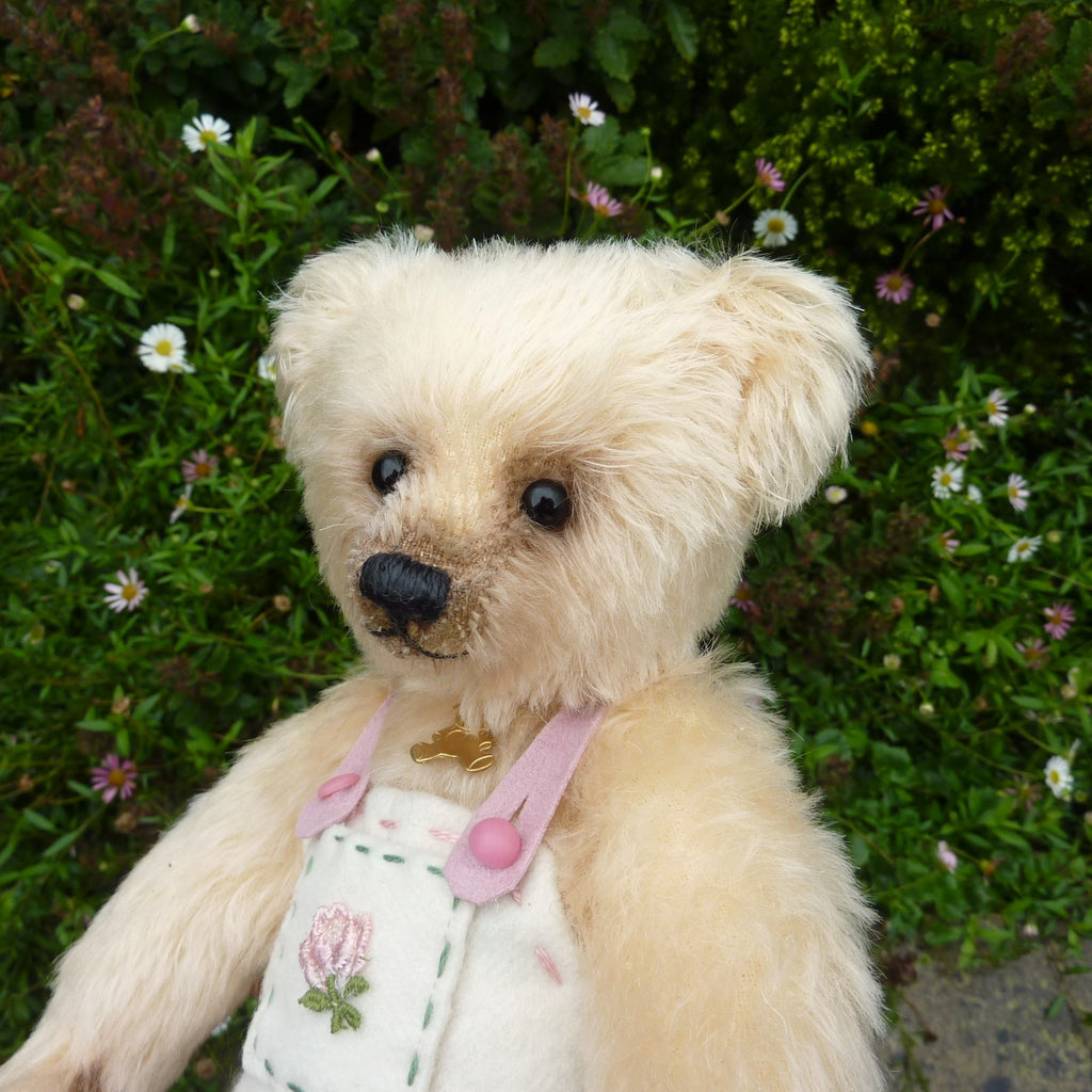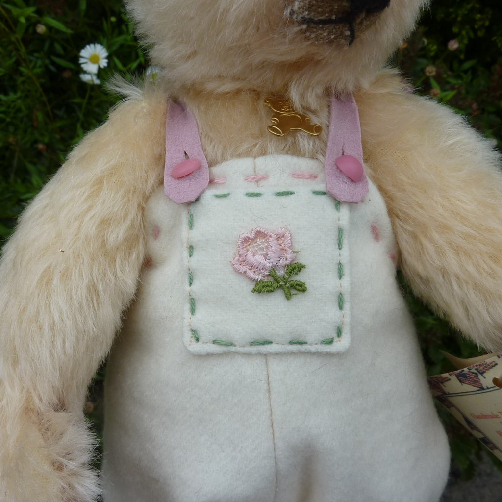 This highly endearing, small to medium-sized bear is made of lightly distressed, cream mohair with black glass eyes a waxed thread nose and airbrushed shading on her face and the edges of her felt paw pads. Filled softly with a mixture of polyfibre and glass beads, Blaire wears felt rompers with a rose-embroidered pocket.