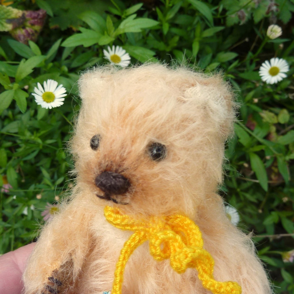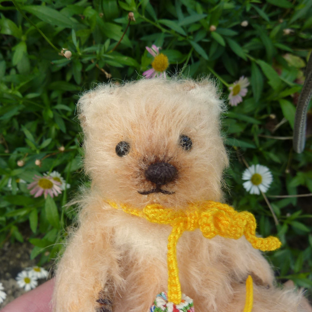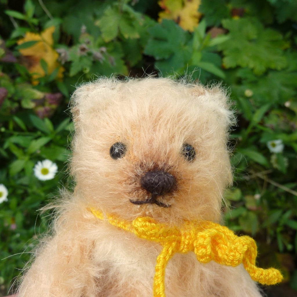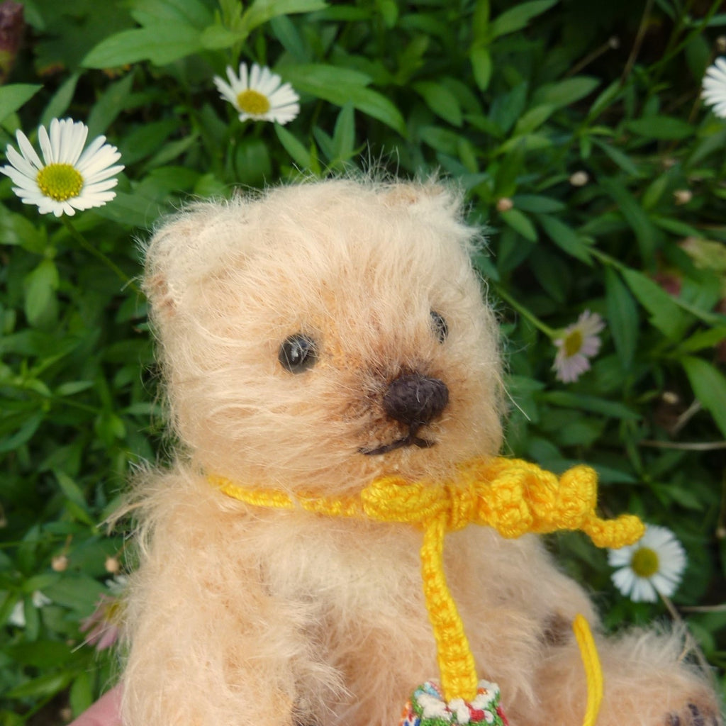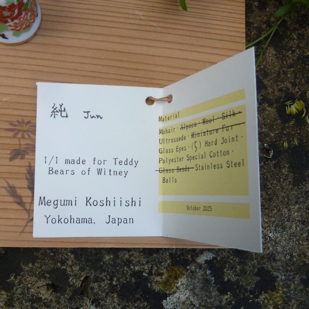 Made of sparse, wavy and distressed, cream mohair with a subtle, off-white moon-shaped mohair collar, this small and attractive bear has black glass eyes and claw-stitched, faux suede paw pads. Jun wears a cord neck tie, finished with a traditional temari ball toy. Jun is filled with a polyester cotton, and weighted with stainless steel beads.