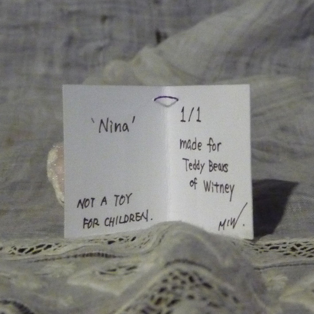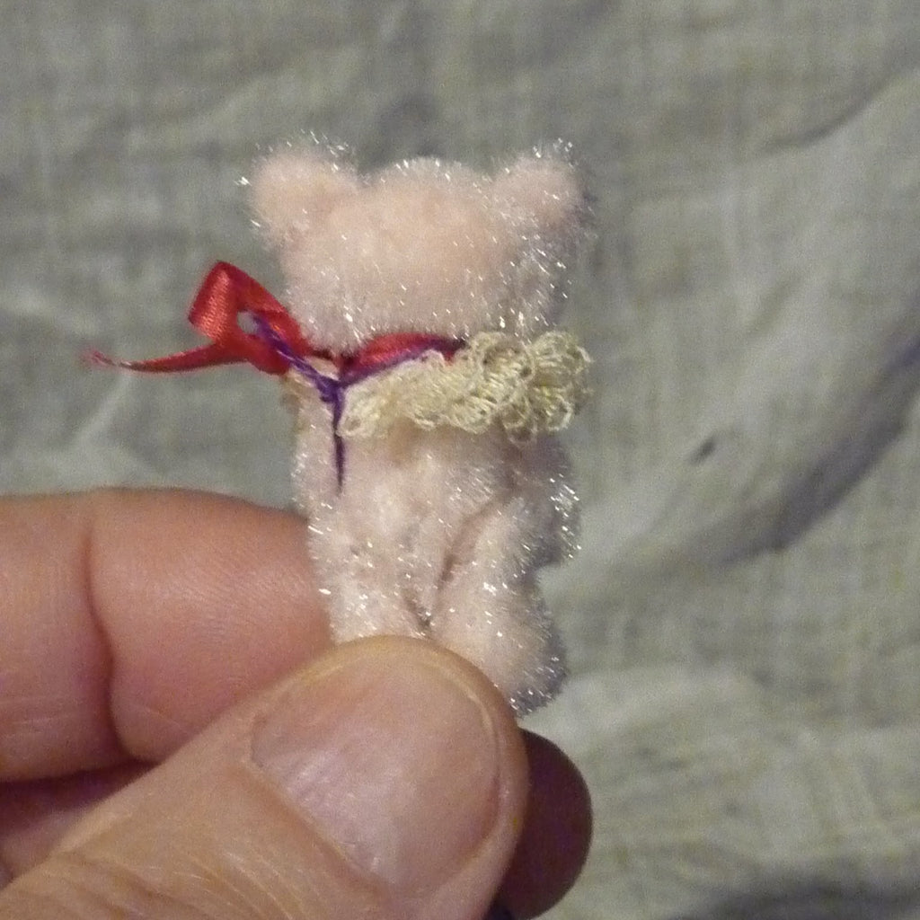 Exquisitely detailed, this tiny, tiny bear is made of short pile, very pale pink velvet plush with onyx bead eyes and white faux suede paw pads. She wears a lace collar and comes with a minute rabbit on button wheels.