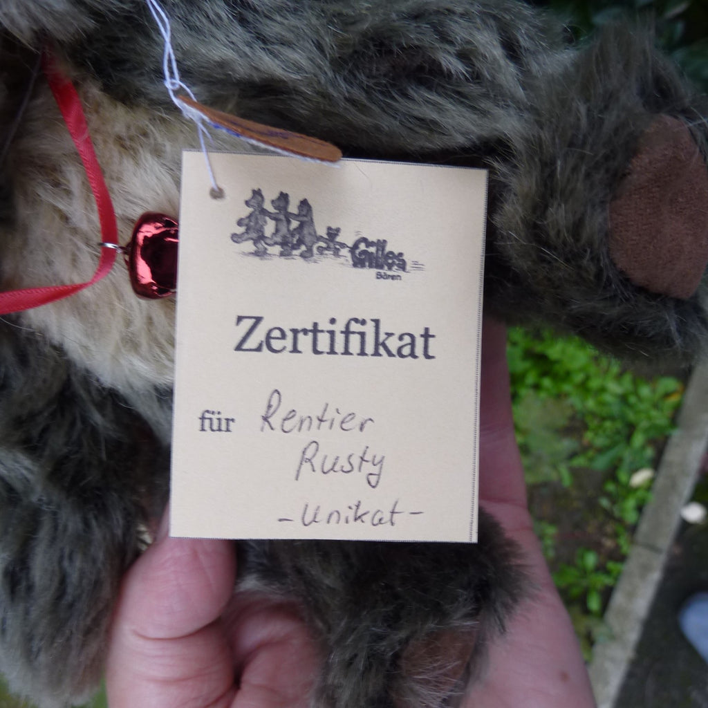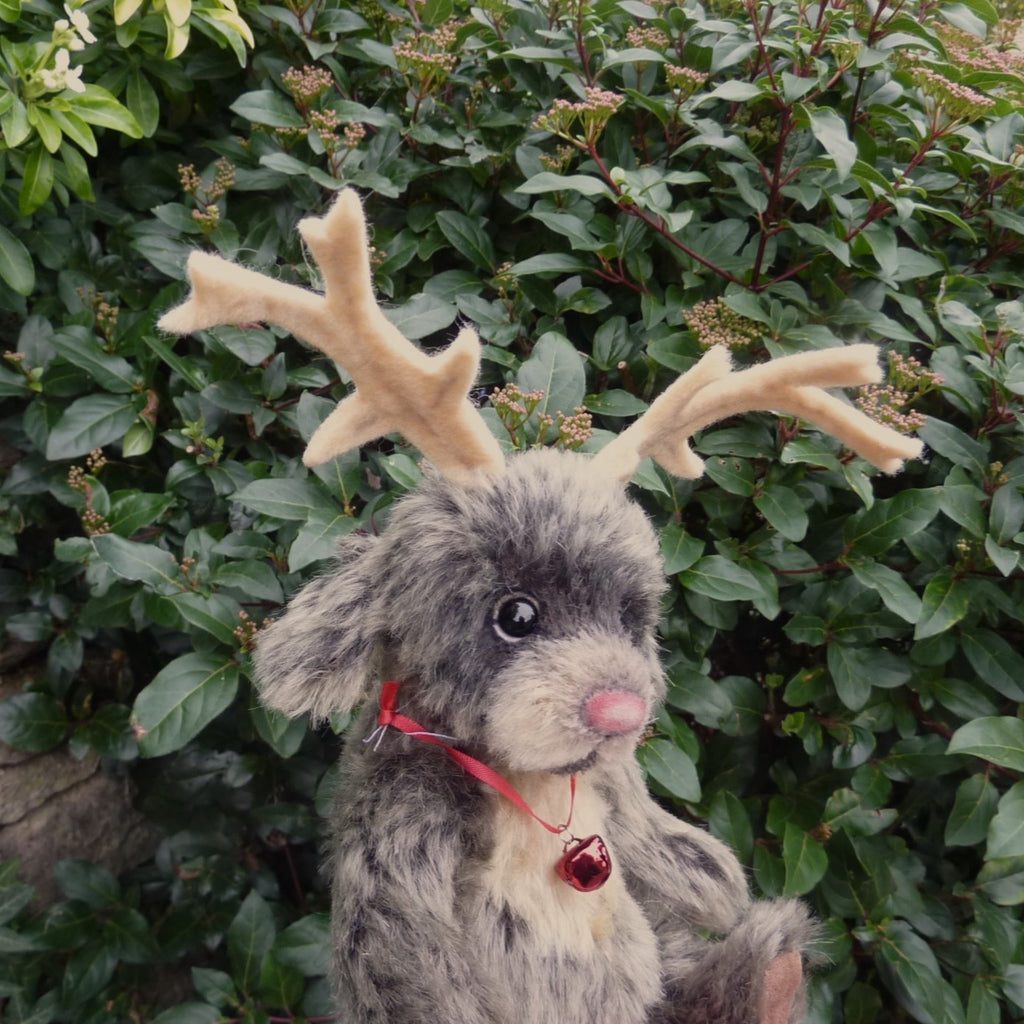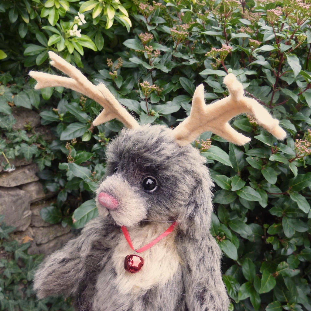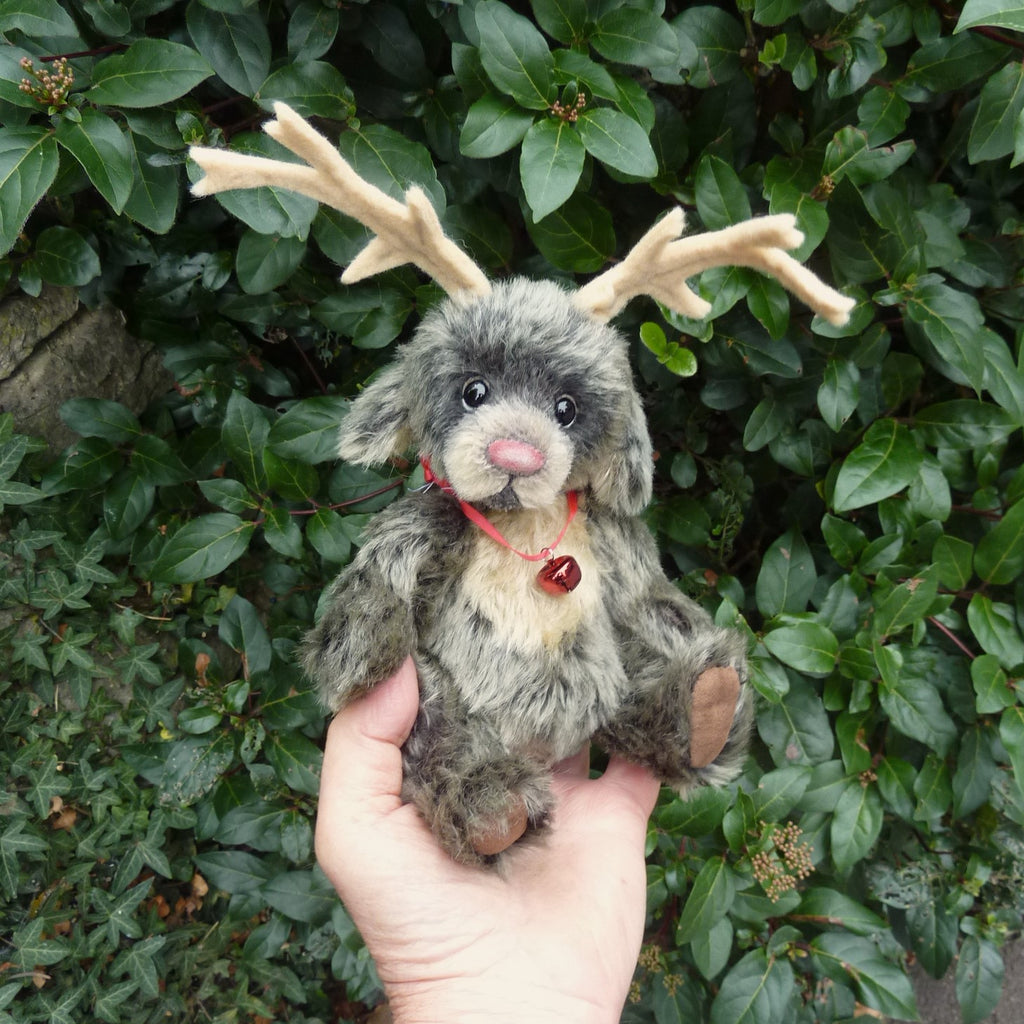 This unusual, small to medium-sized reindeer is made of gently distressed, tipped grey mohair with black glass eyes (with felt behind), an off-white alpaca muzzle, a suedine nose and foot pads, a beige mohair chest and felt antlers. Filled with polyfibre and weighted with mineral granules, Rusty wears a red bell pendant.