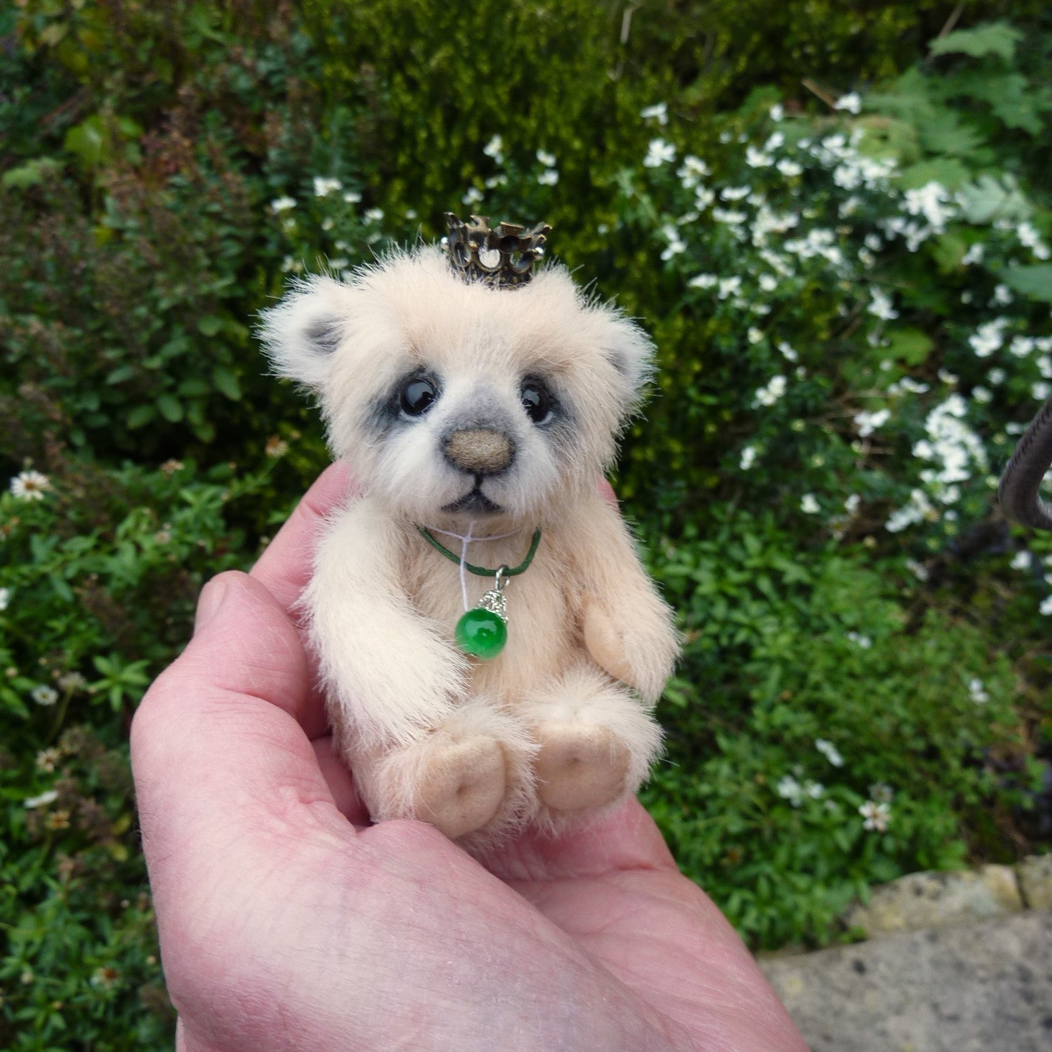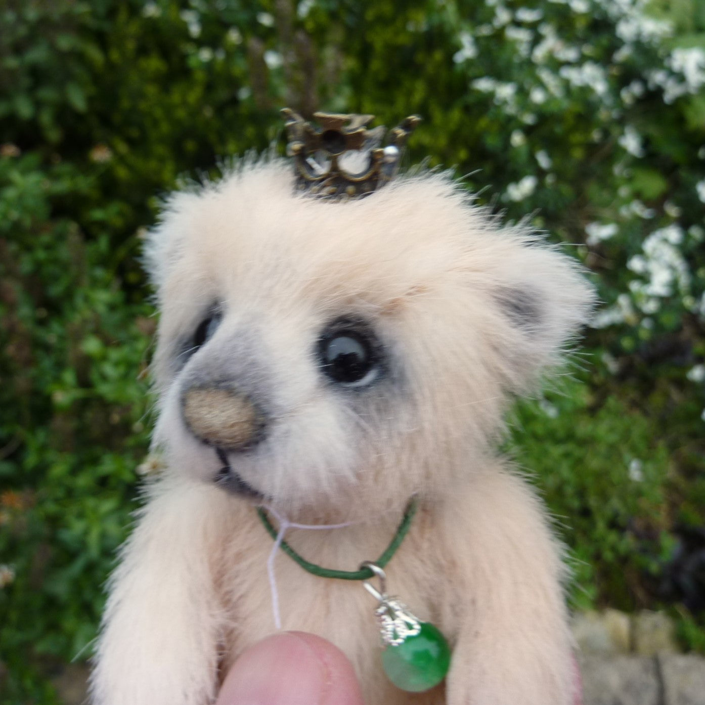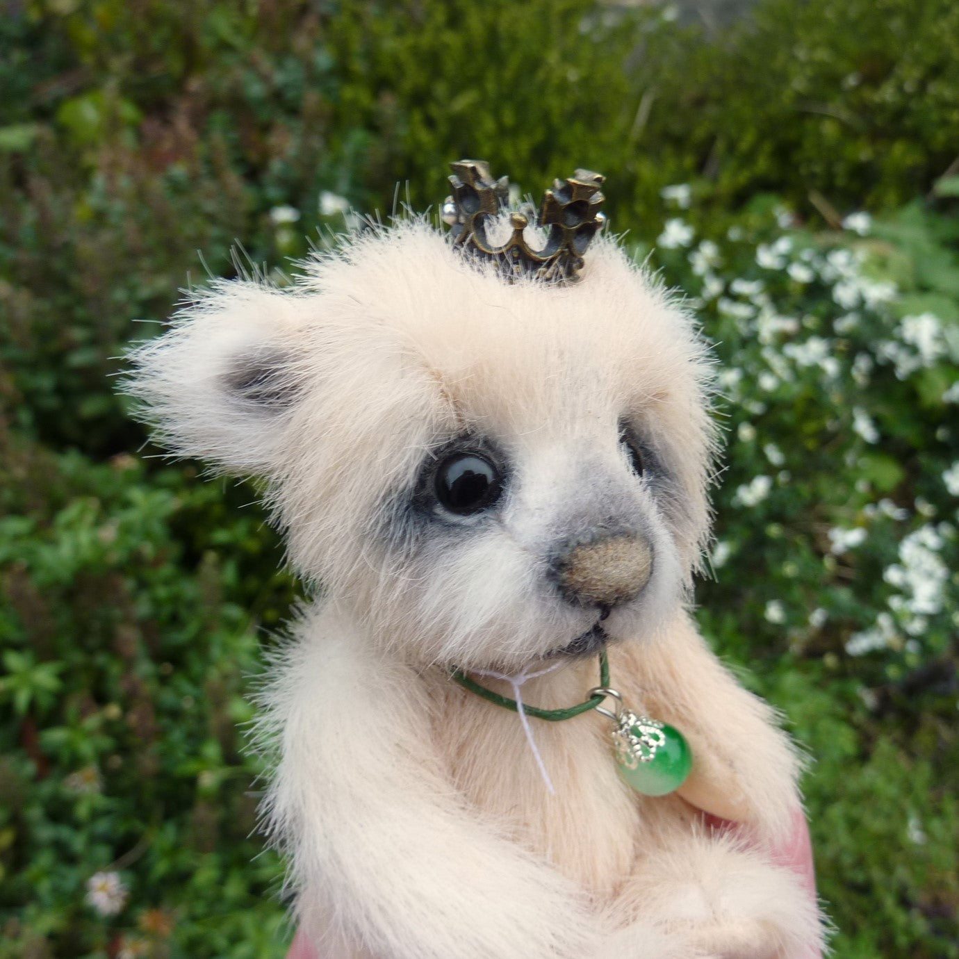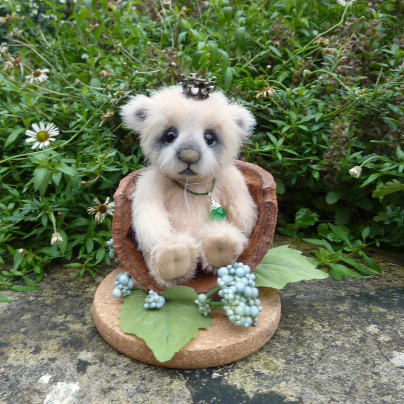 This lovely and very little bear is made of soft and dense, high quality, pale beige manmade plush with black glass eyes (with felt behind), hand-painted facial detail and suedine paw pads. Softly filled with polyfibre and weighted with mineral granules, Princess Greta wears a (removable) gold crown and a glass bead pendant. She comes with the nut-like throne as in photo.