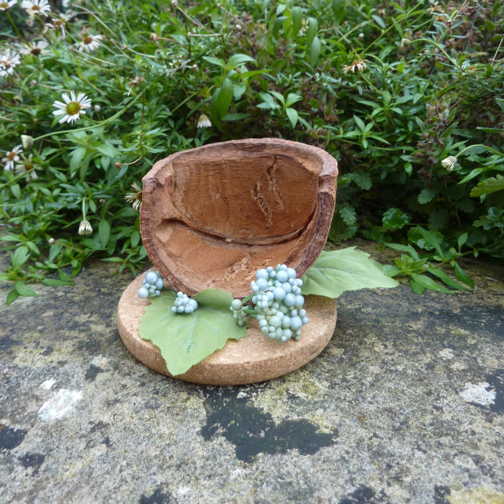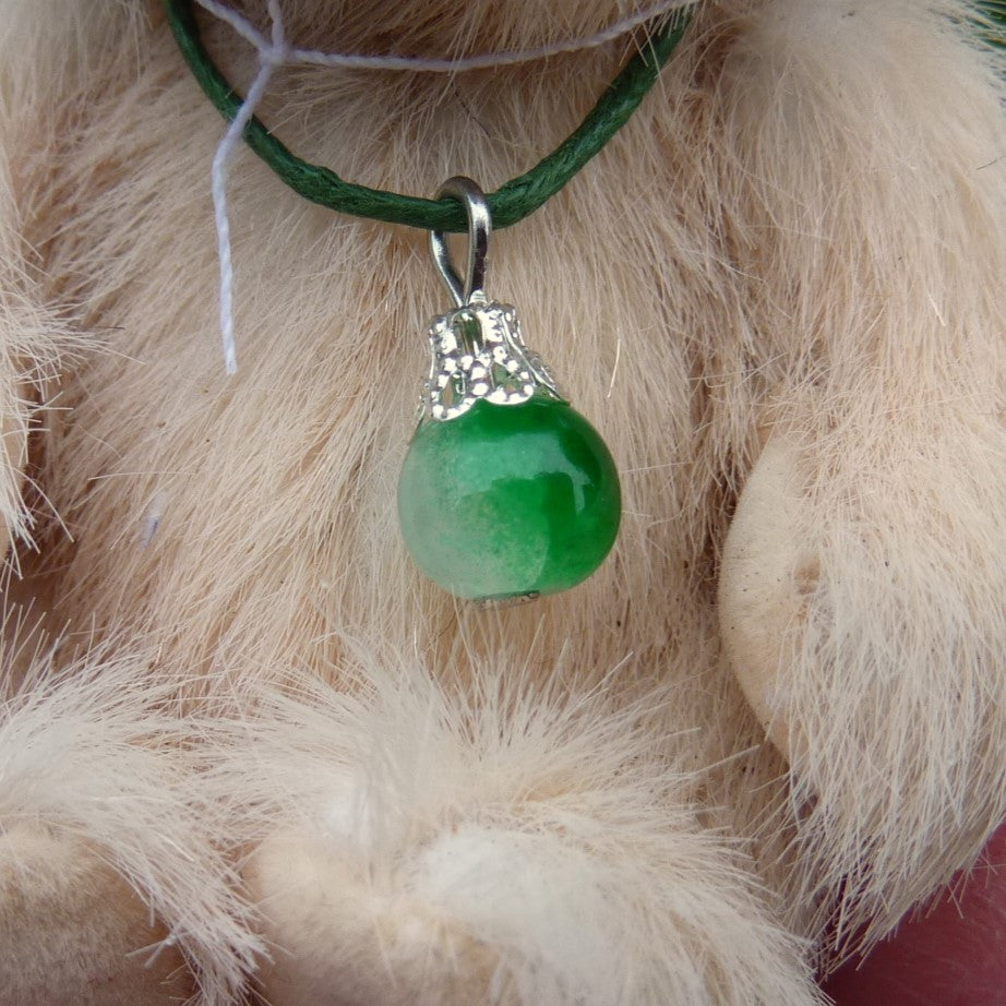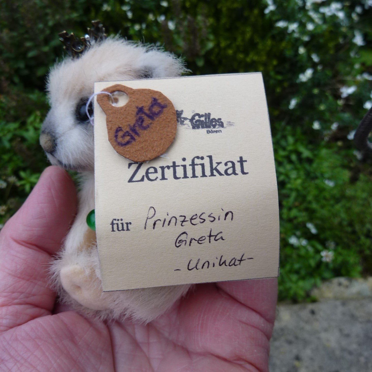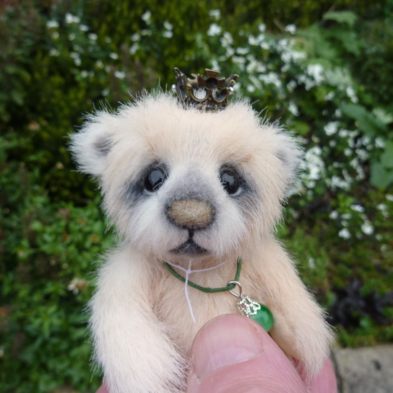 This lovely and very little bear is made of soft and dense, high quality, pale beige manmade plush with black glass eyes (with felt behind), hand-painted facial detail and suedine paw pads. Softly filled with polyfibre and weighted with mineral granules, Princess Greta wears a (removable) gold crown and a glass bead pendant. She comes with the nut-like throne as in photo.