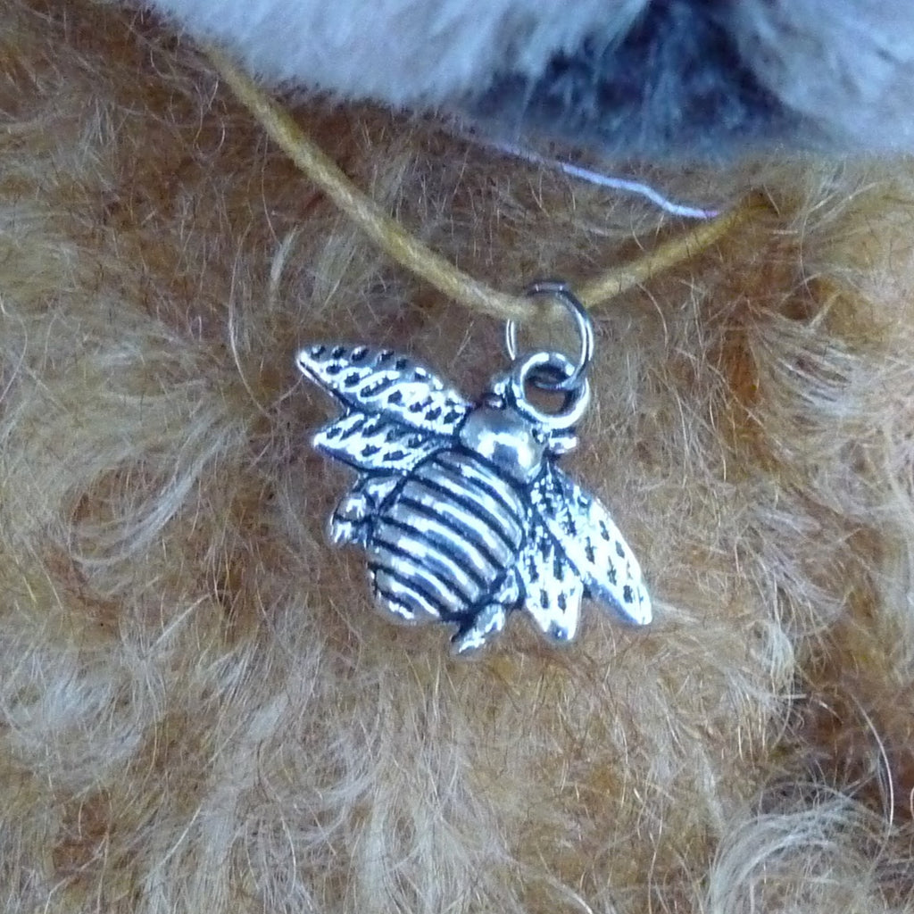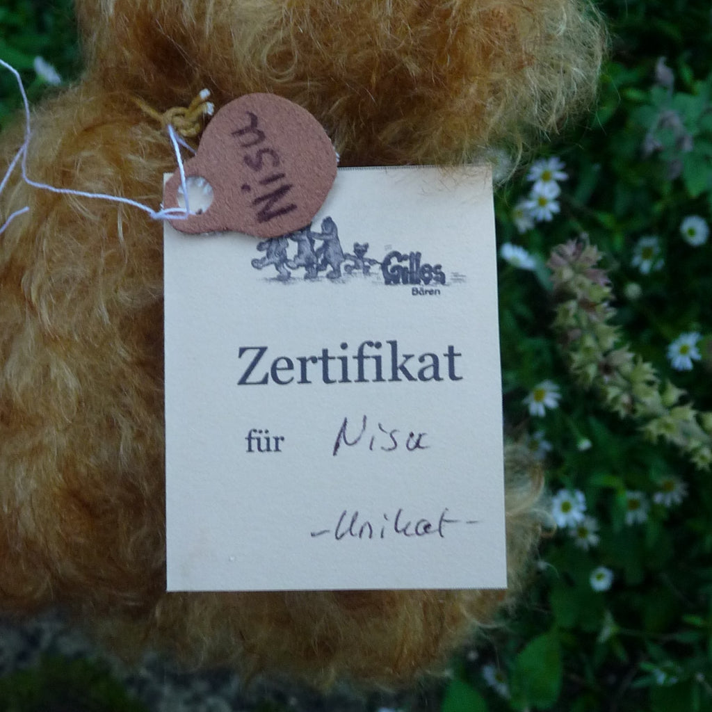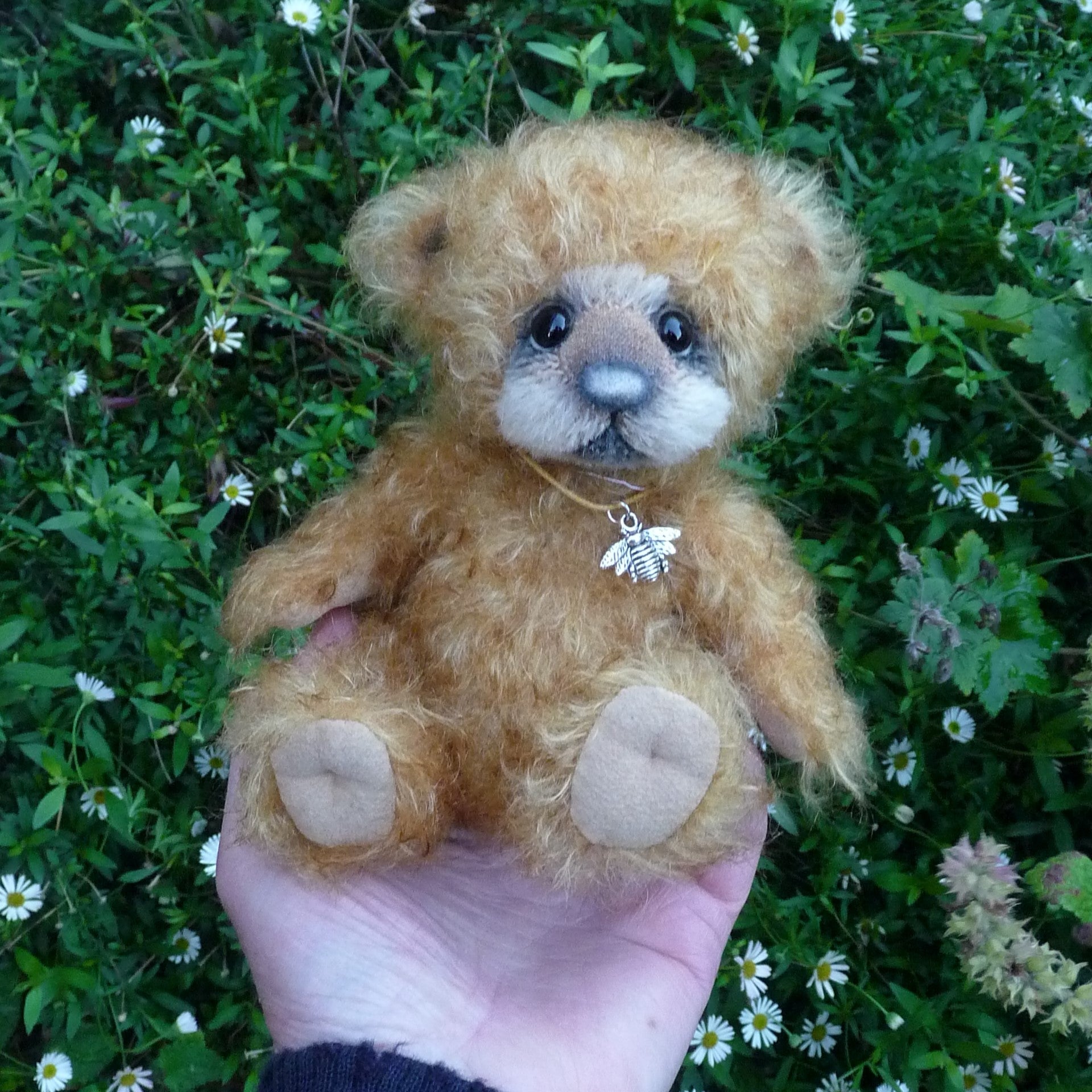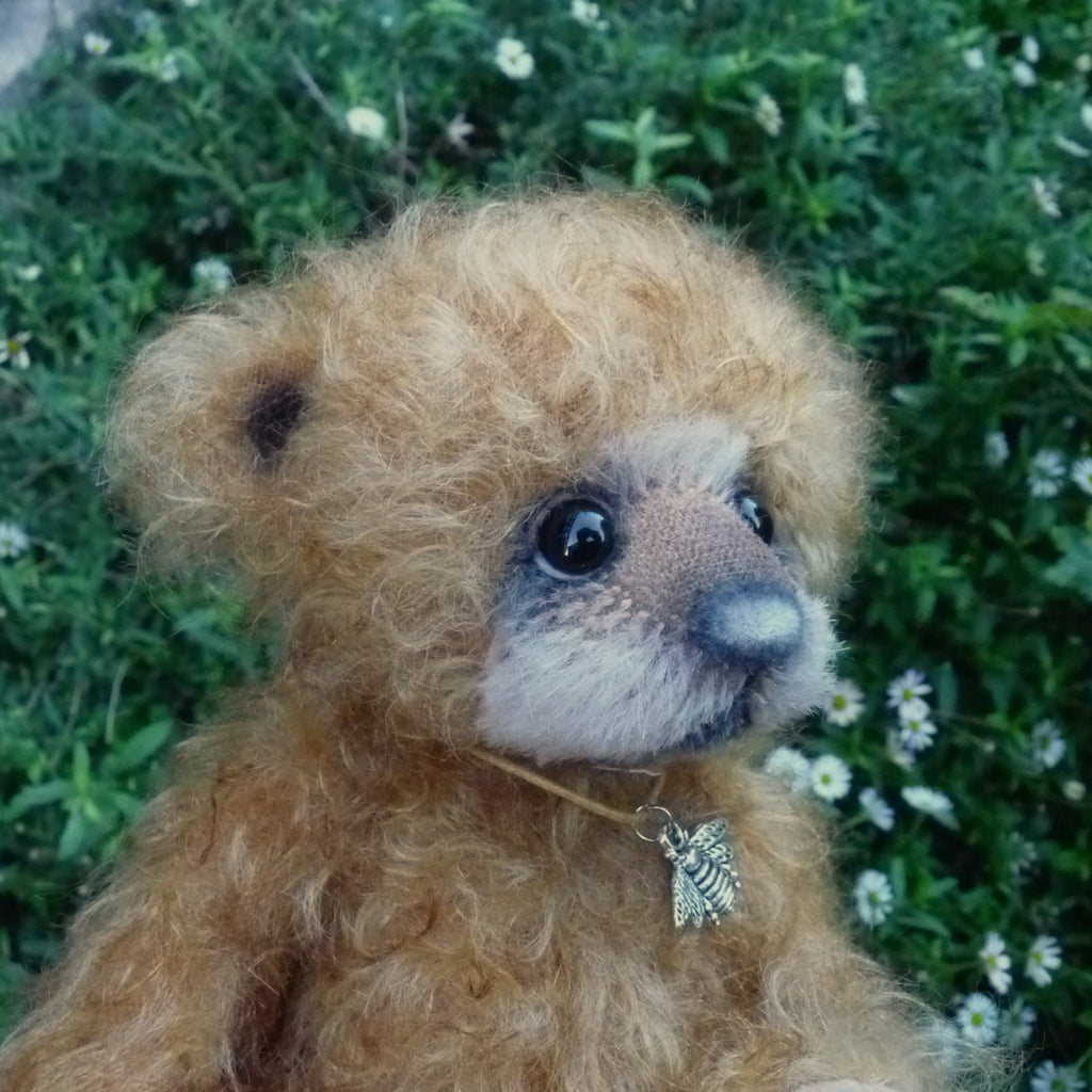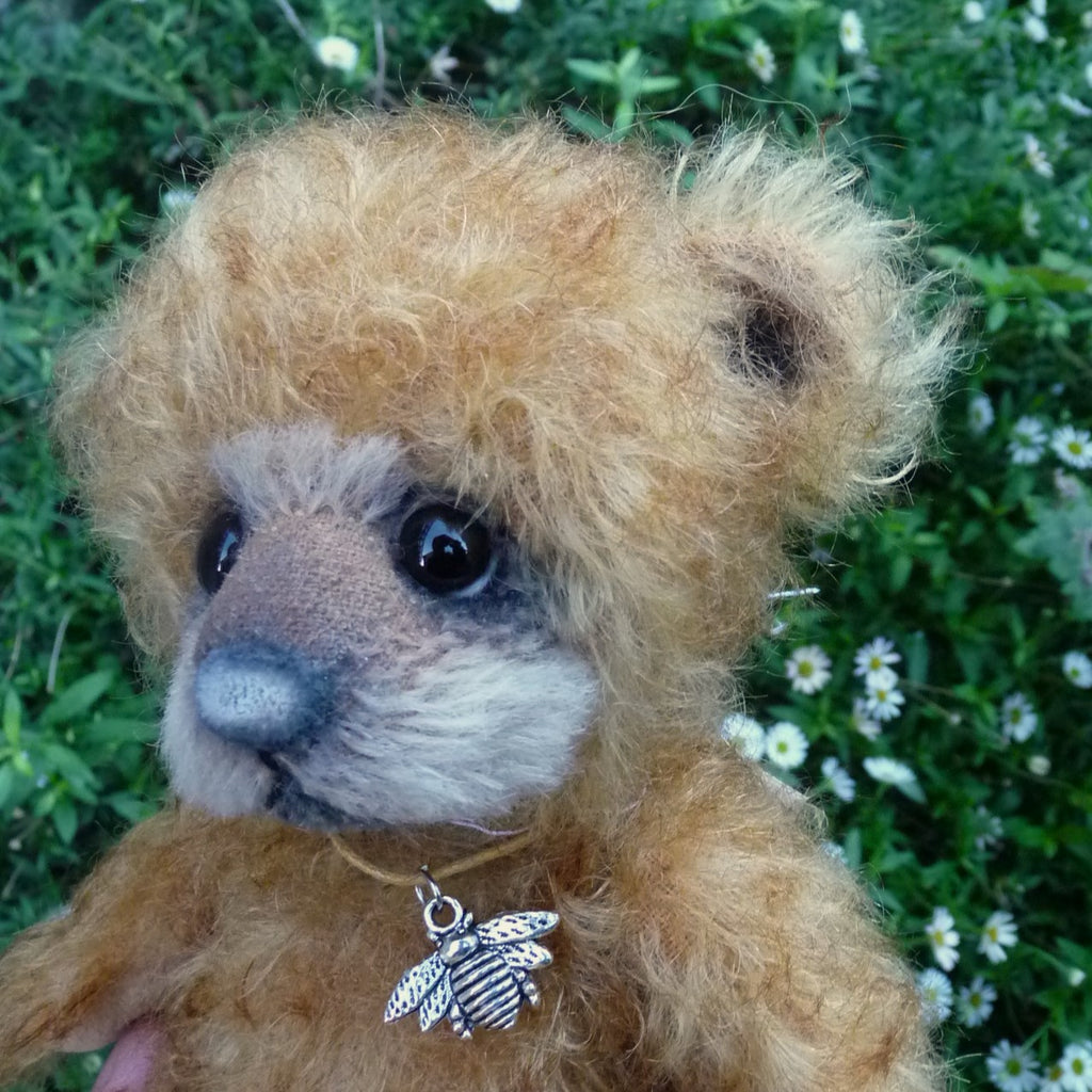 This small and very, very lovely bear is made of wavy and distressed, brown-tipped, gold mohair with a black glass eyes (with felt behind), a suedine nose and foot pads, an alpaca muzzle and subtle airbrushed facial detail. Softly filled with polyfibre and weighted with mineral granules, Nisu wears a bee pendant.