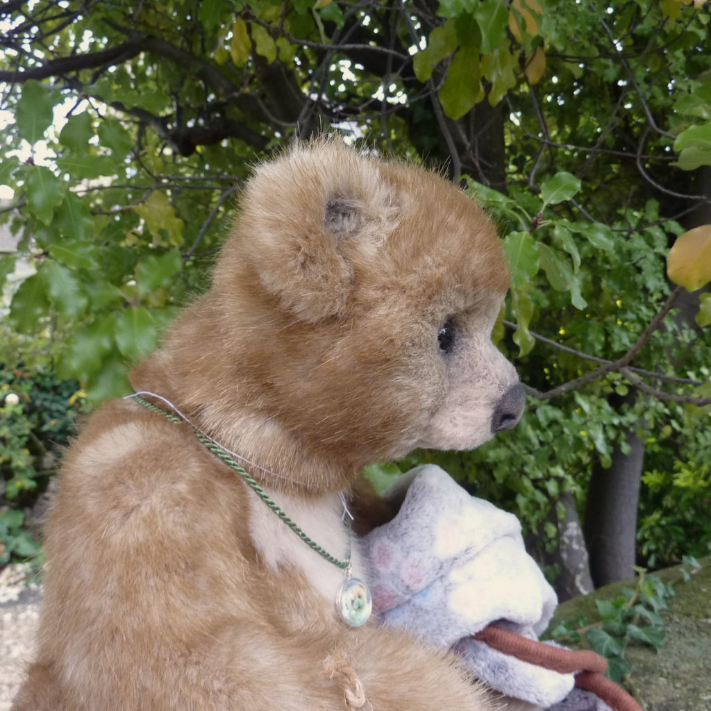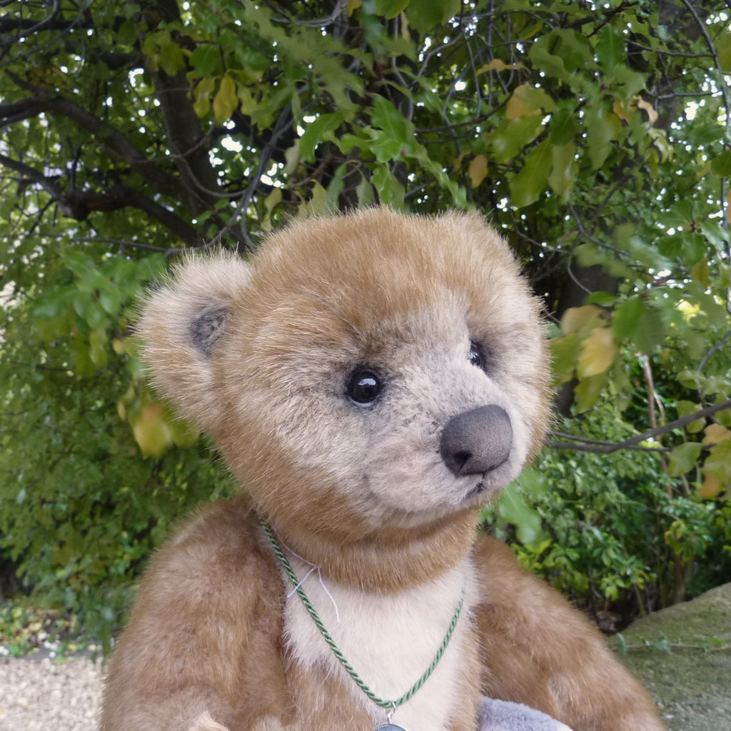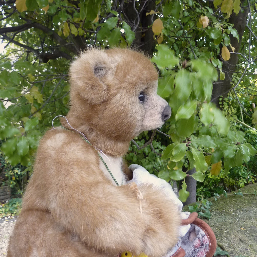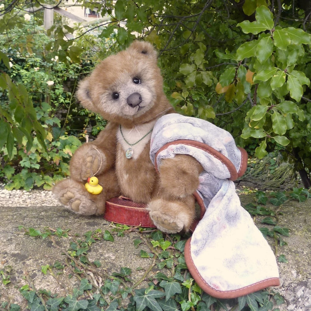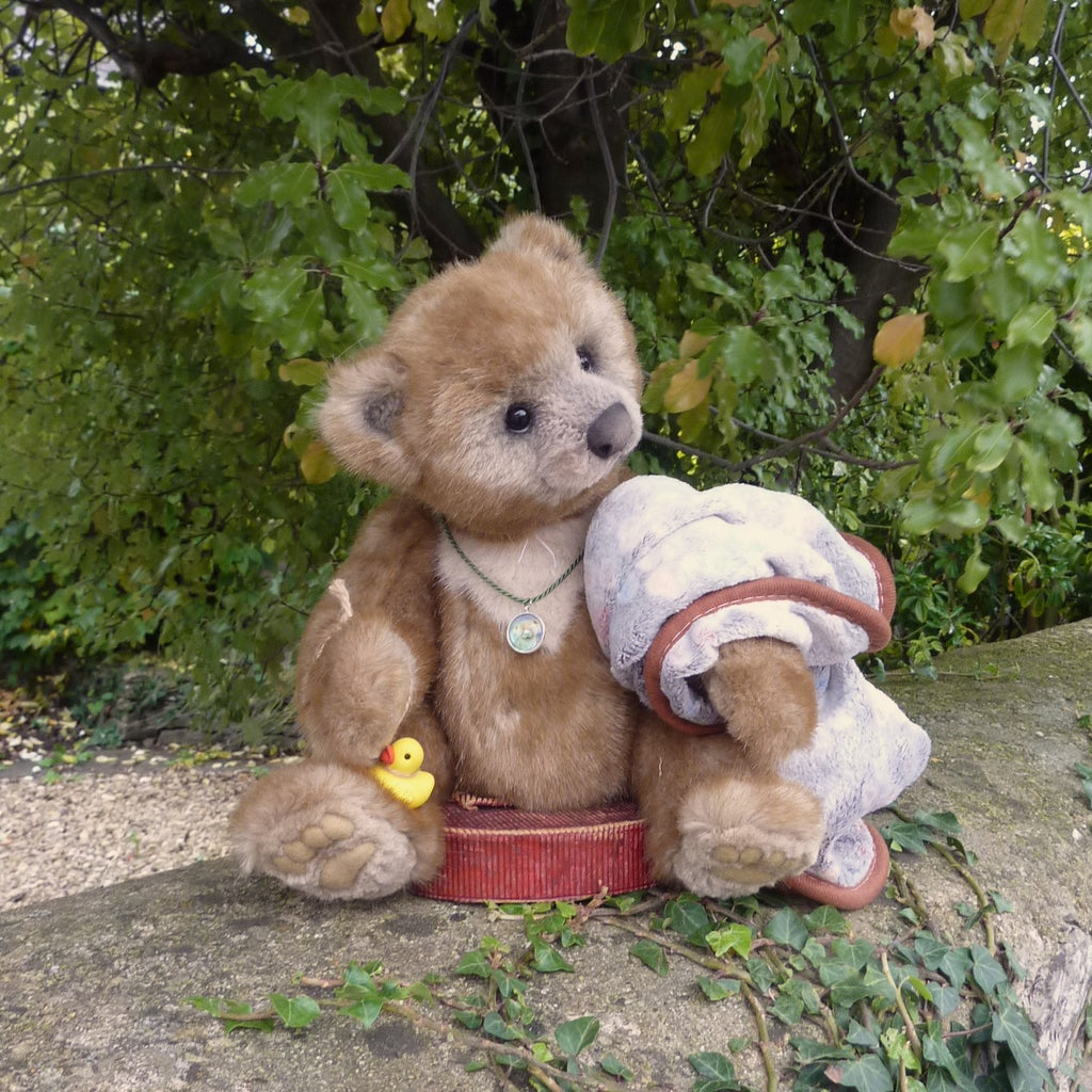 This large and finely detailed bear is made of soft, long pile, brown-tipped beige manmade plush with an alpaca muzzle and chest, black glass eyes, a moulded faux suede nose, wired arms and stitch-sculpted suede paw pads. Further details are his neck (jointed both at the top and bottom) and intricately stitch-sculpted paw pads.. Softly filled with polyfibre and weighted with mineral granules, this fine quality bear wears a cameo pendant, and comes with a miniature rubber duck and a soft plush comforter.