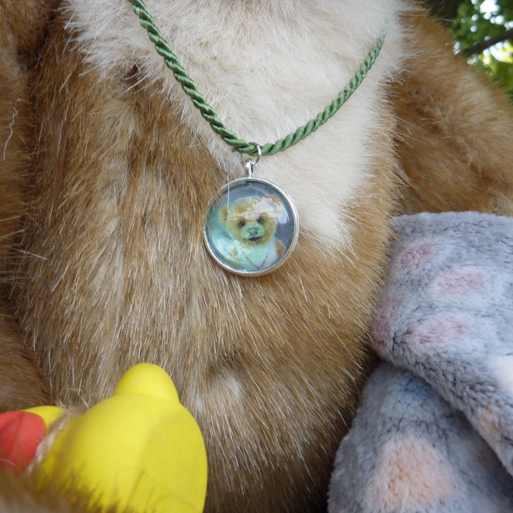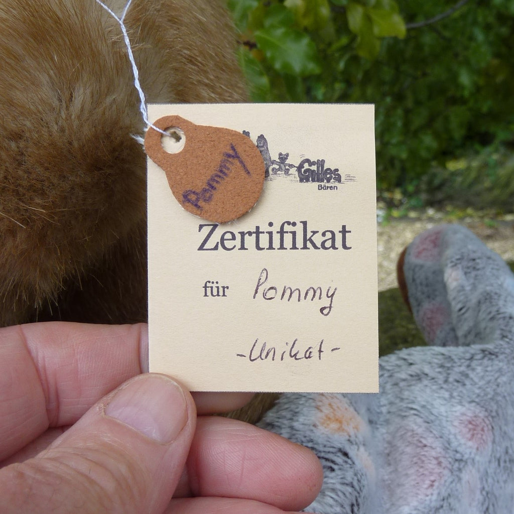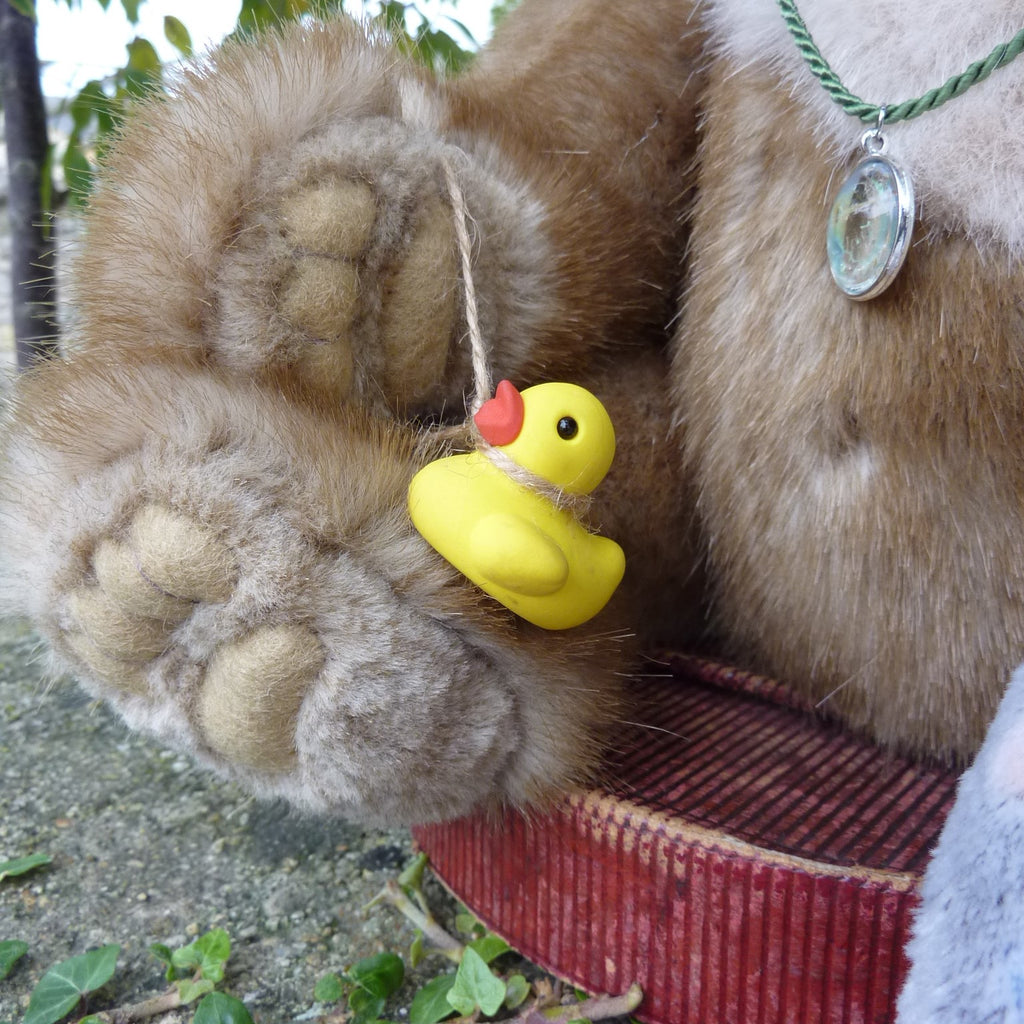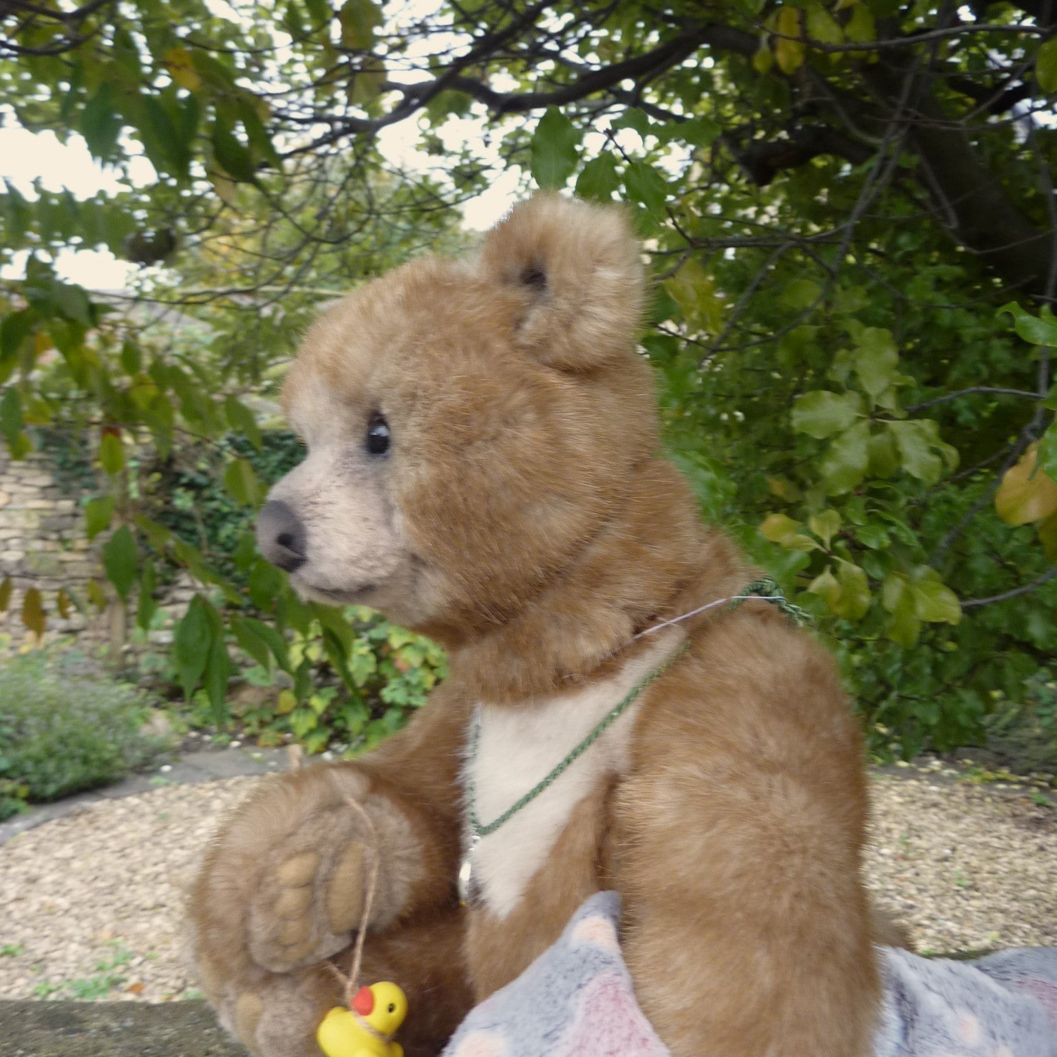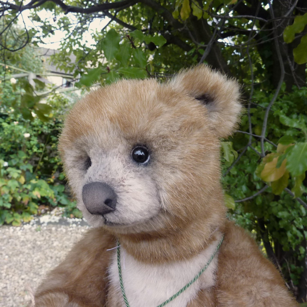 This large and finely detailed bear is made of soft, long pile, brown-tipped beige manmade plush with an alpaca muzzle and chest, black glass eyes, a moulded faux suede nose, wired arms and stitch-sculpted suede paw pads. Further details are his neck (jointed both at the top and bottom) and intricately stitch-sculpted paw pads.. Softly filled with polyfibre and weighted with mineral granules, this fine quality bear wears a cameo pendant, and comes with a miniature rubber duck and a soft plush comforter.