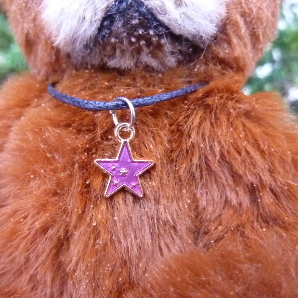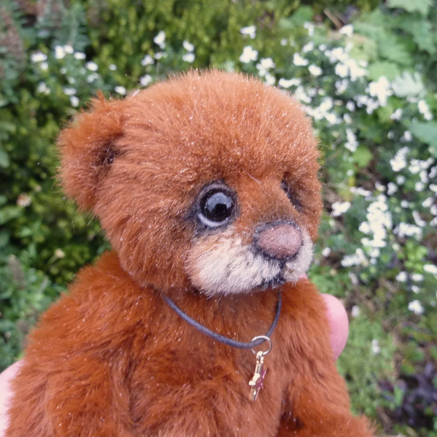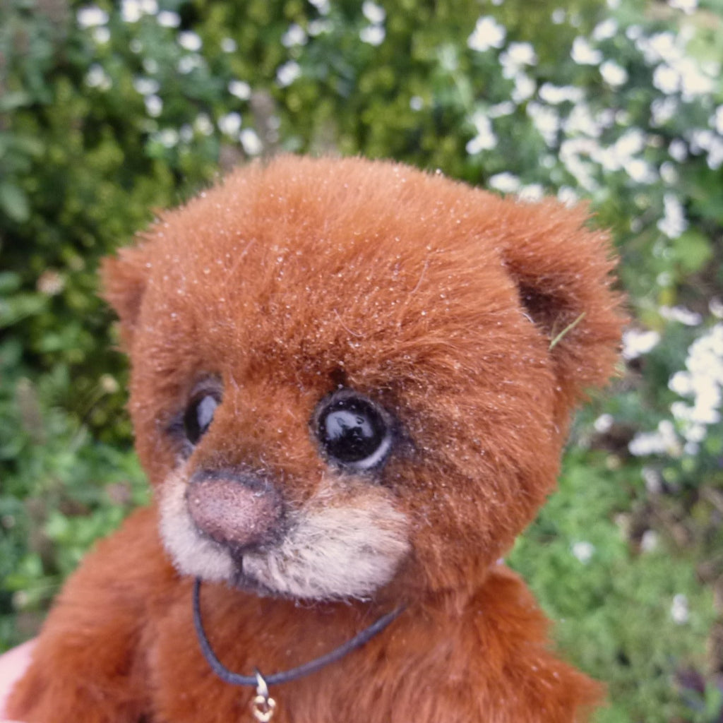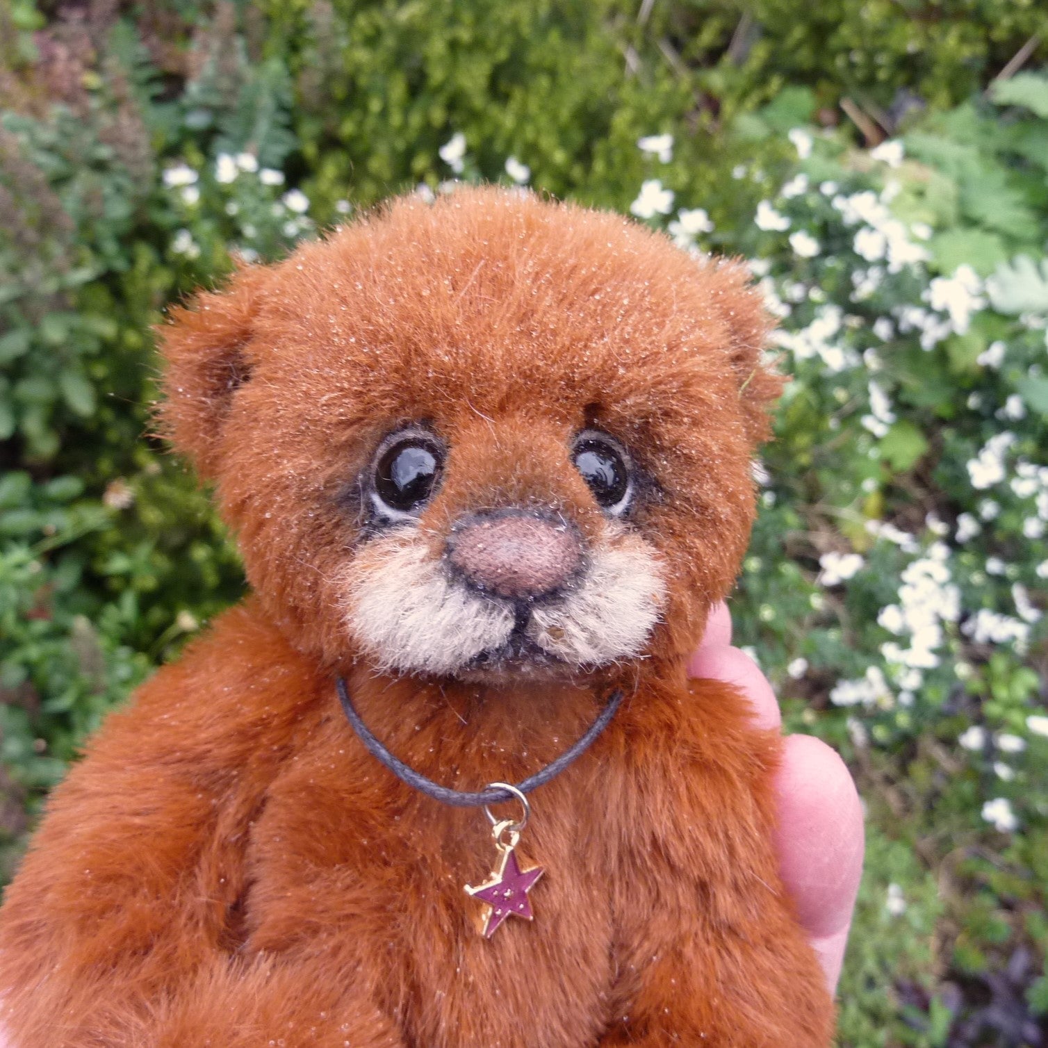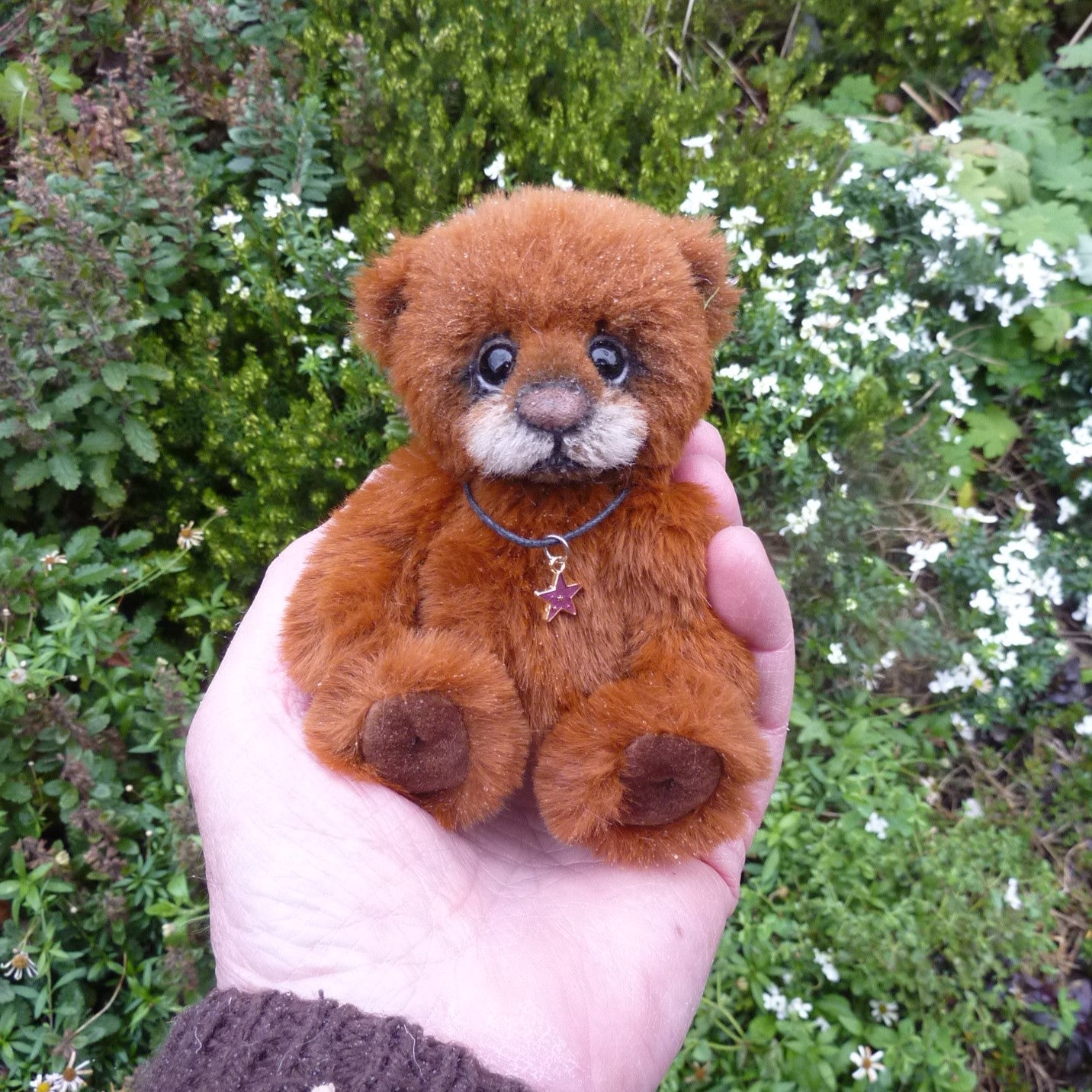 This lovely baby bear is made of ultra-soft, long pile, manmade, dark cinnamon plush with an alpaca muzzle, felted, black glass eyes, and faux suede paw pads. Softly filled with polyfibre and weighted with mineral granules, he wears a star pendant.