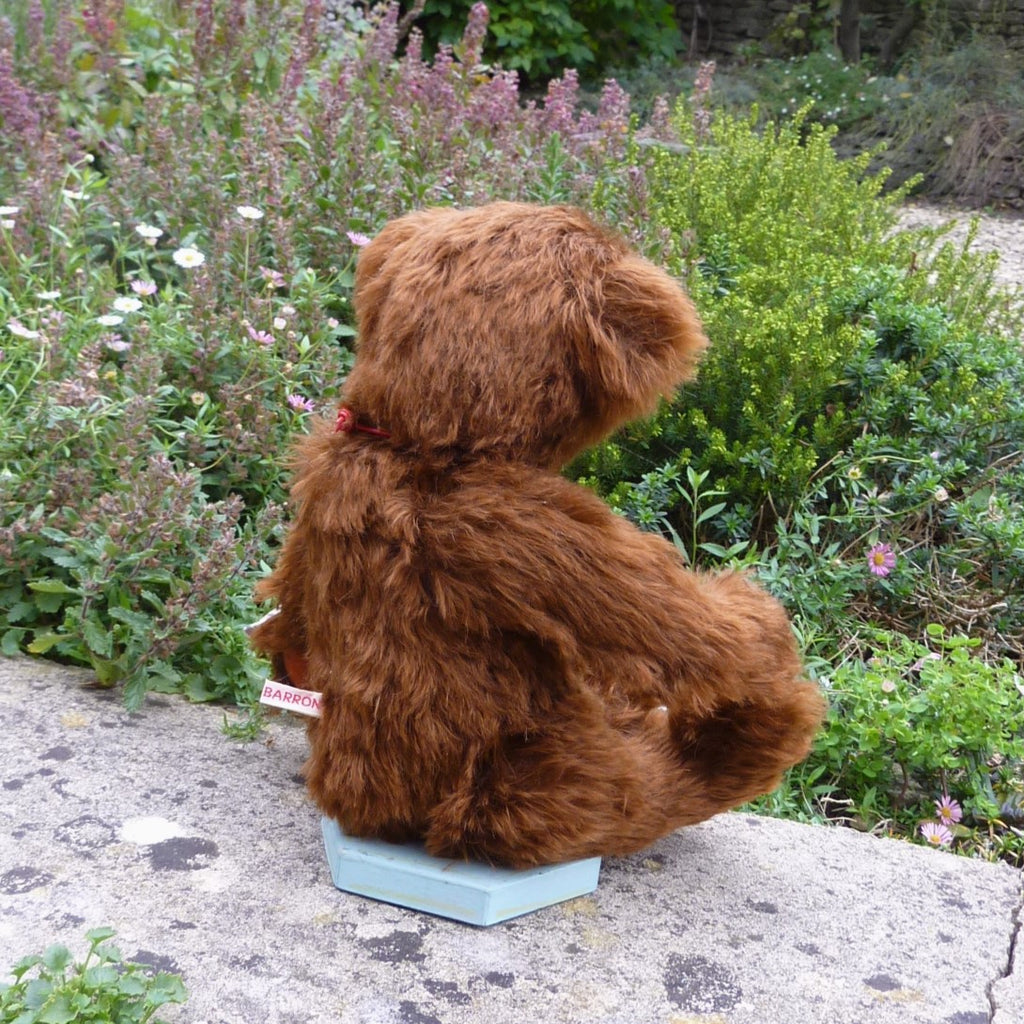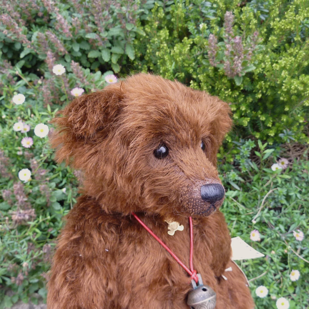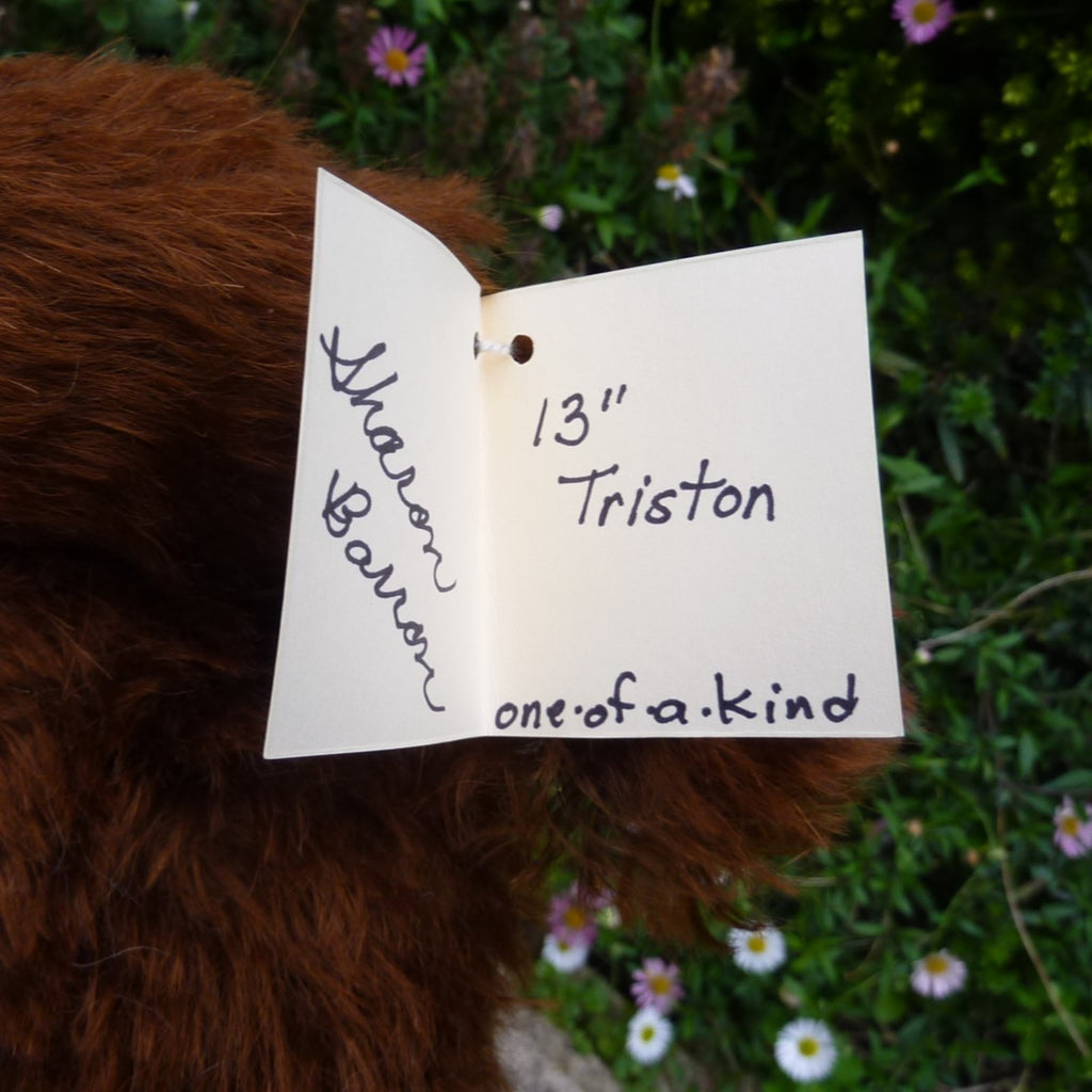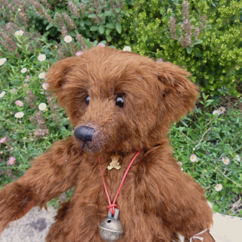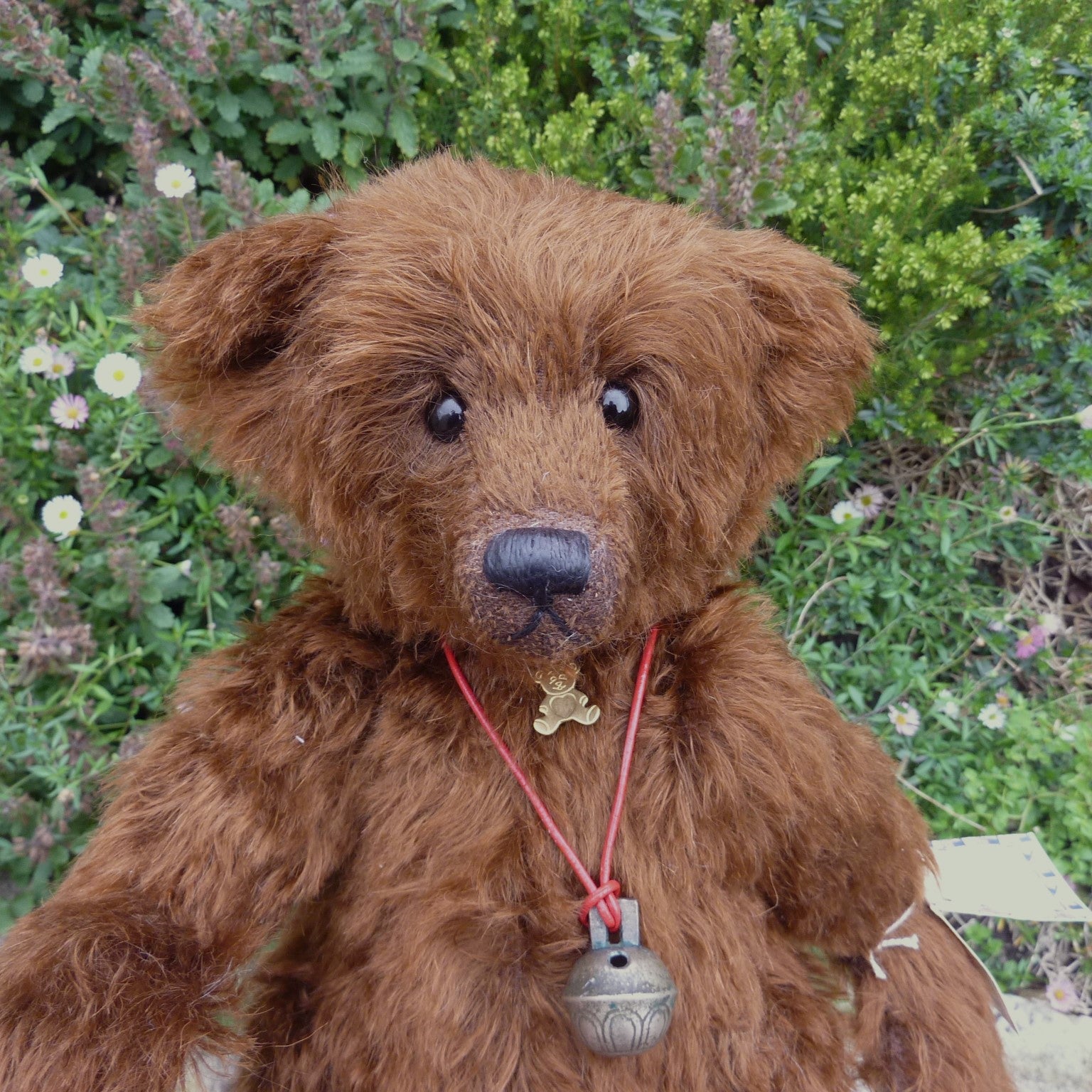 Made of distressed, long pile, dark chocolate mohair, this appealing, medium-sized bear has black glass eyes, a waxed thread nose and airbrushed detail on the edges of his felt paw pads. Softly filled and weighted with glass beads, Triston wears a brass, vintage-style sleigh bell pendant.