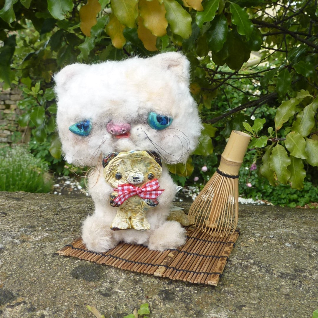 This naive-style cat is made of soft, aged and tie-dyed, mottled light brown and white viscose. Hisa has made and painted the resin eyes, nose and mouth. He has long and curly whiskers and clasps a resin Sooty-type bear, sculpted and painted by Hisa. He is softly filled with wood shavings and weighted with steel shot.