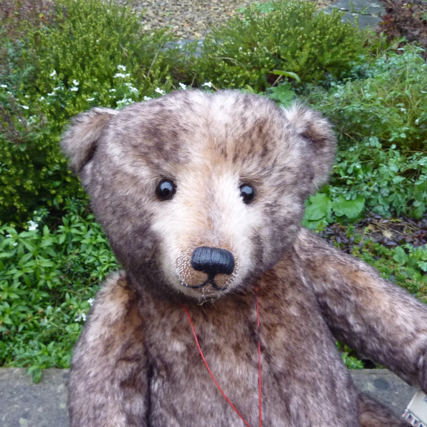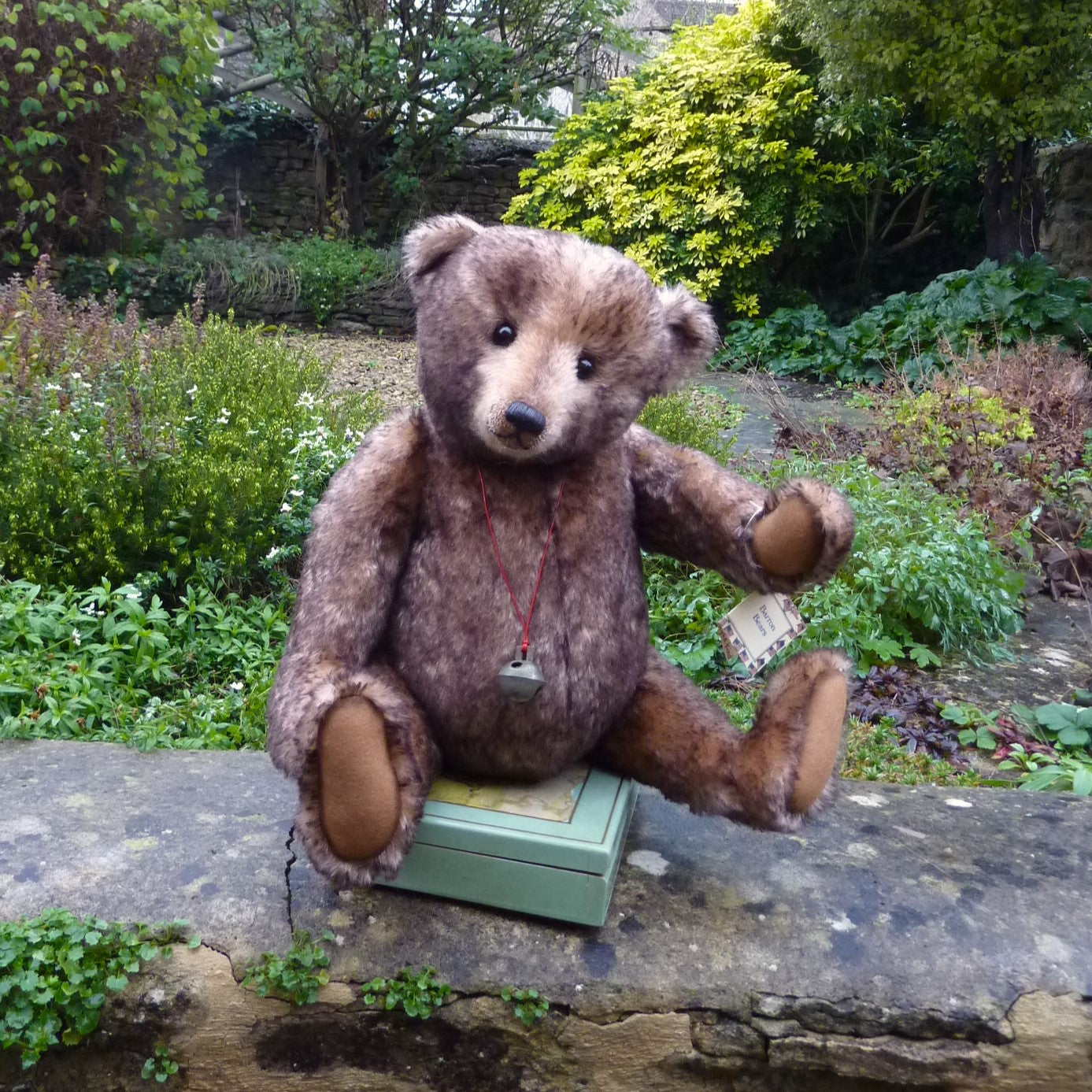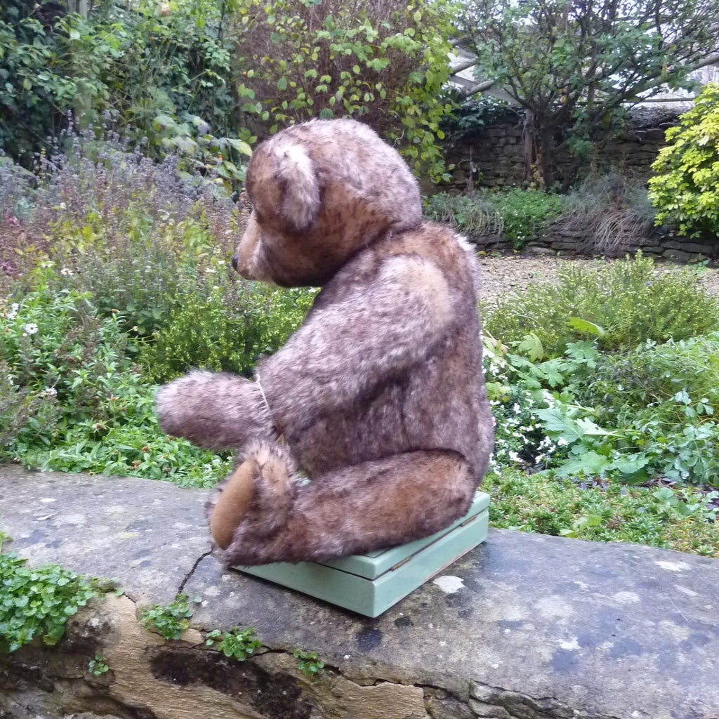 This large, rotund and highly appealing bear is made of brown-tipped, pale caramel mohair with a centre seam head, black glass eyes, a waxed nose and careful shading on the edges of his felt paws. Filled with polyfibre, and weighted with glass beads, he wears a vintage sleigh bell pendant. (If sold to a non-UK buyer, there will be a £45 surcharge towards the high volumetric weight cost of airmail postage.)
