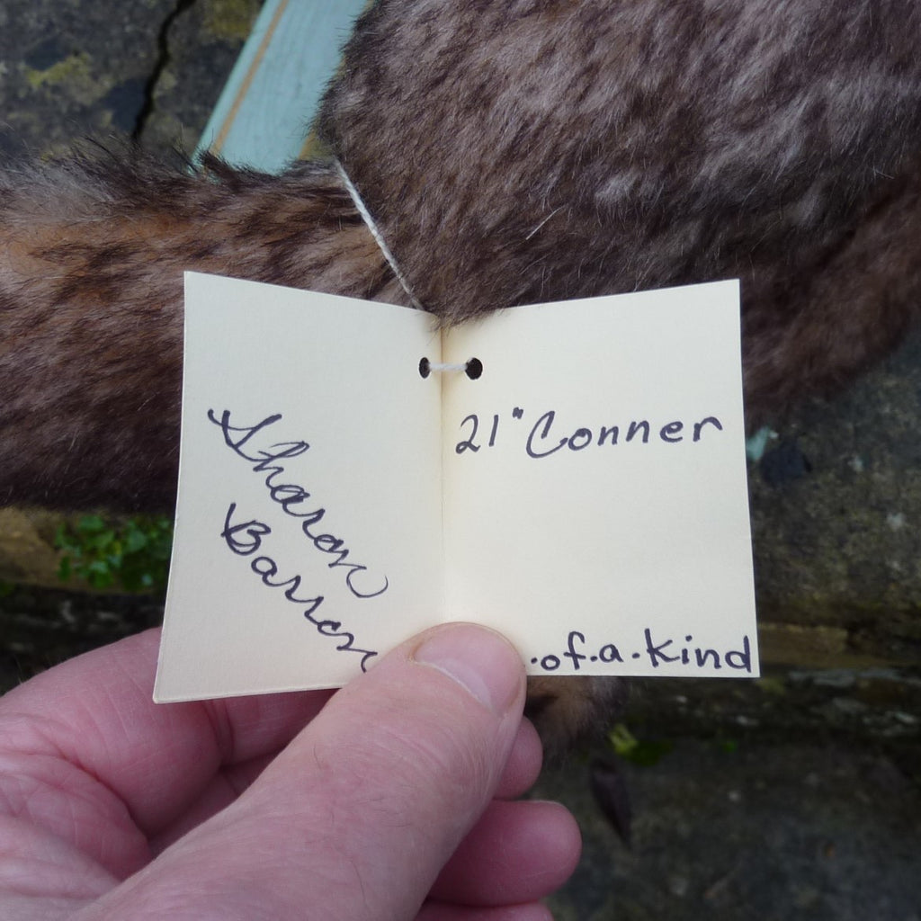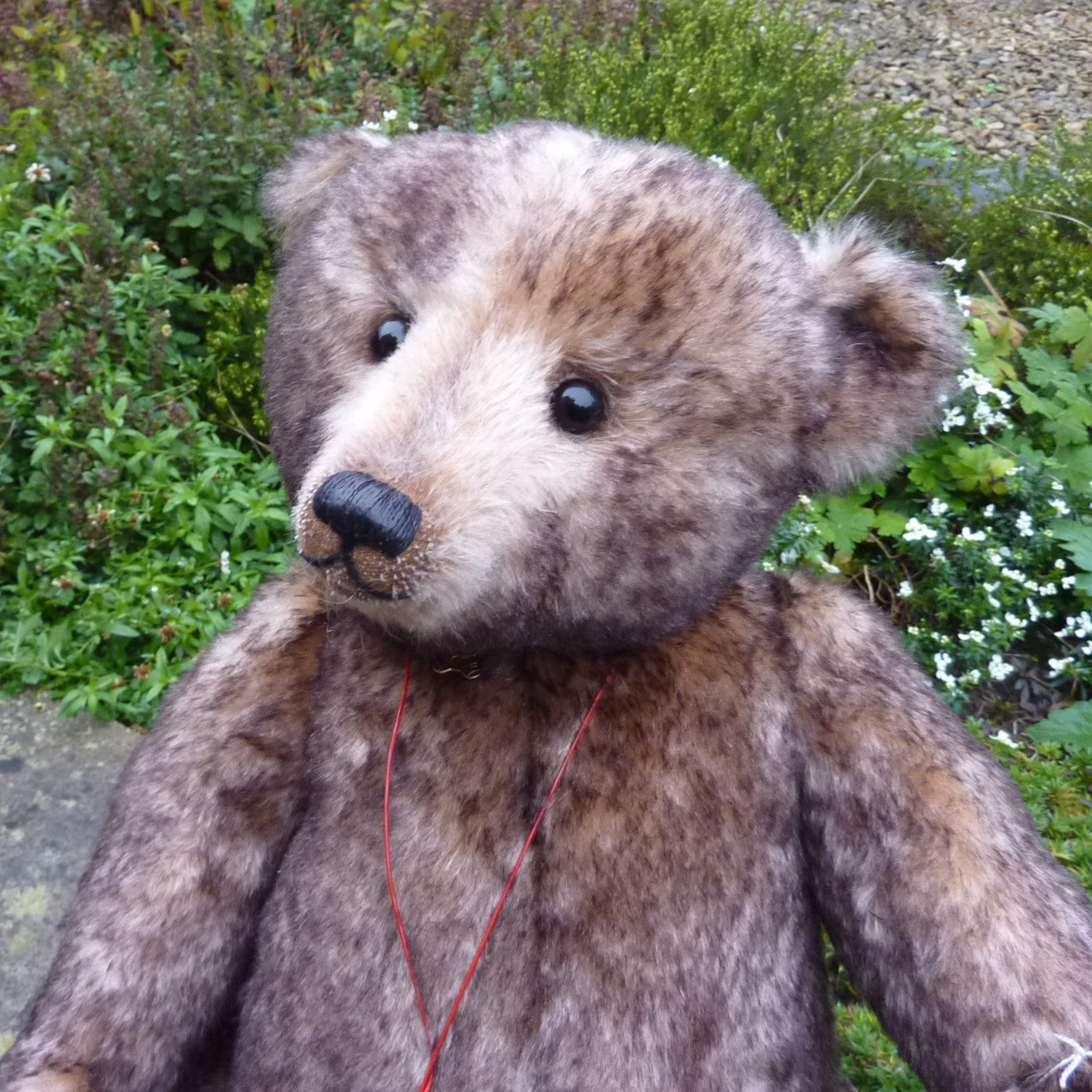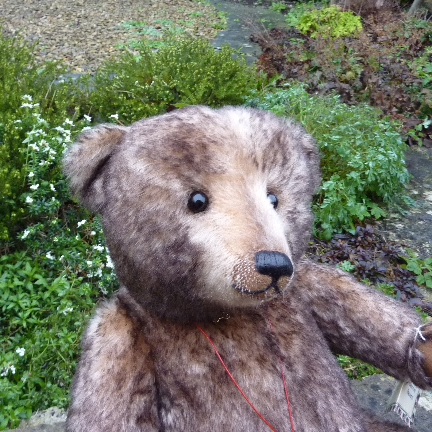 This large, rotund and highly appealing bear is made of brown-tipped, pale caramel mohair with a centre seam head, black glass eyes, a waxed nose and careful shading on the edges of his felt paws. Filled with polyfibre, and weighted with glass beads, he wears a vintage sleigh bell pendant. (If sold to a non-UK buyer, there will be a £45 surcharge towards the high volumetric weight cost of airmail postage.)
