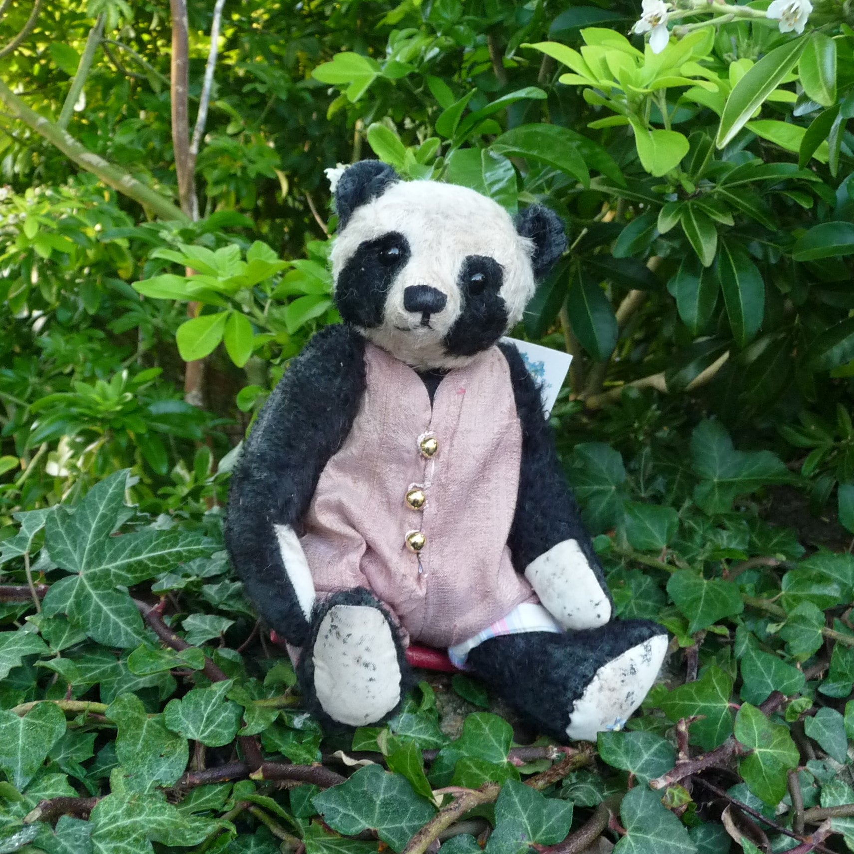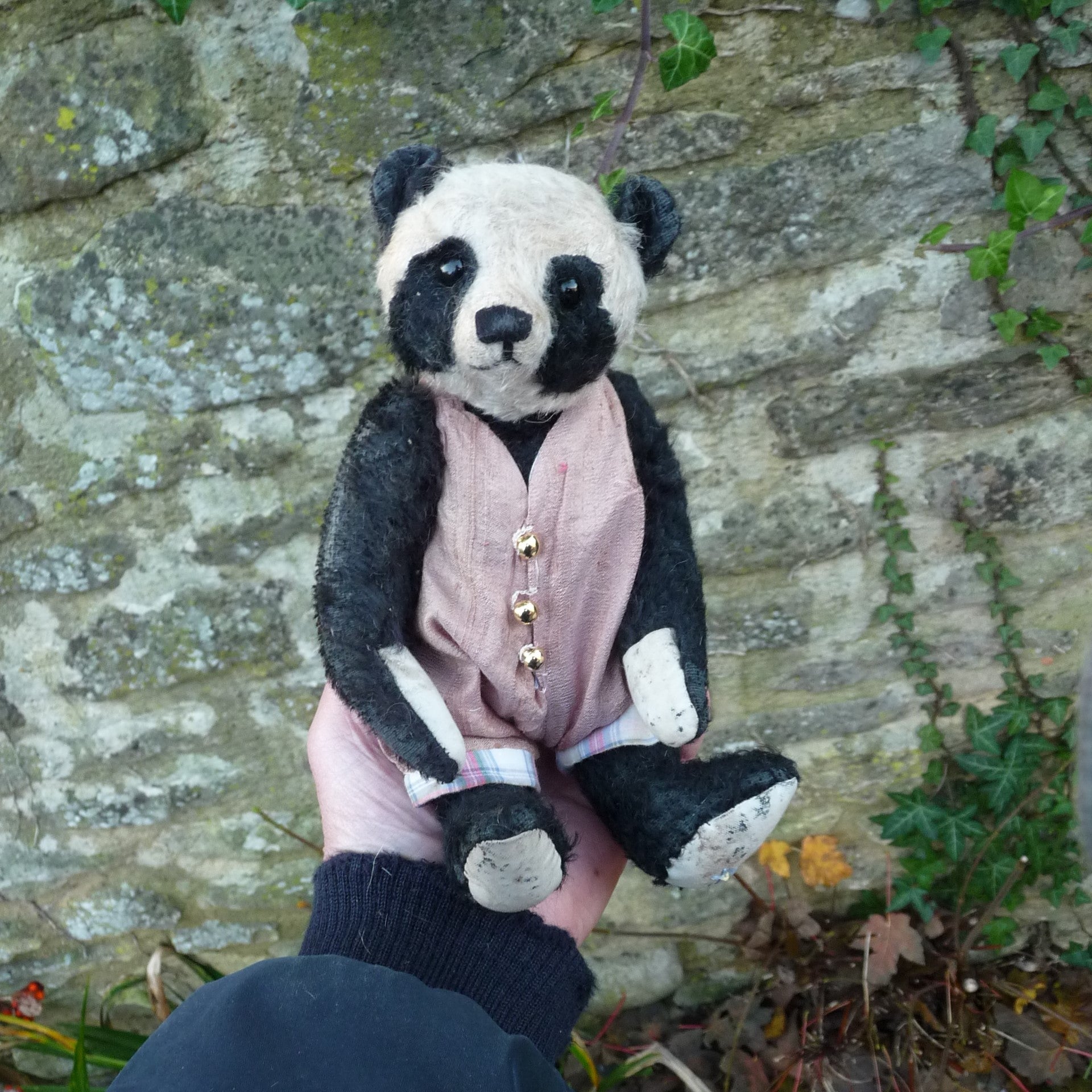 This small, old and inquisitive-looking panda is made of sparse, distressed and hand-plucked, black and off-white mohair with black glass eyes and aged linen paw pads. Filled with a mixture of wood shavings and mineral granules, Spindalin wears a (removable) raw silk romper suit.