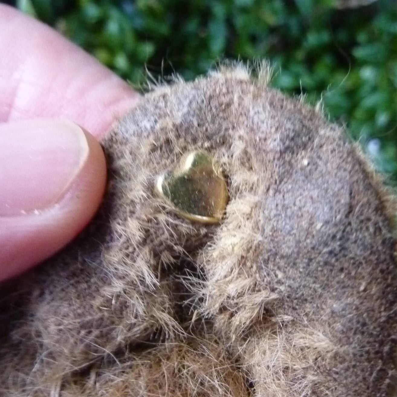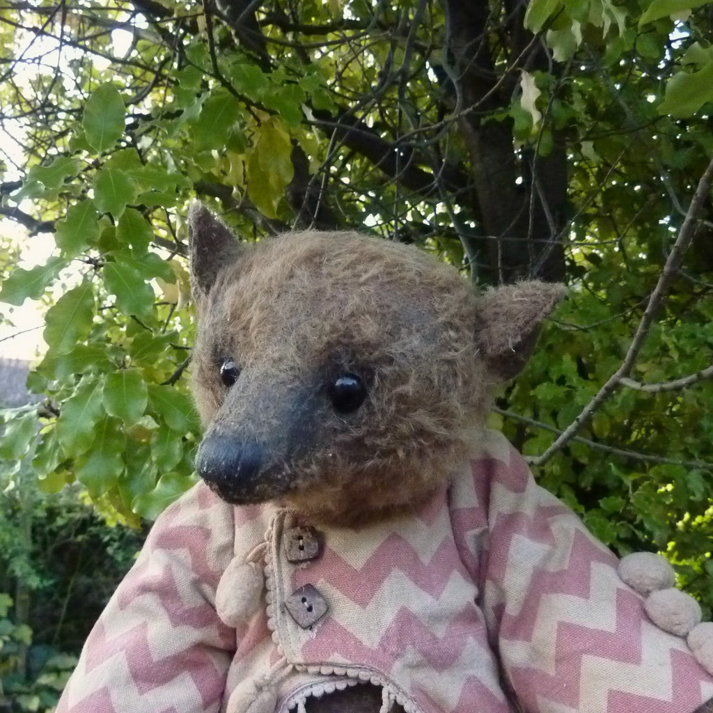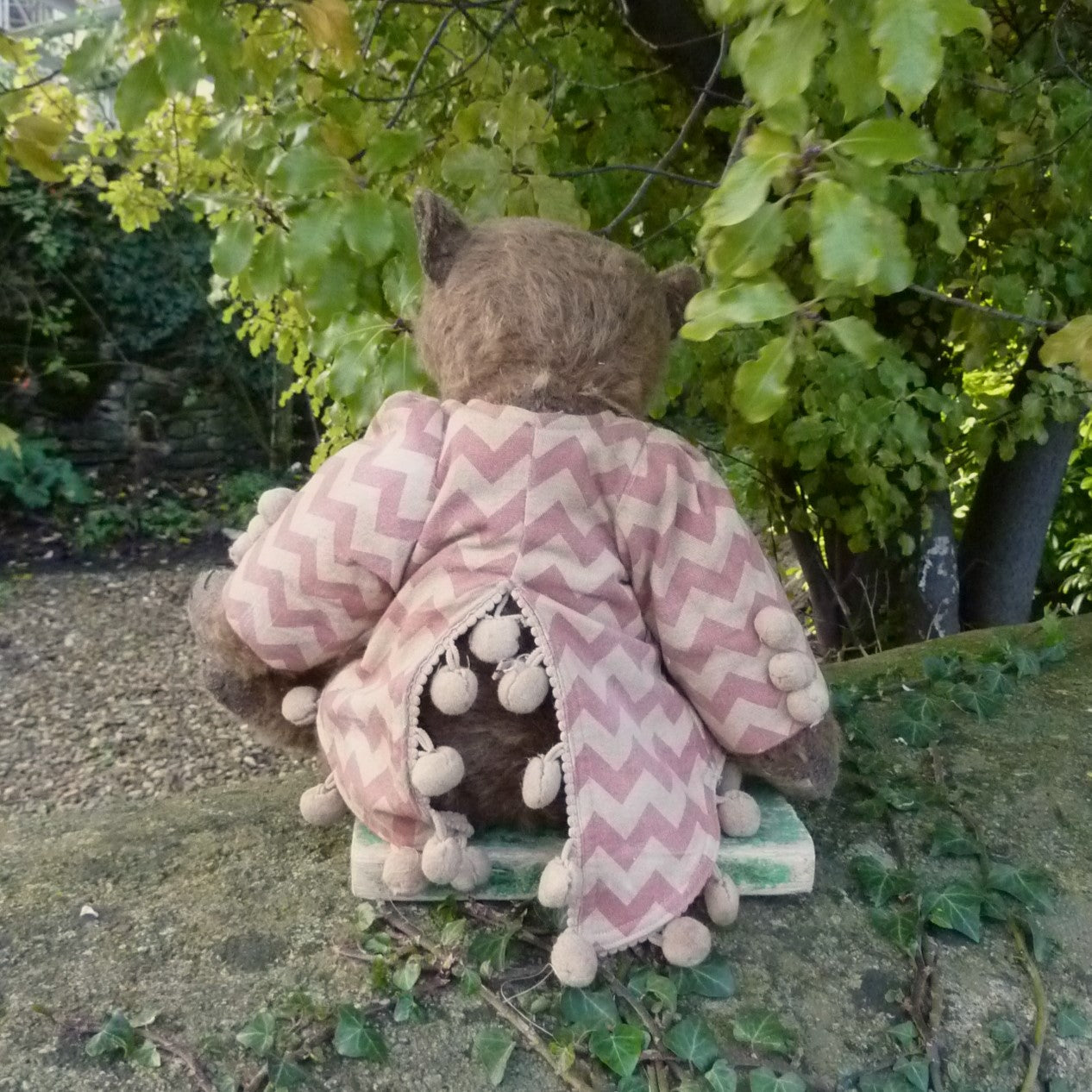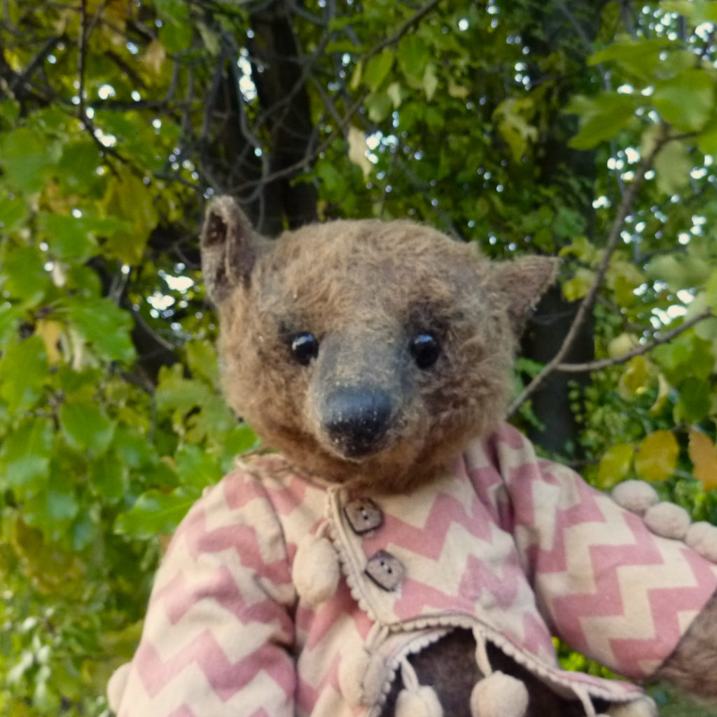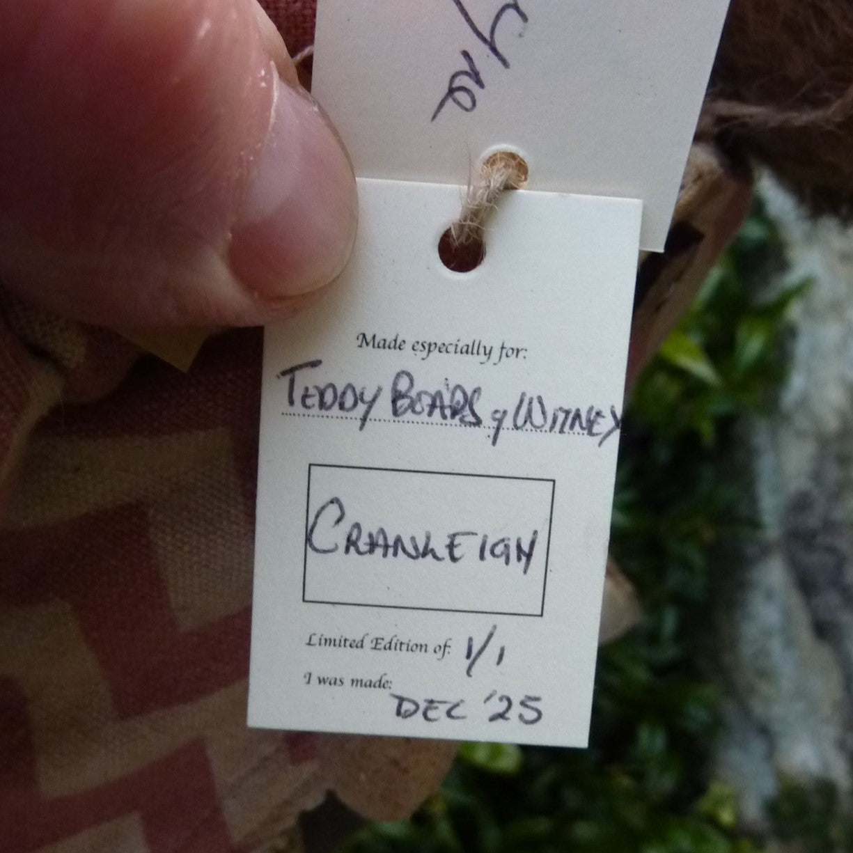 This medium to large-sized, antique-looking bear is made of distressed and hand-plucked, dark brown mohair with black glass eyes, a waxed nose and hand-painted age detail on his face. He has aged linen paw pads and is heavily filled with a mixture of wood shavings and mineral granules. Cranleigh wears an elegant, bobble-trimmed jacket, made of vintage linen material.