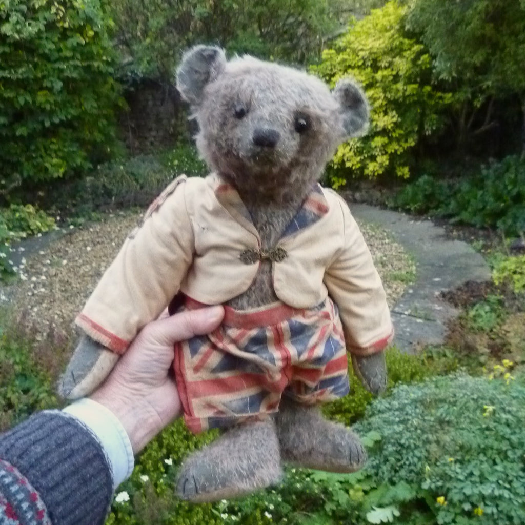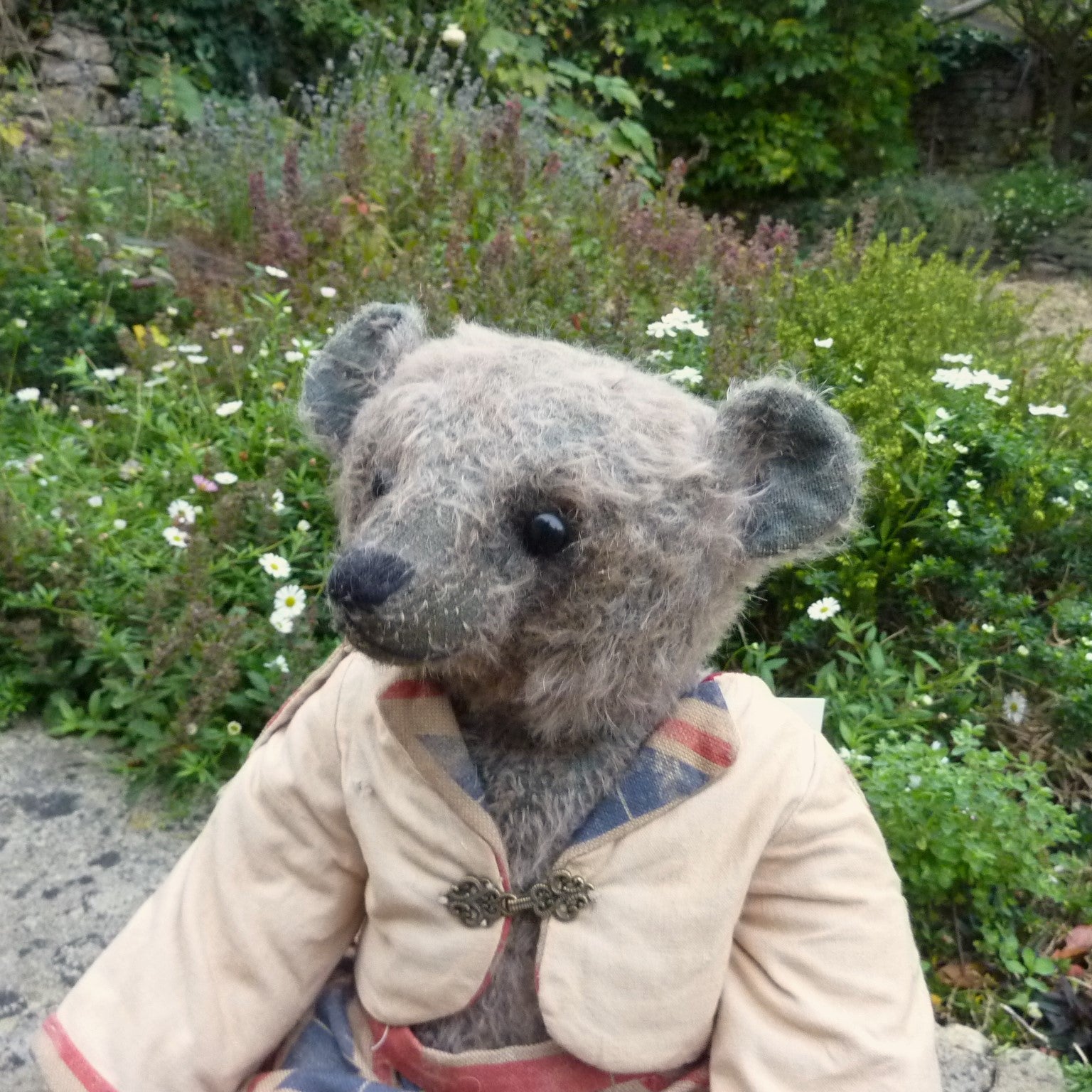 This antique-looking, medium to large-sized classic bear is made of ultra-sparse, distressed and pink-tinted grey mohair with black glass eyes and aged linen paw pads. Heavily filled with a mixture of wood shavings and mineral granules, Alfie wears a tailed jacket made of vintage, cream linen and lined with fragments of an old linen Union Jack flag, which match his short trousers.