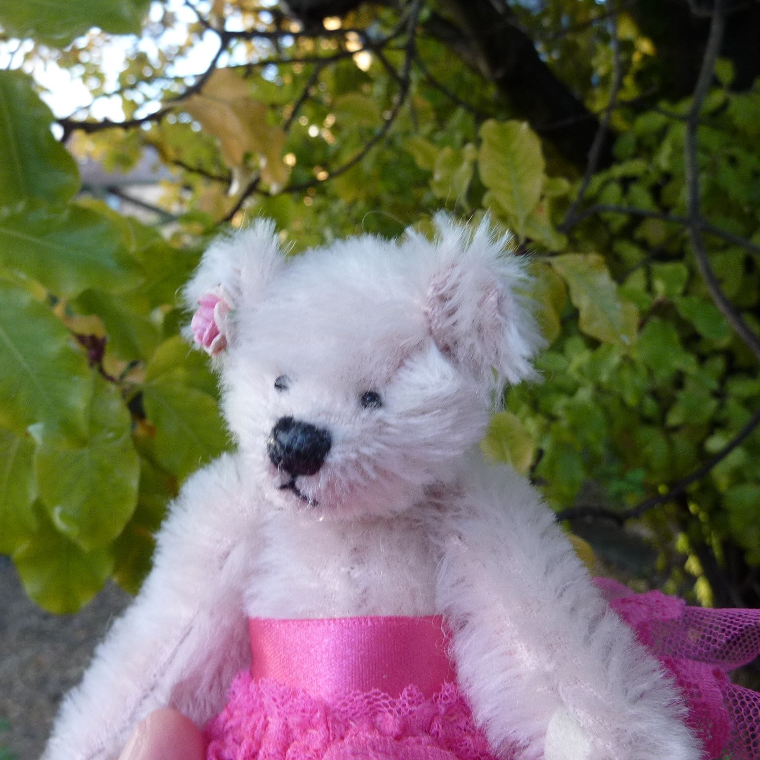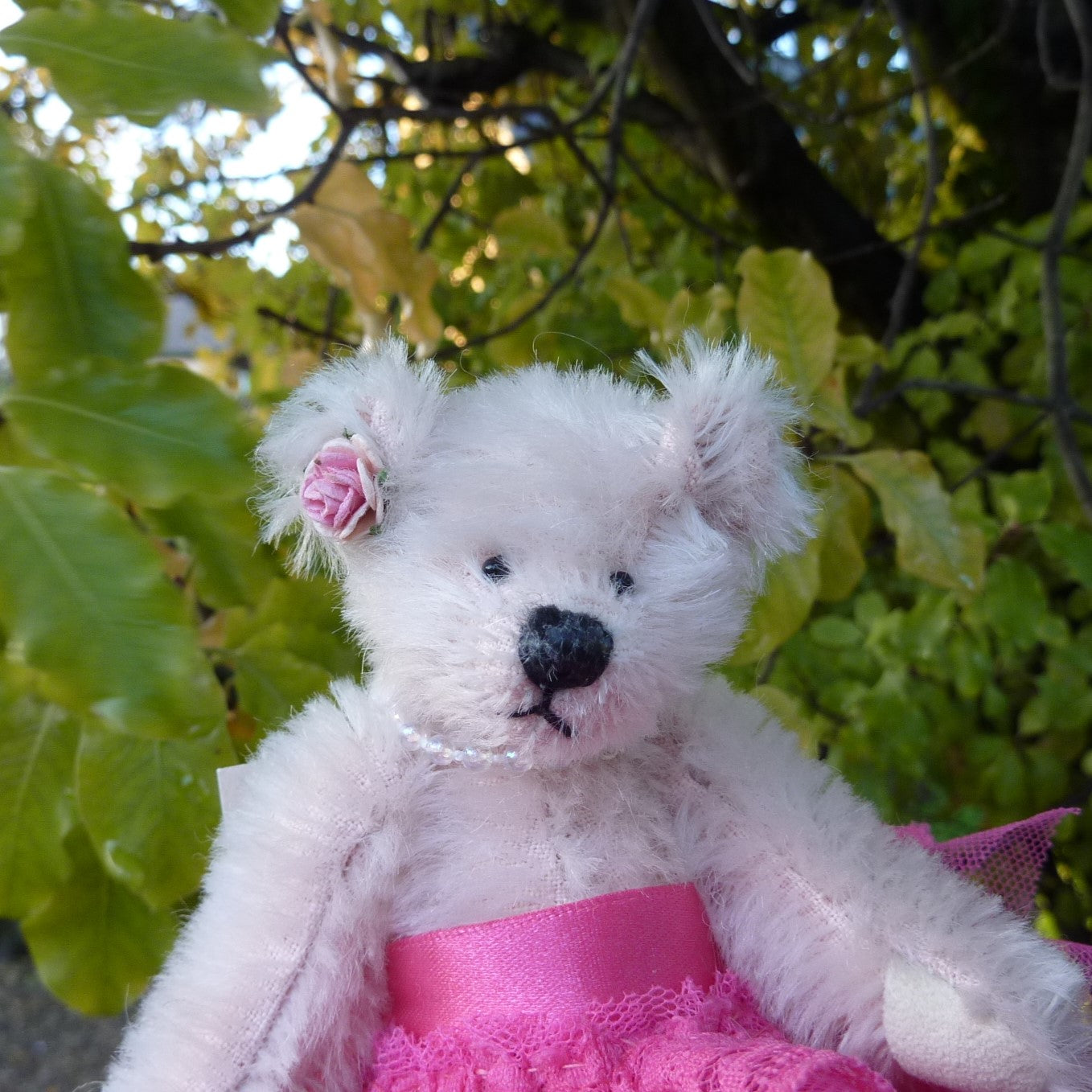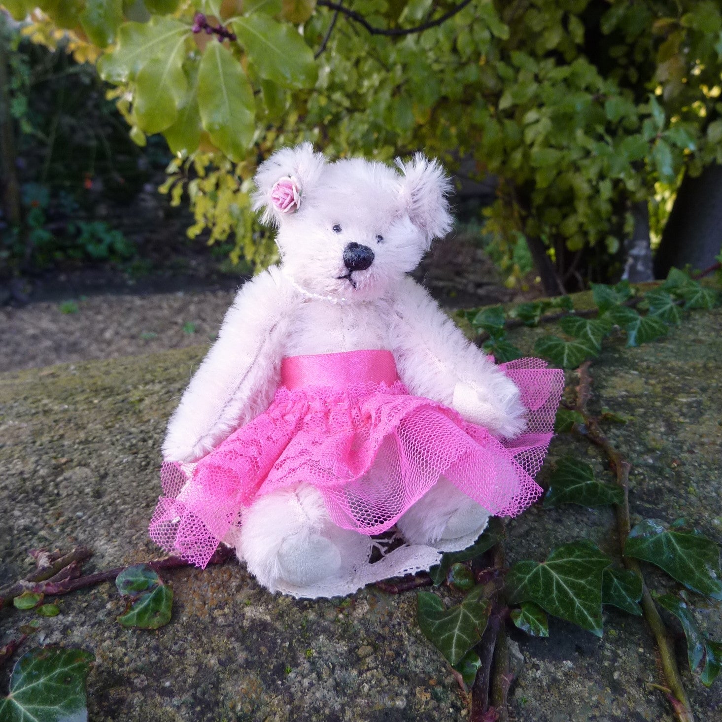 This striking little bear is made of sparse pink mohair with small black onyx eyes and faux suede paws. She wears a high-waisted, bright fuchsia pink, lace and tulle ballet skirt., a string of pearls and a pink ribbon bow by one ear. Alice is filled with polyfibre, with a little steel shot added for weight.