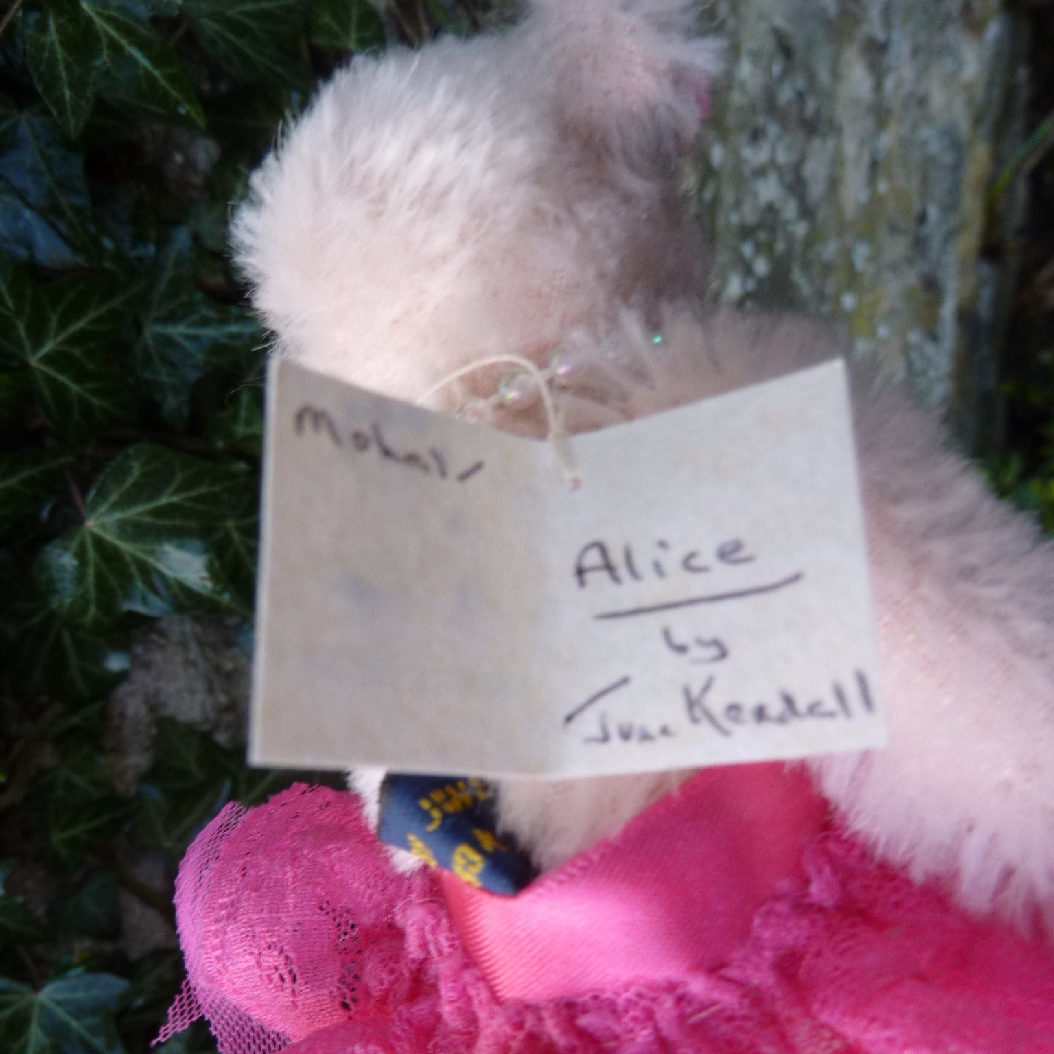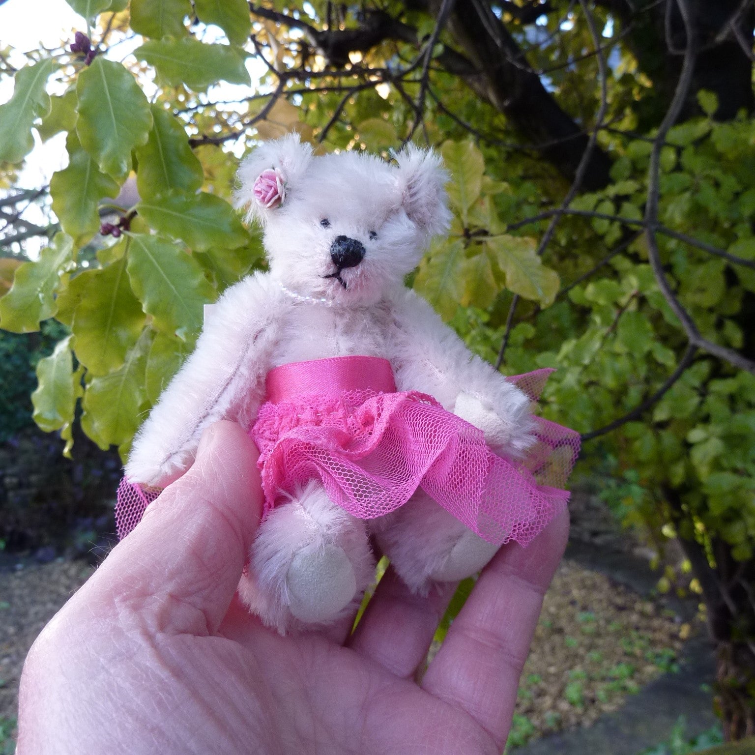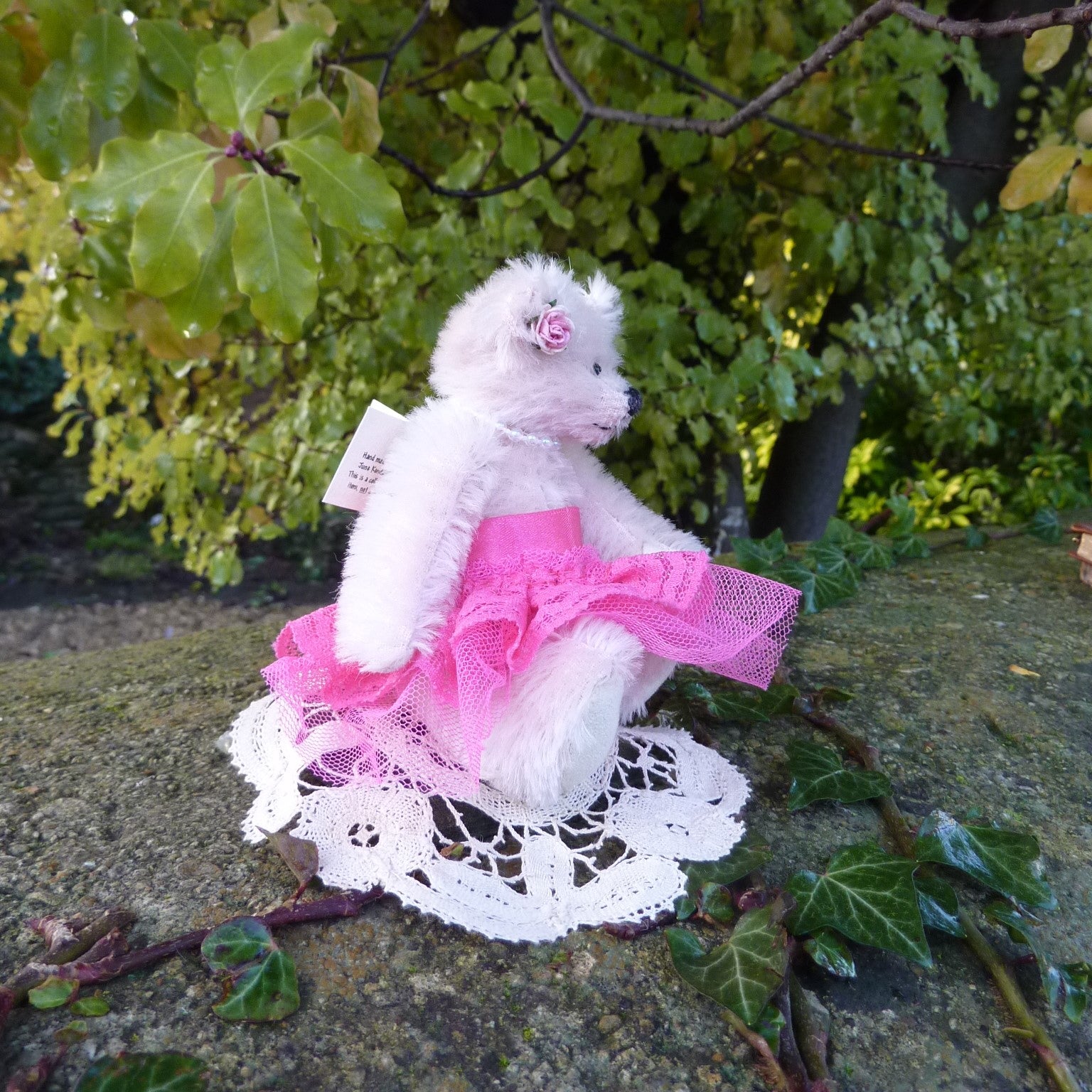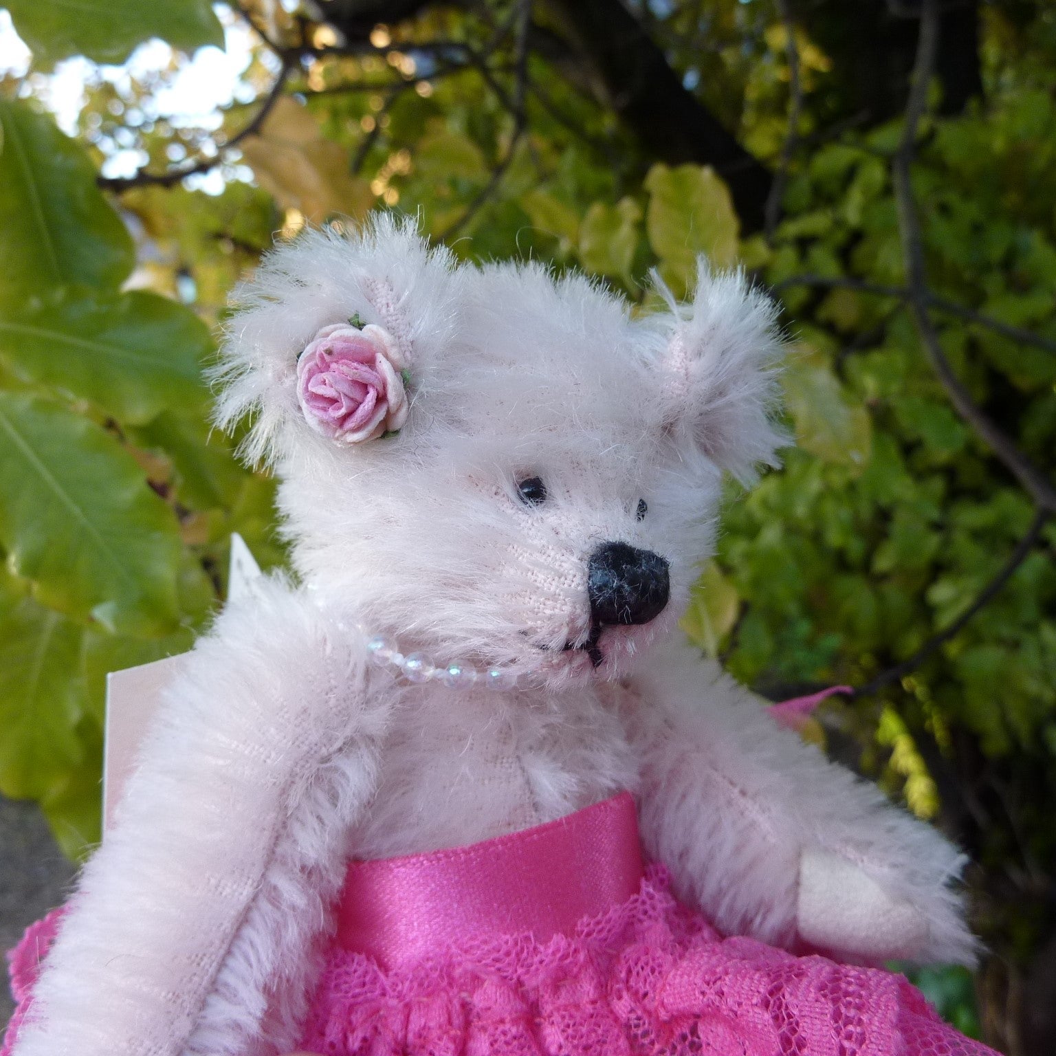 This striking little bear is made of sparse pink mohair with small black onyx eyes and faux suede paws. She wears a high-waisted, bright fuchsia pink, lace and tulle ballet skirt., a string of pearls and a pink ribbon bow by one ear. Alice is filled with polyfibre, with a little steel shot added for weight.