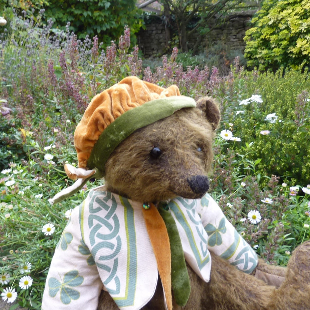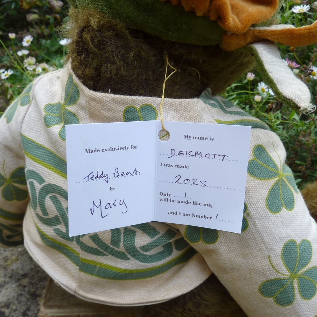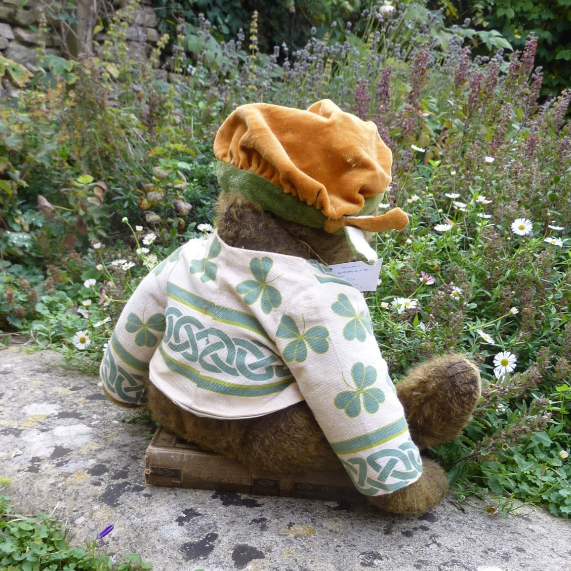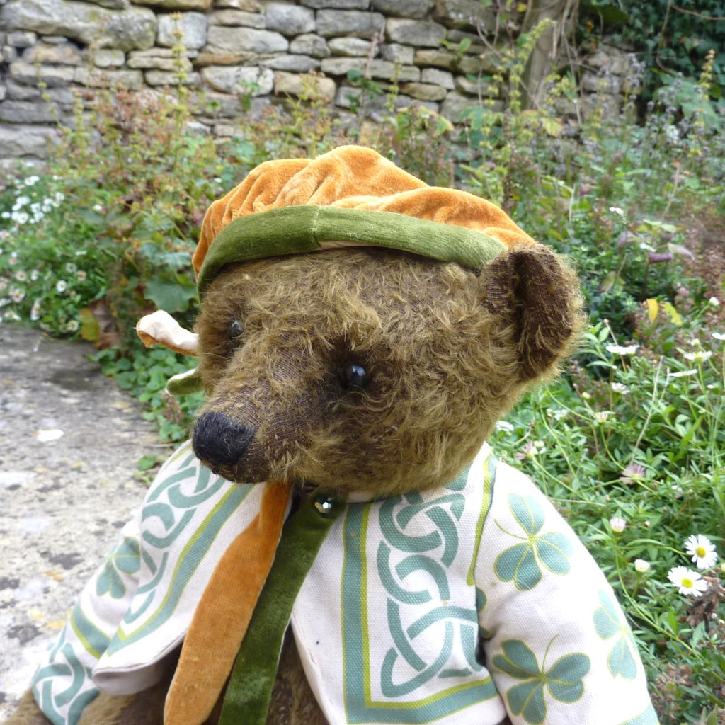 This vintage-looking, medium to large-sized bear is made of unusual, sparse and distressed, green-brown mohair with black glass eyes and aged linen paw pads. Heavily filled with a mixture of wood shavings and mineral granules, Dermott wears a jacket made of vintage shamrock-printed material and a dusky orange and green velvet cap (matching the trim on his jacket).