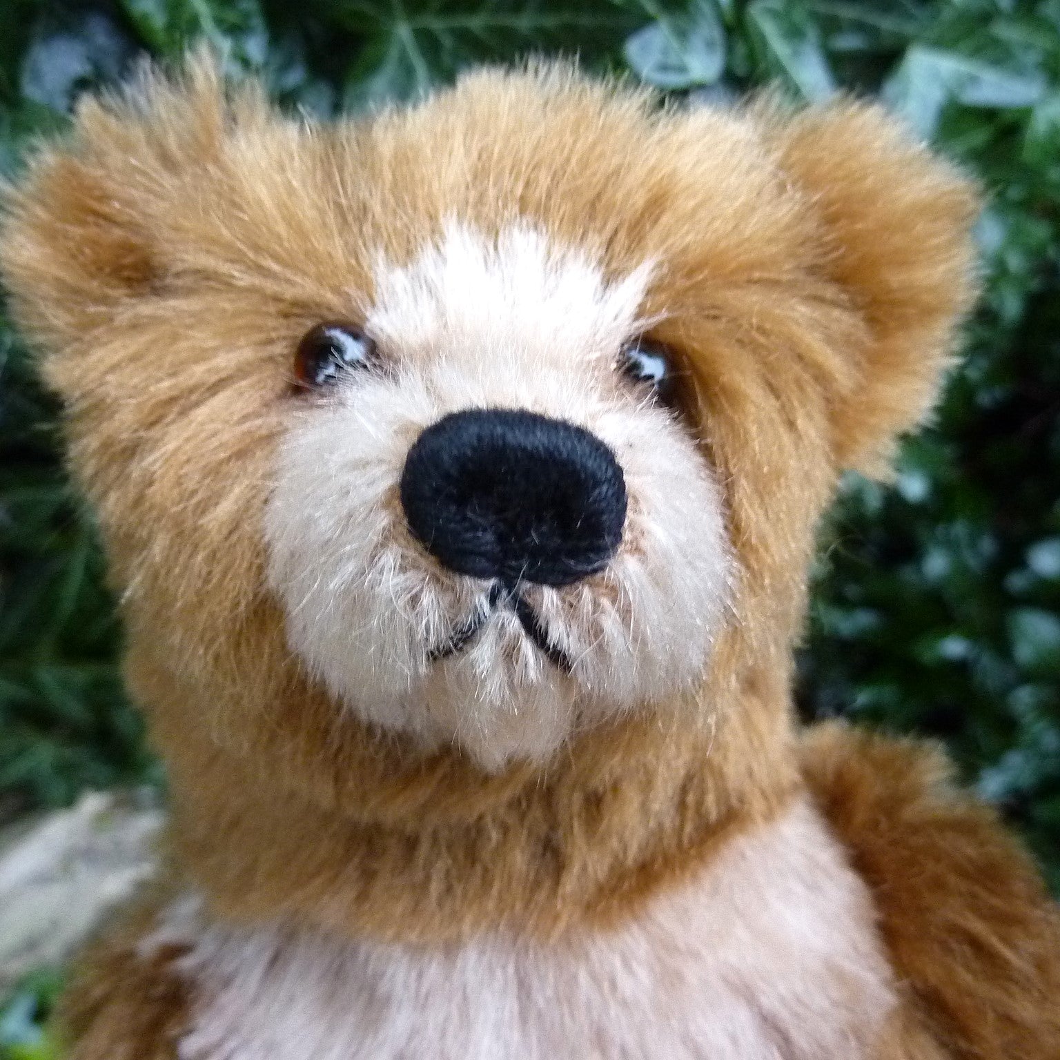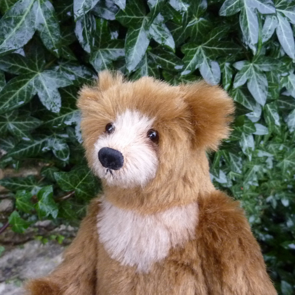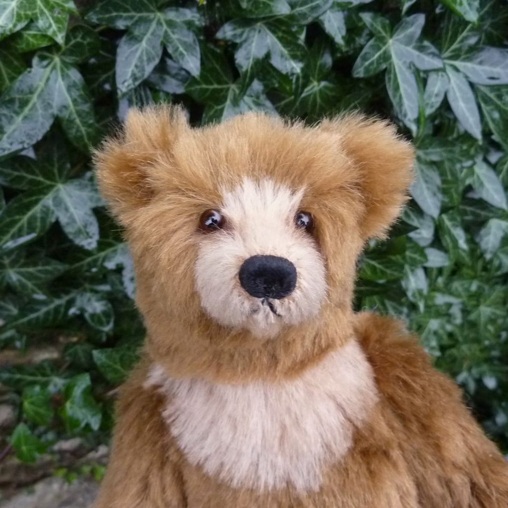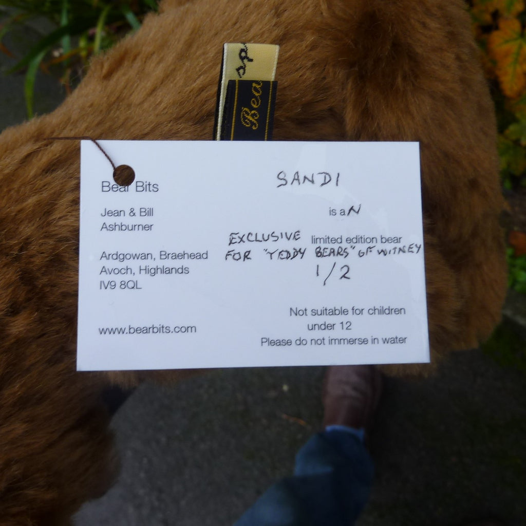 This stunning and finely sculpted, medium-sized bear cub is made of vintage, mid brown German mohair with paler inserts. He has dark brown glass eyes, a naturally embroidered nose, eight joints (including two in the neck and one on each wrist), and faux suede paws with three-dimensional pad detail. Filled with polyfibre and polypellets, this Sandi is number 1 of 2.
