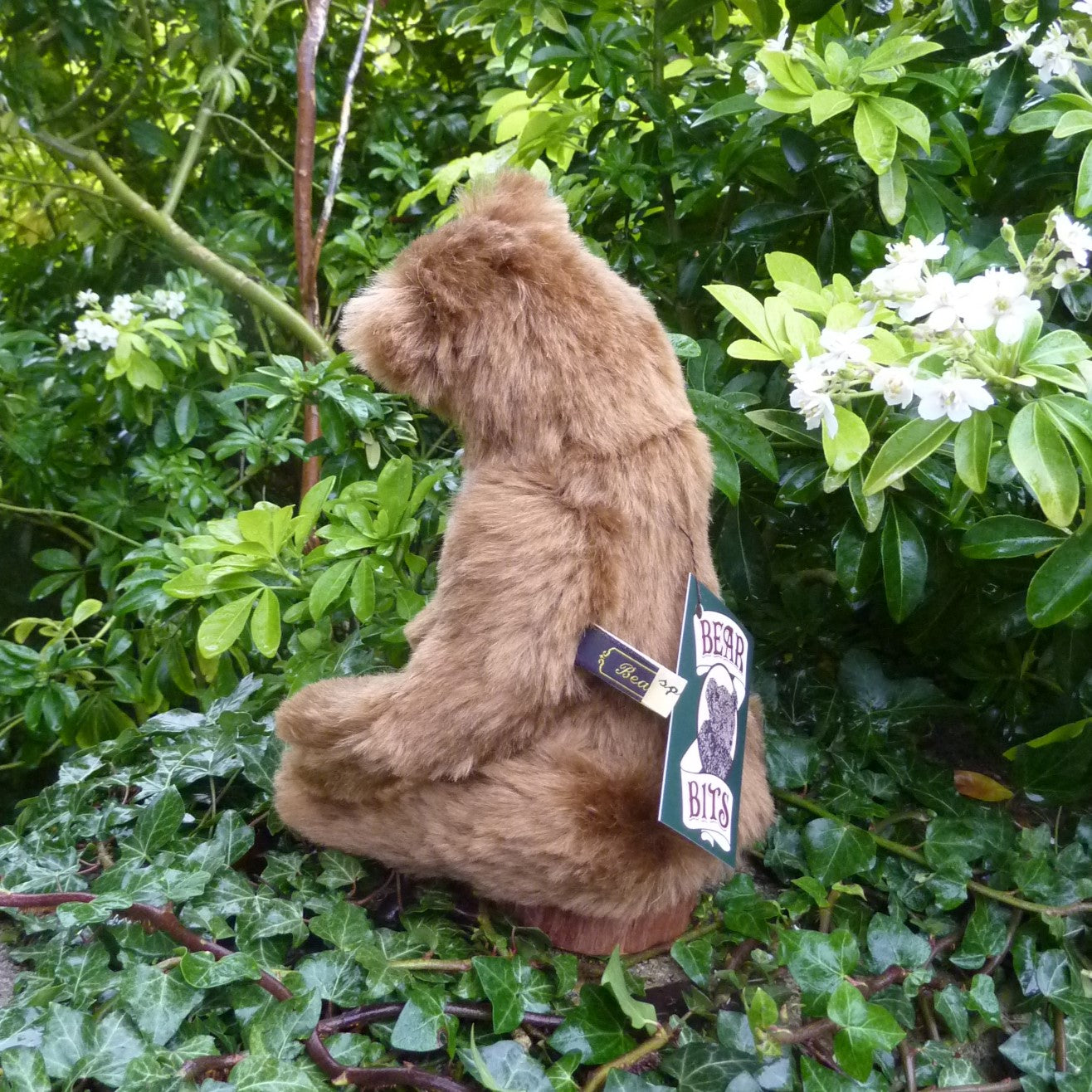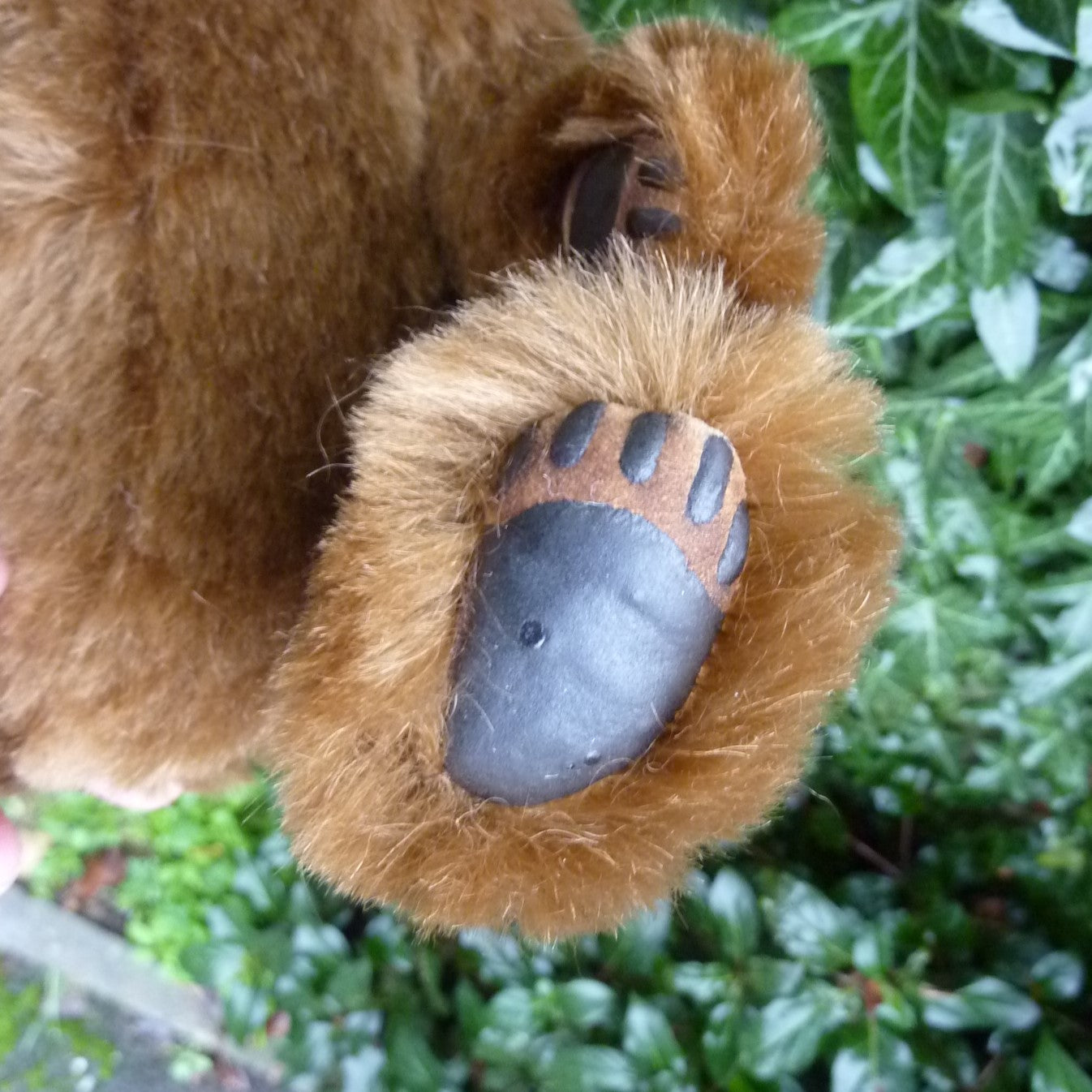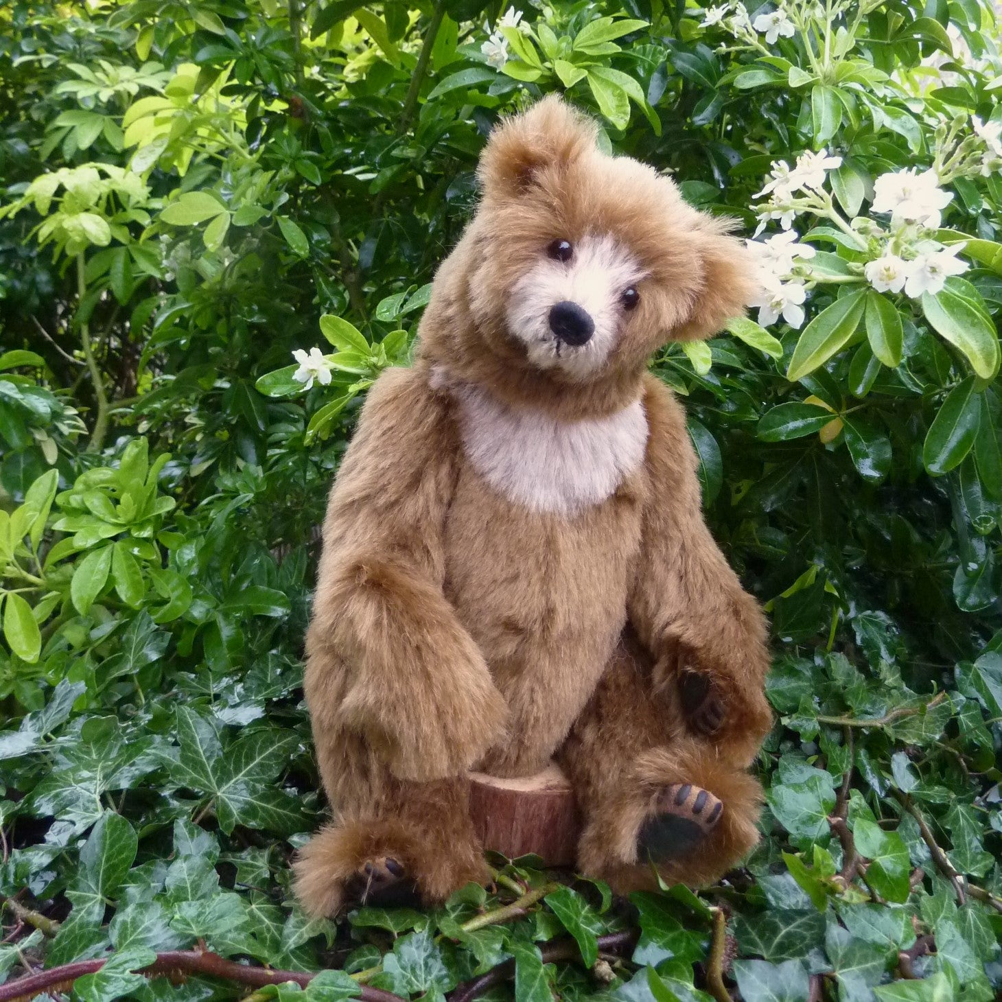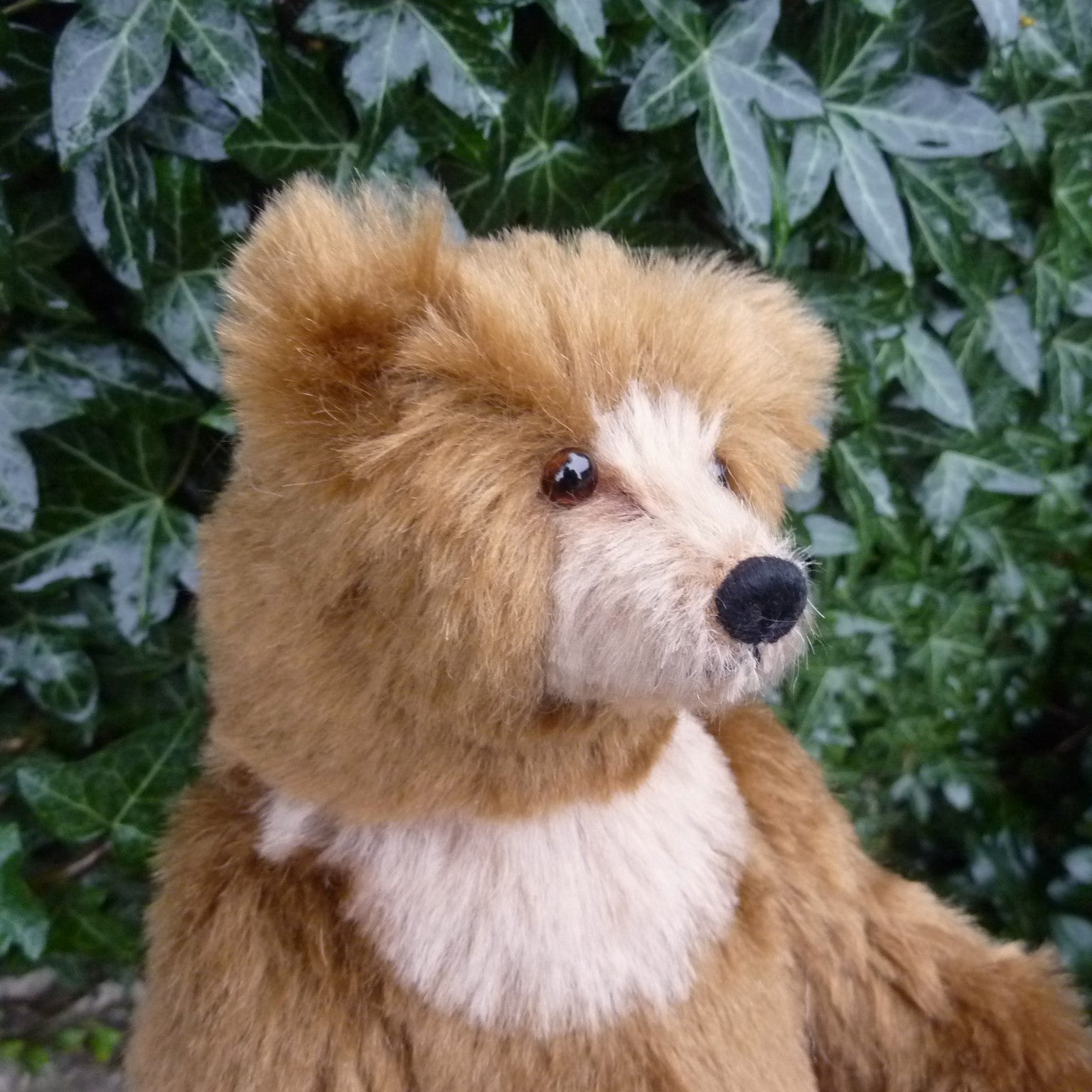 This stunning and finely sculpted, medium-sized bear cub is made of vintage, mid brown German mohair with paler inserts. He has dark brown glass eyes, a naturally embroidered nose, eight joints (including two in the neck and one on each wrist), and faux suede paws with three-dimensional pad detail. Filled with polyfibre and polypellets, this Sandi is number 1 of 2.