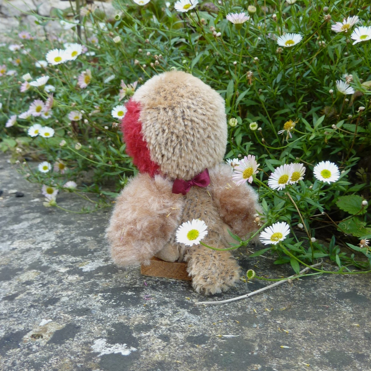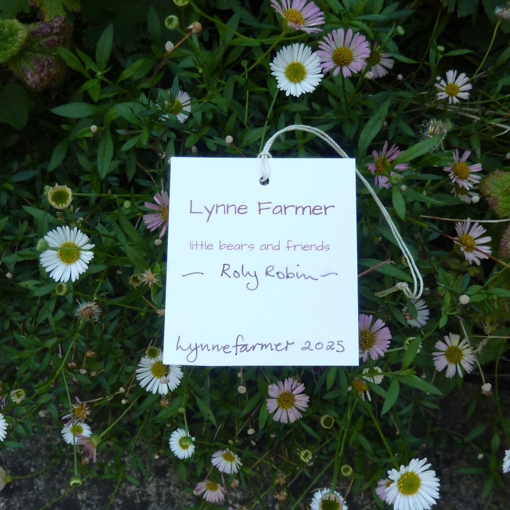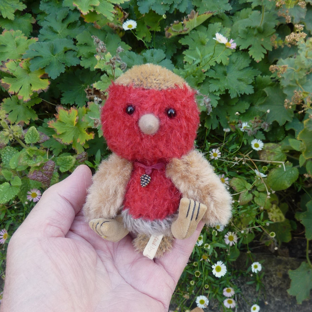 This cute, little robin is made of distressed, dark red and brown mohair with thread-jointed, alpaca wings, black glass eyes, a felt beak and cashmere legs and feet. Filled with polyfibre, with steel beads added for weight, Roly wears a berry pendant.