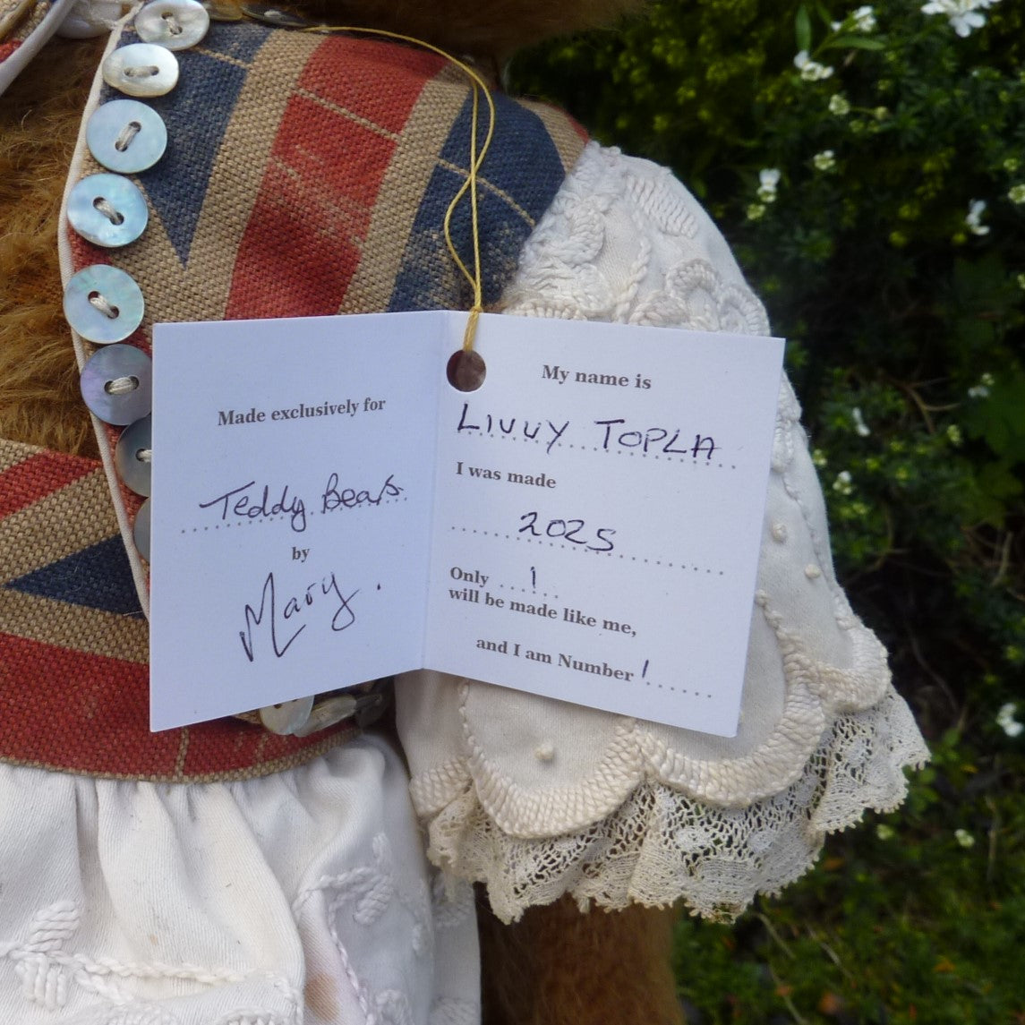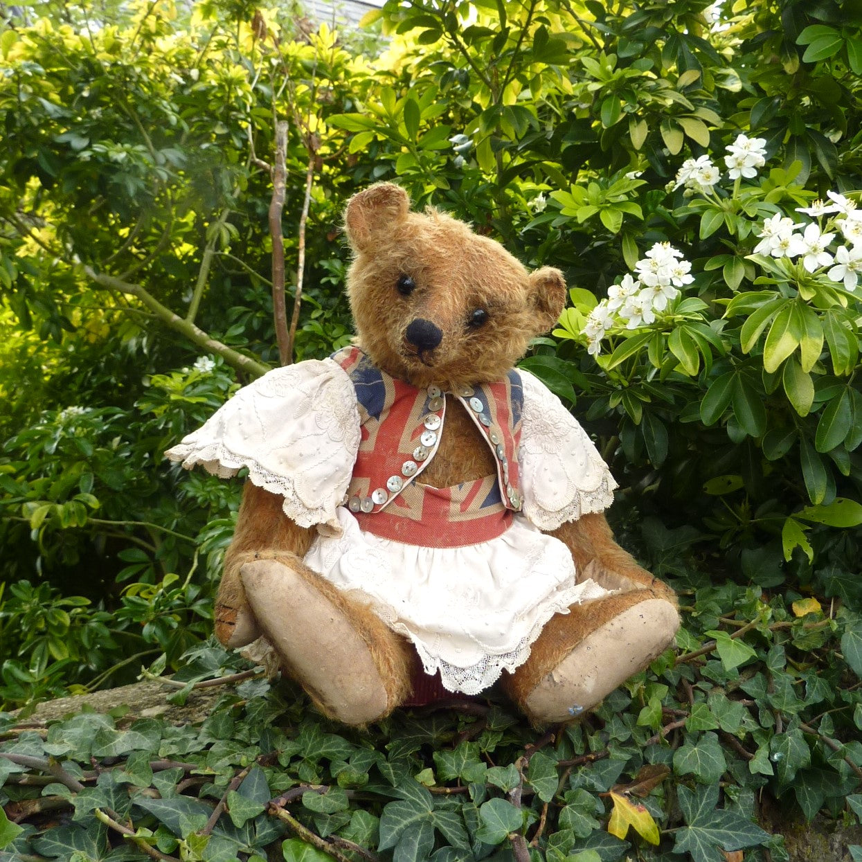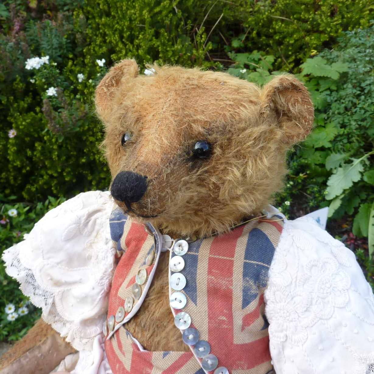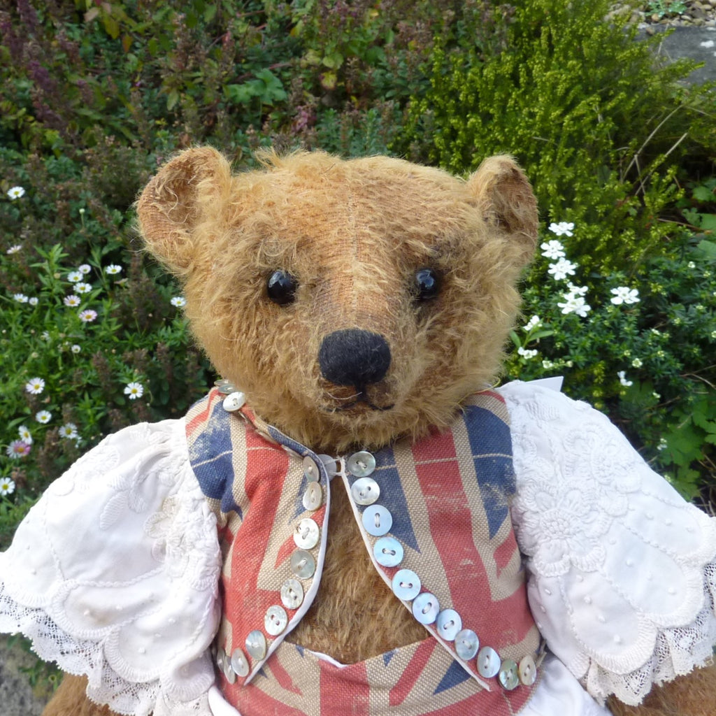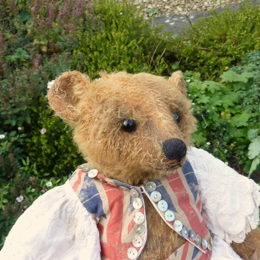 Vintage-looking, this medium to large-sized classic bear is made sparse, distressed and hand-plucked, cinnamon mohair with black glass eyes, hand-painted facial detail and aged linen paw pads. Heavily filled with a mixture of wood shavings and mineral granules, Livvy wears a jacket made of fragments of an old linen Union Jack flag with sleeves made of vintage, embroidered and lace-edged cotton material and trimmed with many antique mother of pearl buttons, together with a matching skirt.
