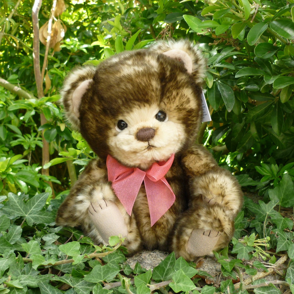 Nero is a sweet bear of soft dark brown-tipped cream plush, with soft paw pads. He has a stitched nose with air-brushed details, and is finished with a bright pink organza ribbon. He is fully jointed.