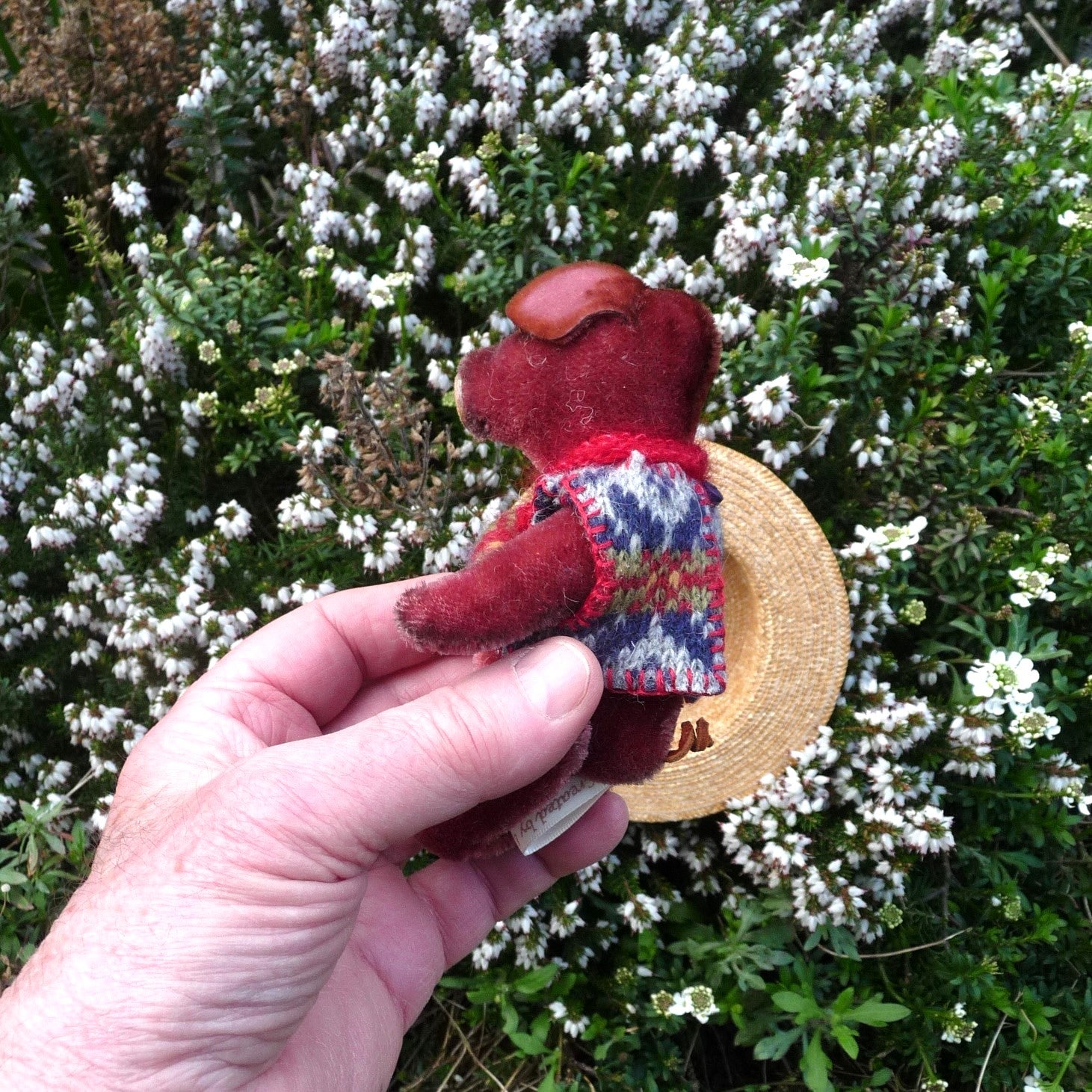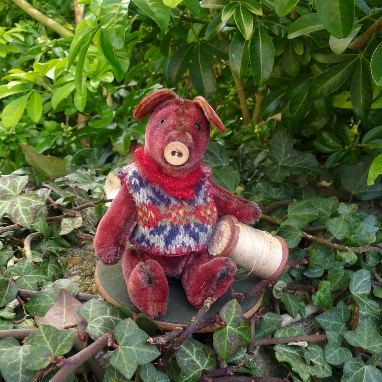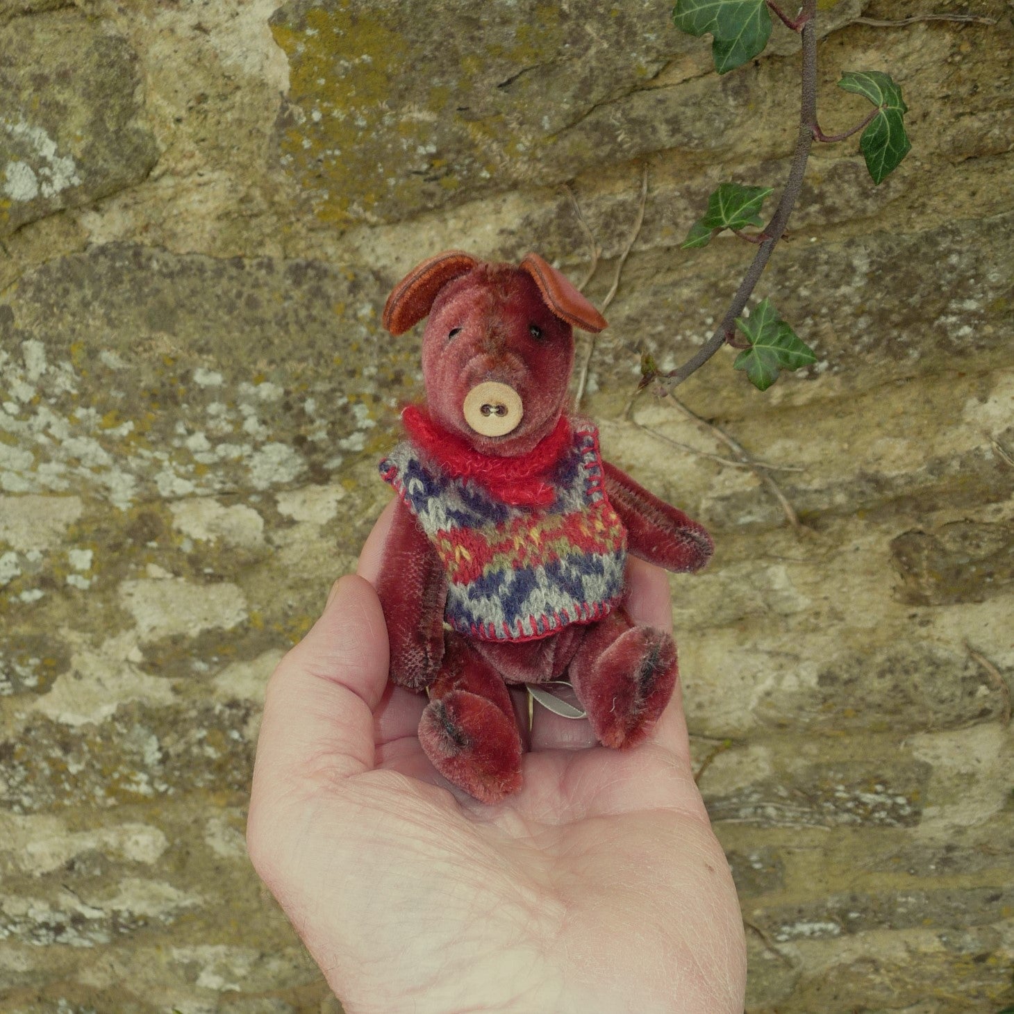 This cute pig is made of vintage, short pile burgundy mohair with black glass eyes and a button nose. Filled with polyfibre, with steel beads added for weight, Percival wears a sleeveless sweater (finely knitted by Lynne) and a hand-knitted scarf.