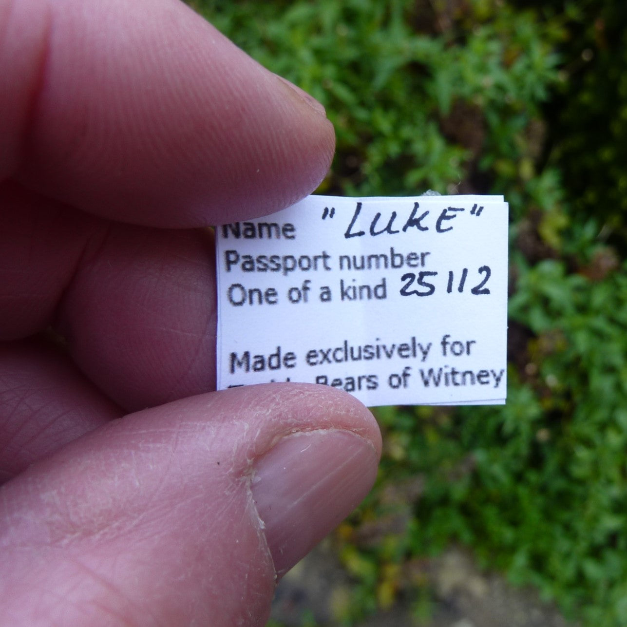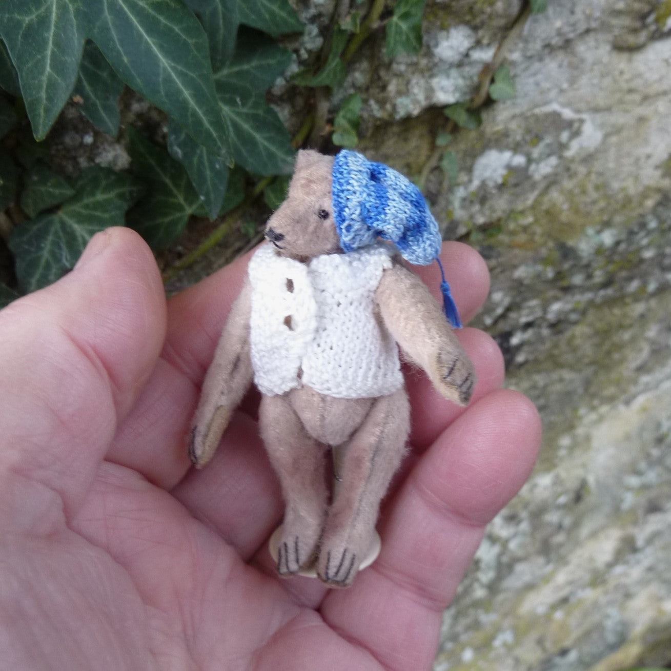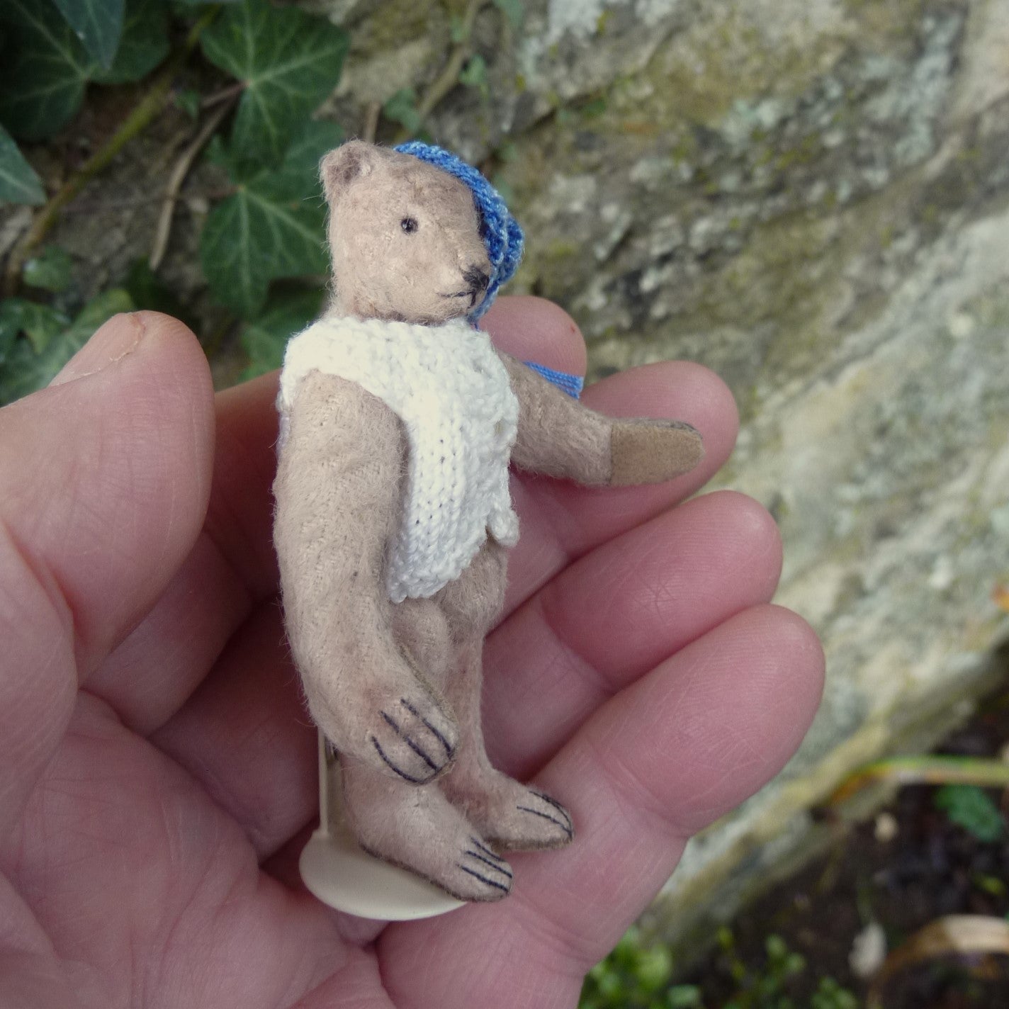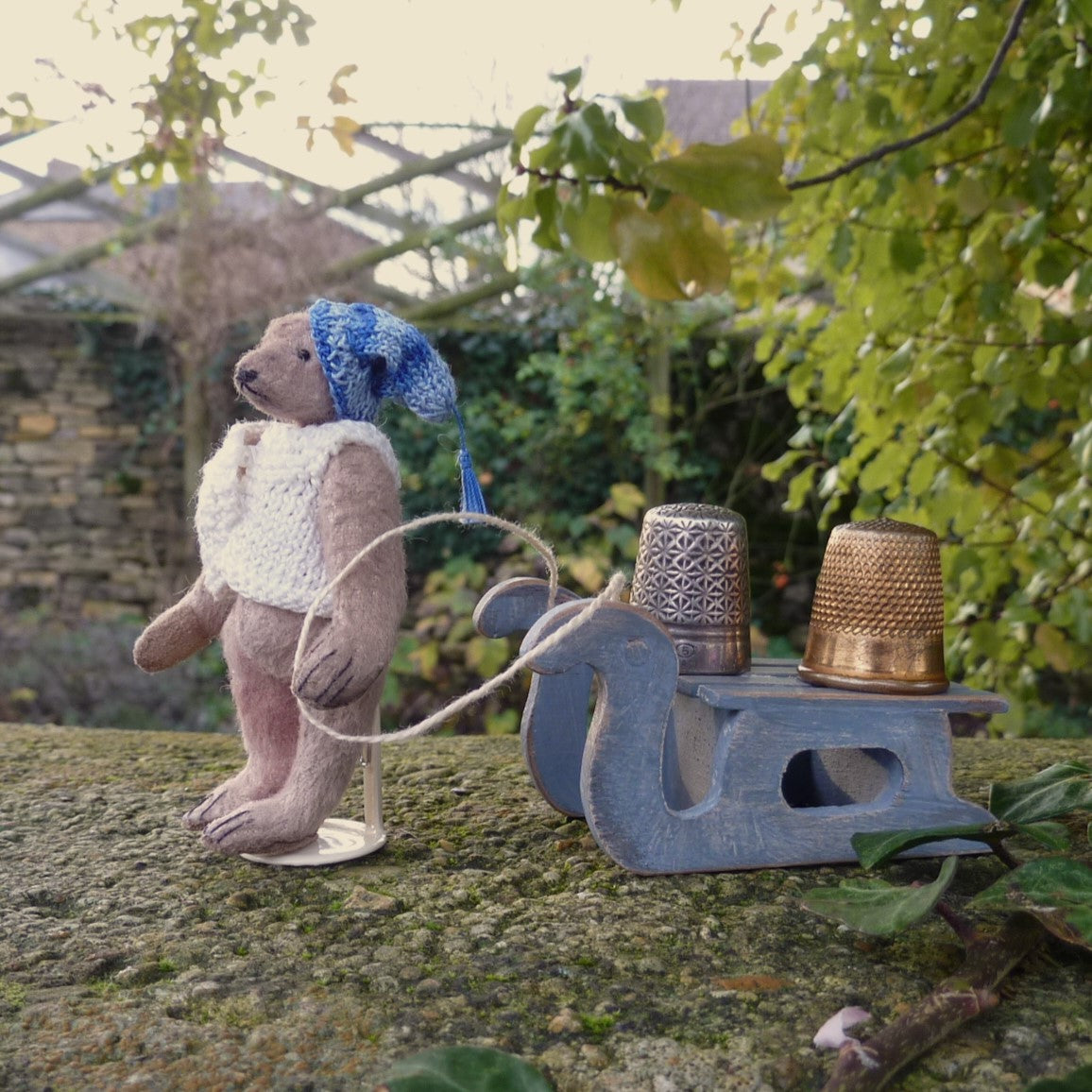 This tiny bear is made of aged, pale beige viscose with glass bead eyes and faux suede paw pads. Filled with natural kapok, he wears a finely hand-knitted cap and cardigan. He comes (stand included) with the wooden sleigh as shown. (The thimbles are not included.)