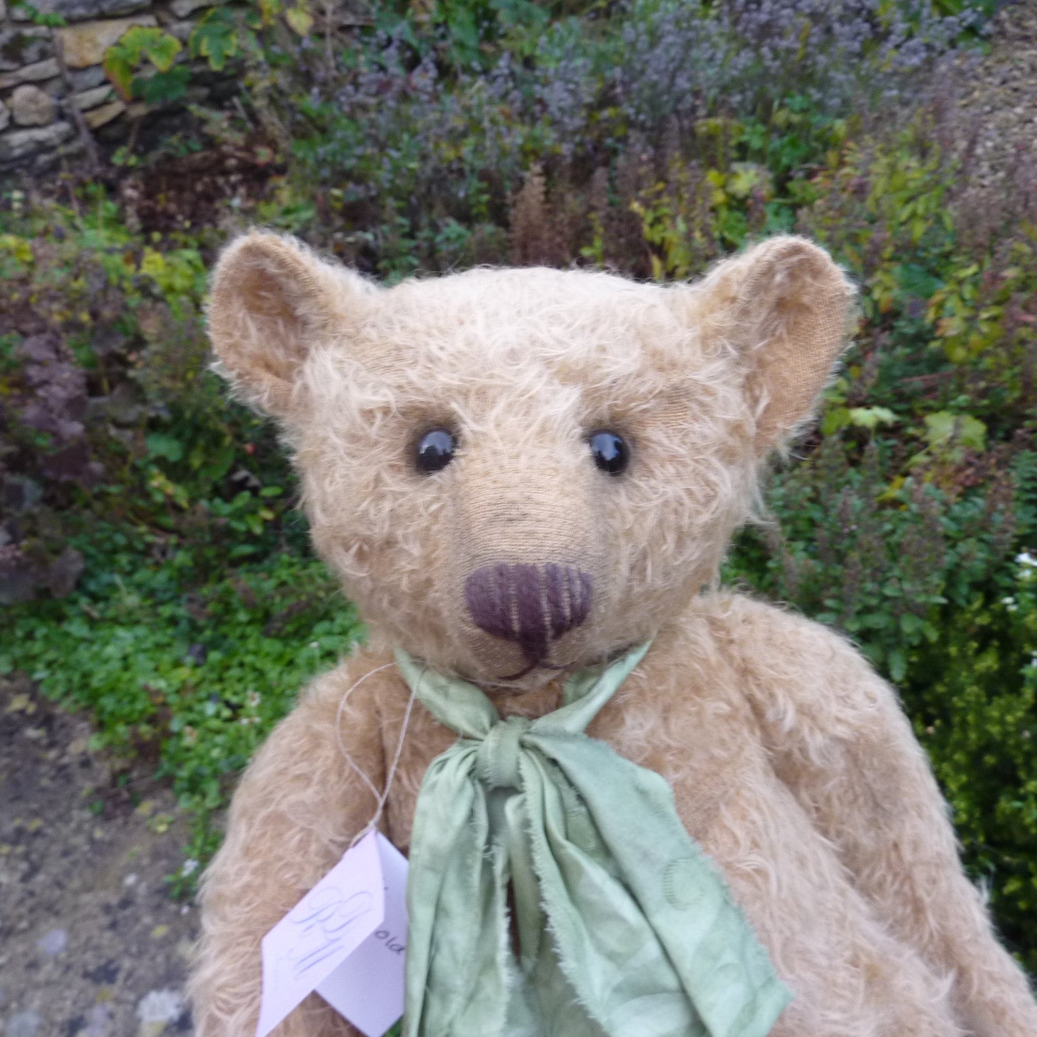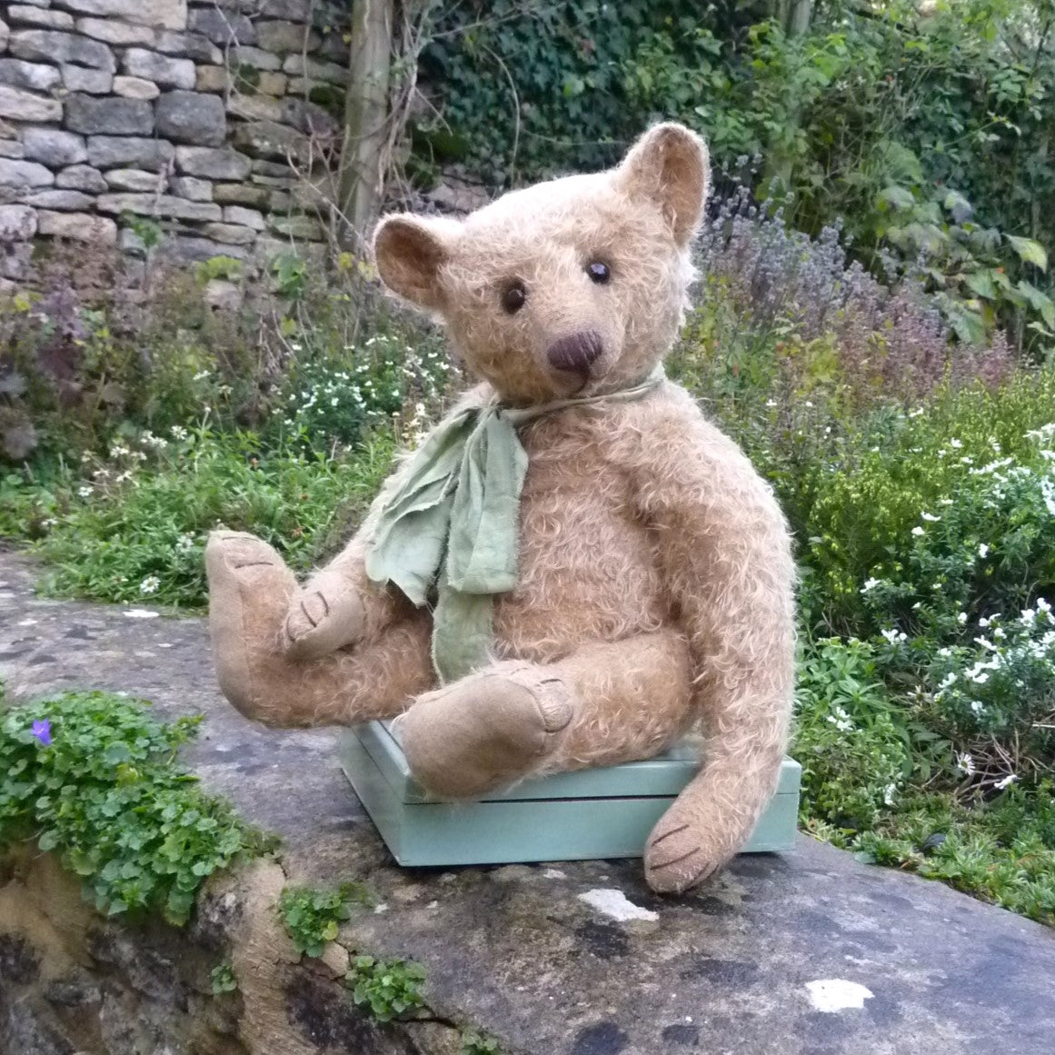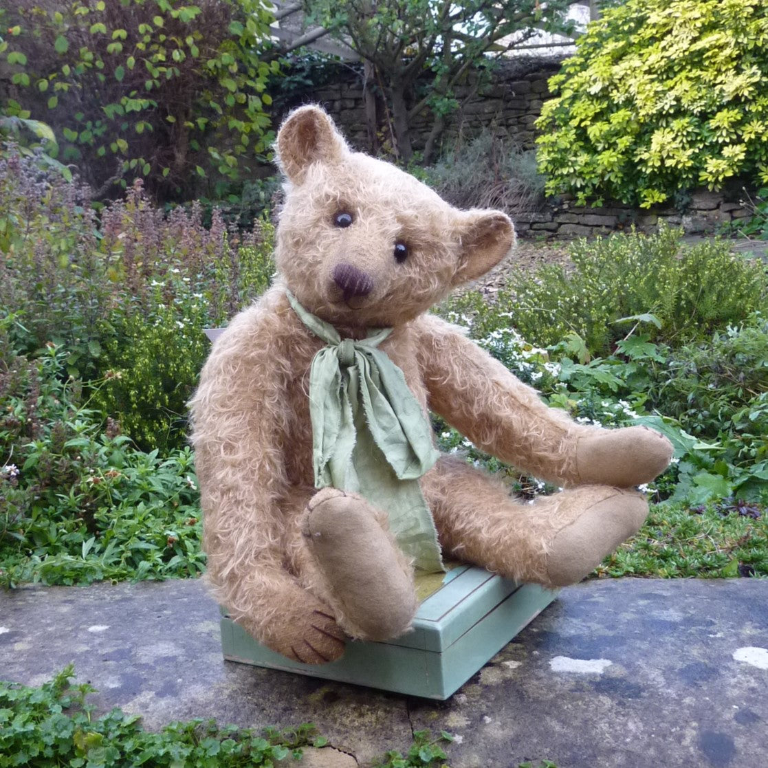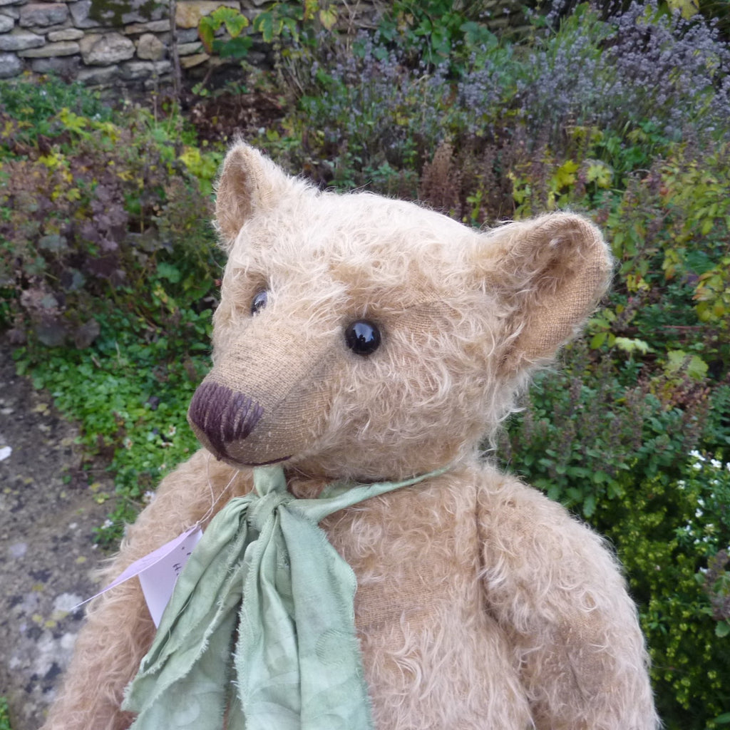 Wow! Simply wonderful, this large bear appears to have been treasured for several generations. Made of hand-dyed, ultra-sparse and distressed, old gold mohair, he has black glass eyes, a skip-stitched, brown thread nose, hand-painted facial detail and lightly aged felt paw pads. Softly filled with a mixture of wood shavings and mineral granules, he wears a green fabric neck bow.