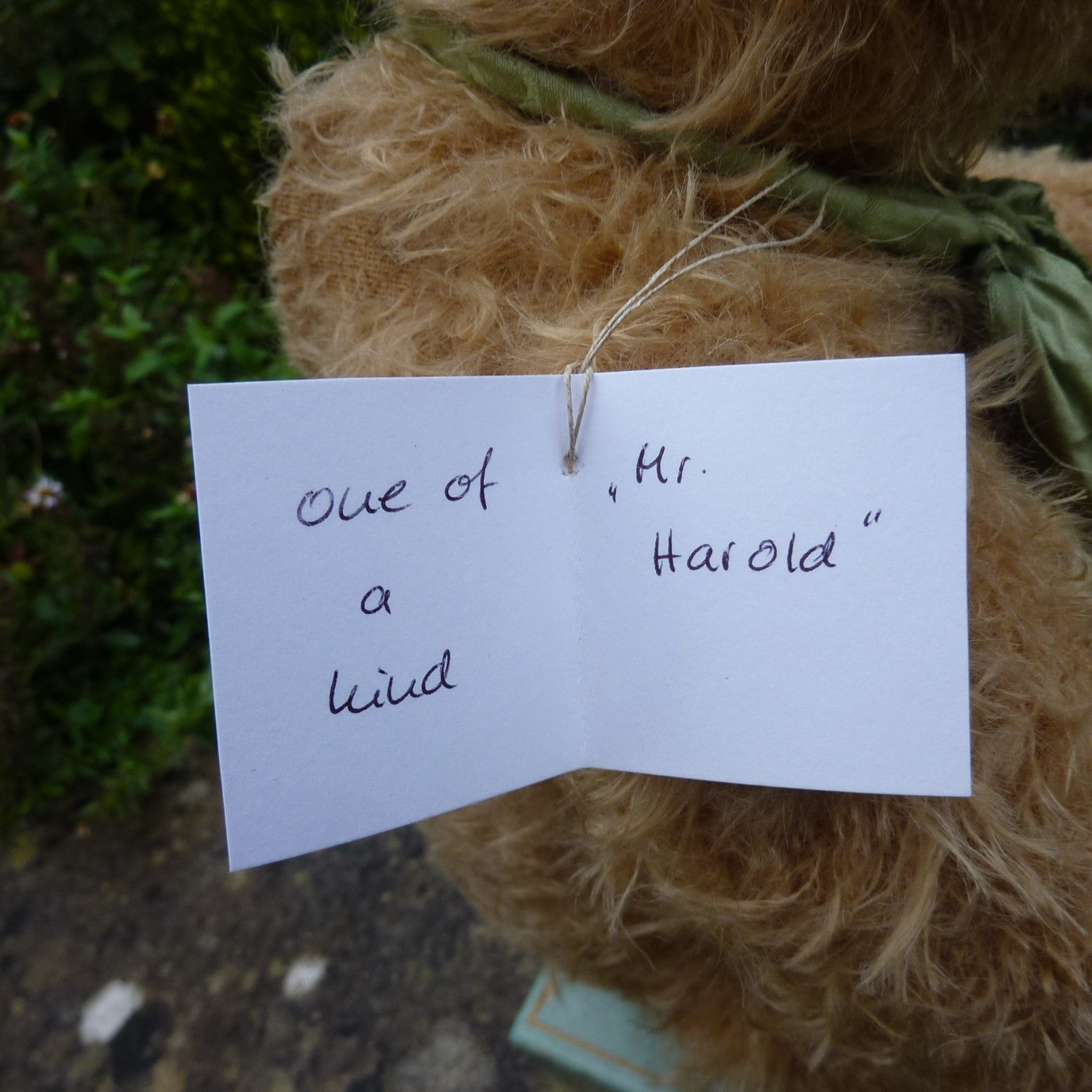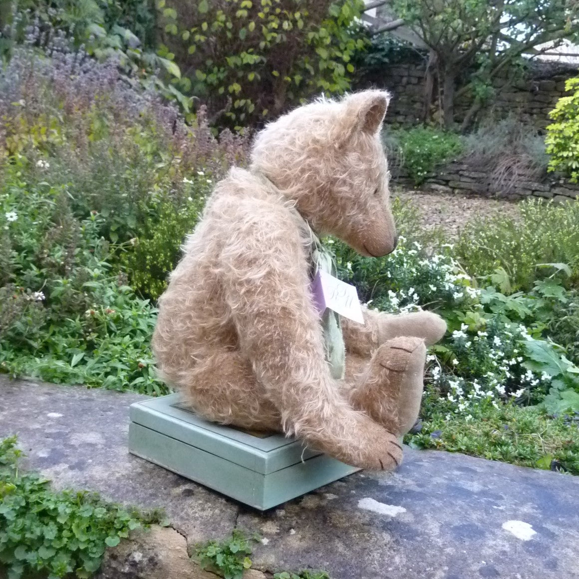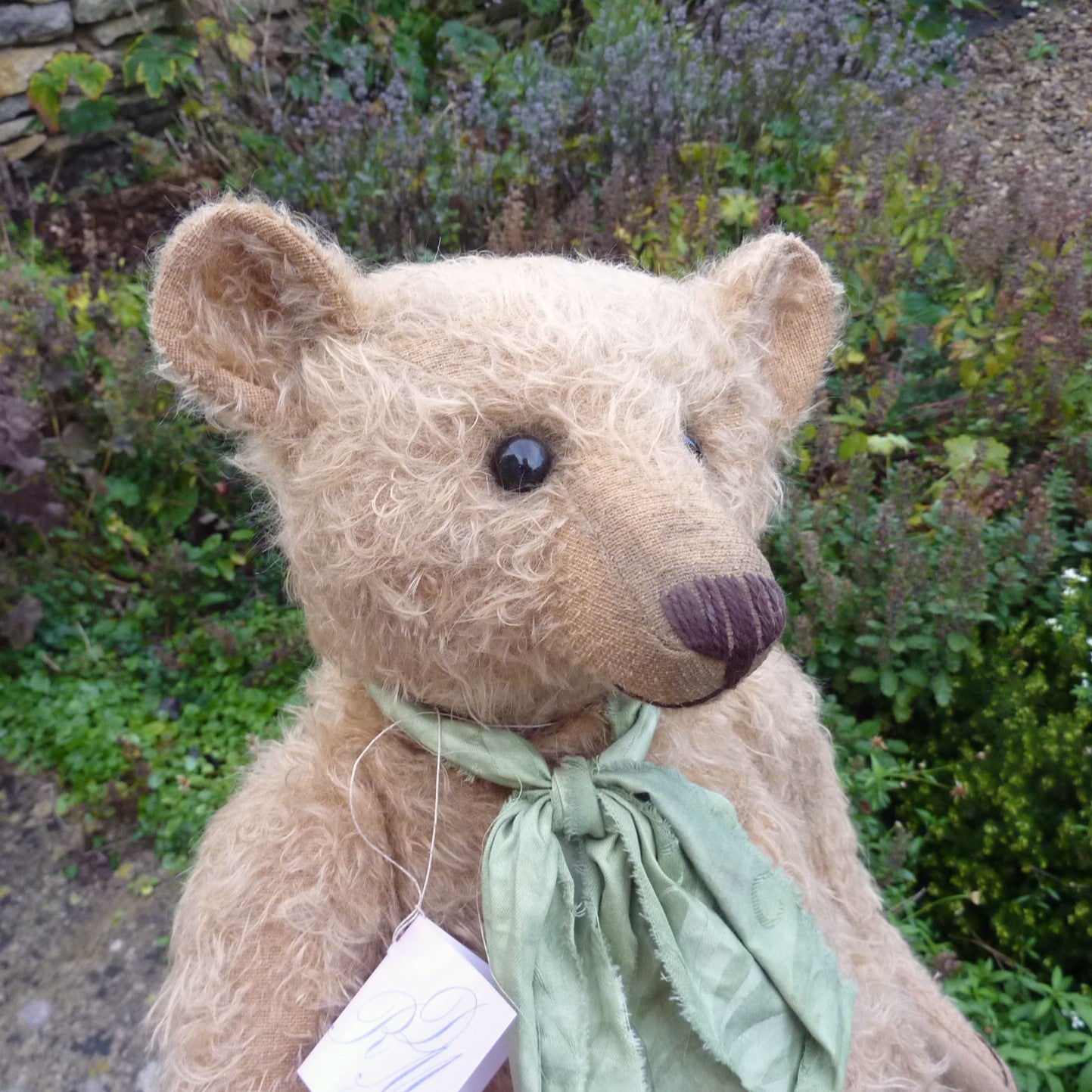 Wow! Simply wonderful, this large bear appears to have been treasured for several generations. Made of hand-dyed, ultra-sparse and distressed, old gold mohair, he has black glass eyes, a skip-stitched, brown thread nose, hand-painted facial detail and lightly aged felt paw pads. Softly filled with a mixture of wood shavings and mineral granules, he wears a green fabric neck bow.