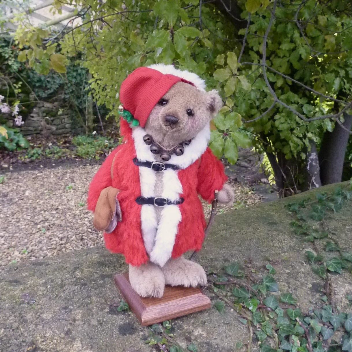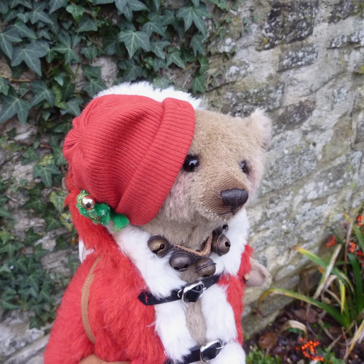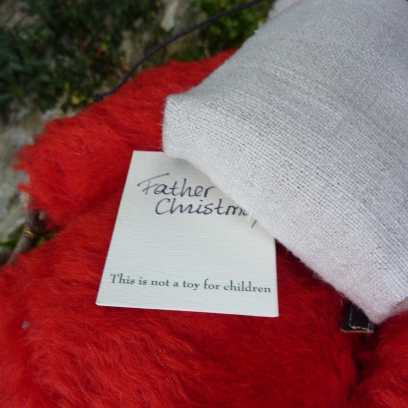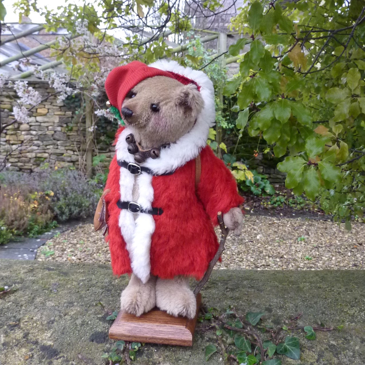 Father Christmas is finely is made of caramel mohair with black glass eyes, a waxed thread nose, rouged cheeks, wired arms and linen paw pads. He wears a plush-edged, hooded mohair coat, a jersey Santa cap and a vintage bell collar. He has suede mittens in a pocket, a linen sack on his back and a walking stick in one hand. He is filled with a mixture of wood shavings, polyester fibre and tiny mineral stones.