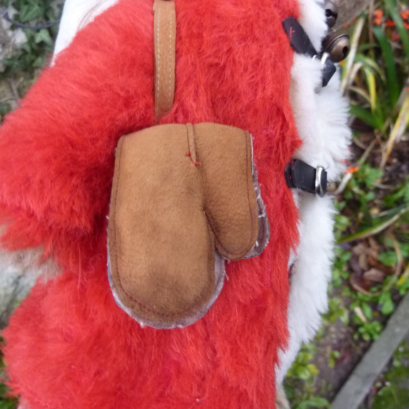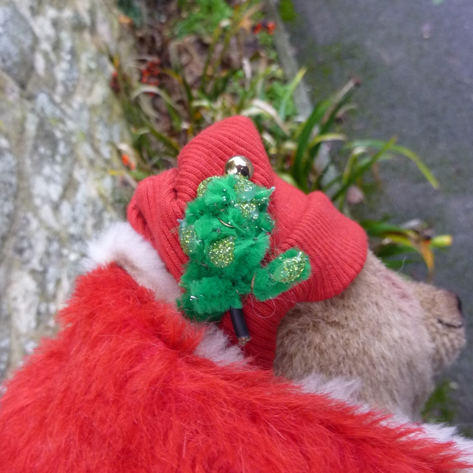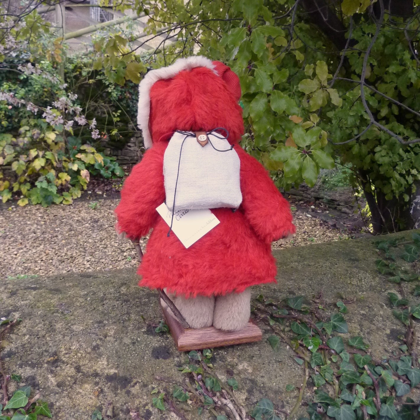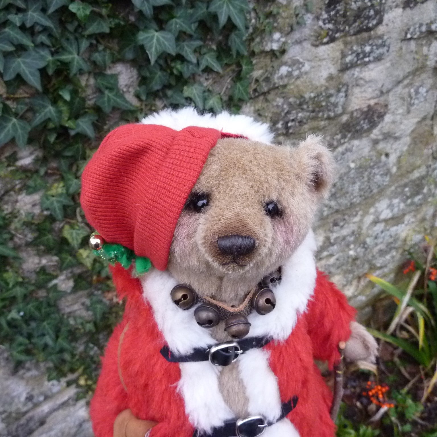 Father Christmas is finely is made of caramel mohair with black glass eyes, a waxed thread nose, rouged cheeks, wired arms and linen paw pads. He wears a plush-edged, hooded mohair coat, a jersey Santa cap and a vintage bell collar. He has suede mittens in a pocket, a linen sack on his back and a walking stick in one hand. He is filled with a mixture of wood shavings, polyester fibre and tiny mineral stones.