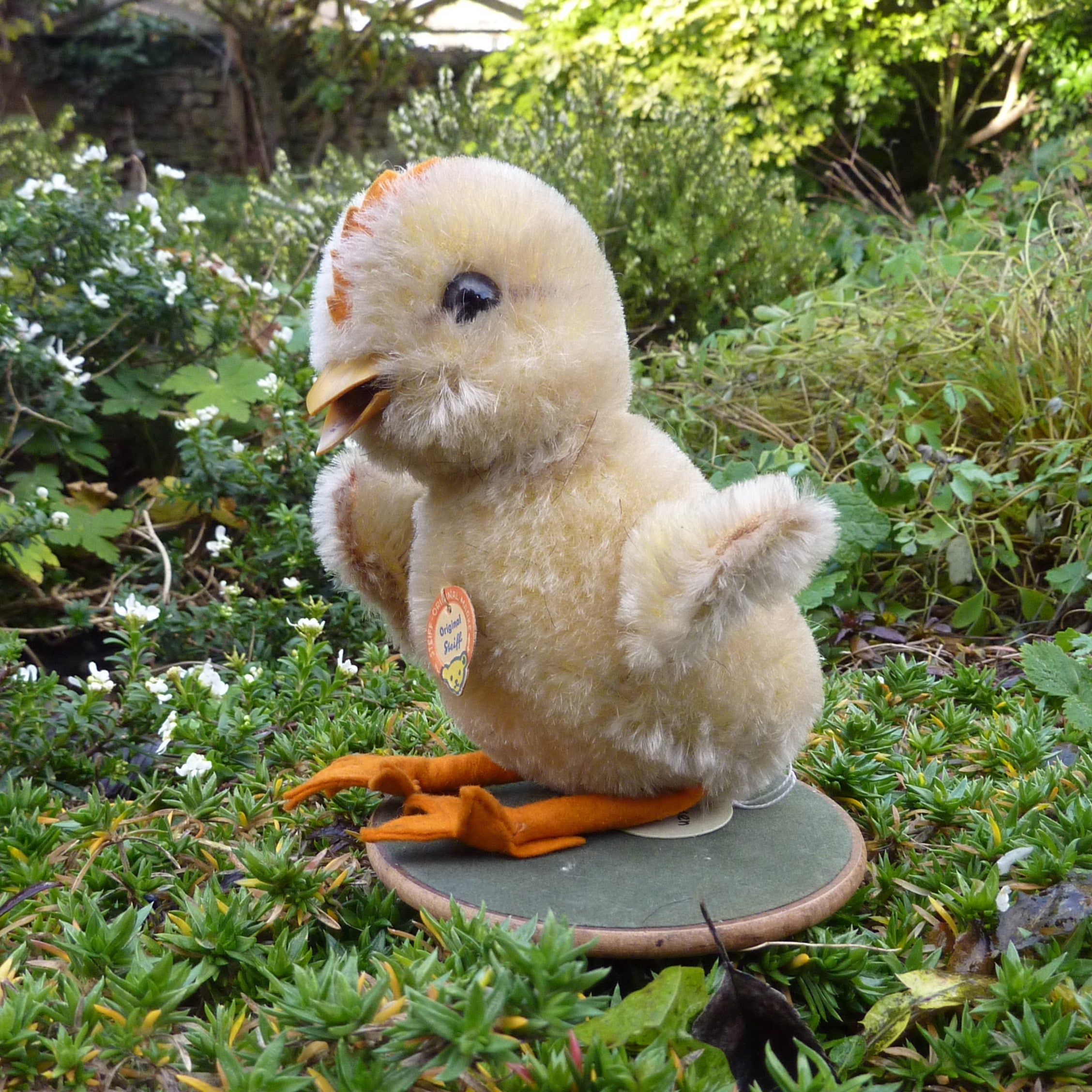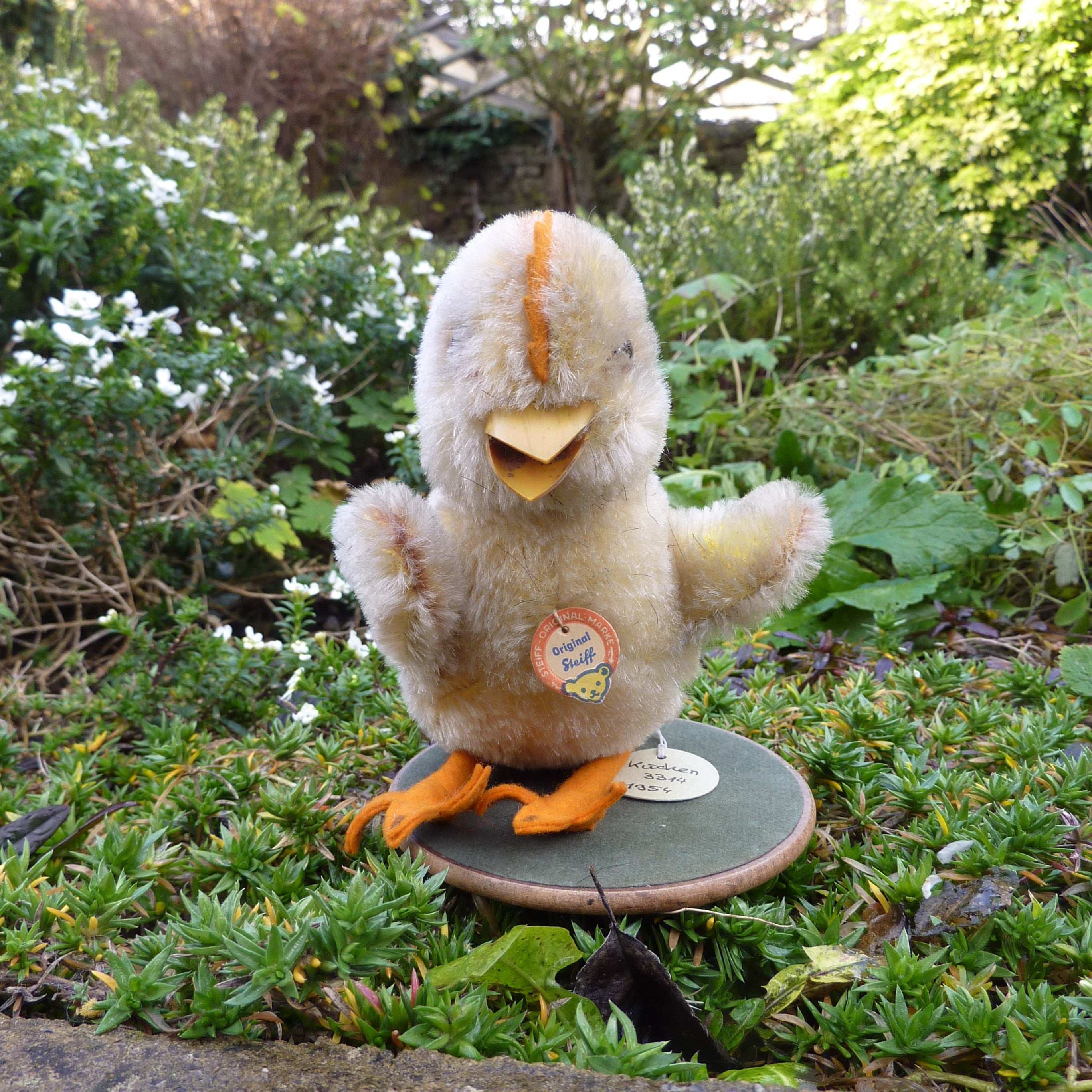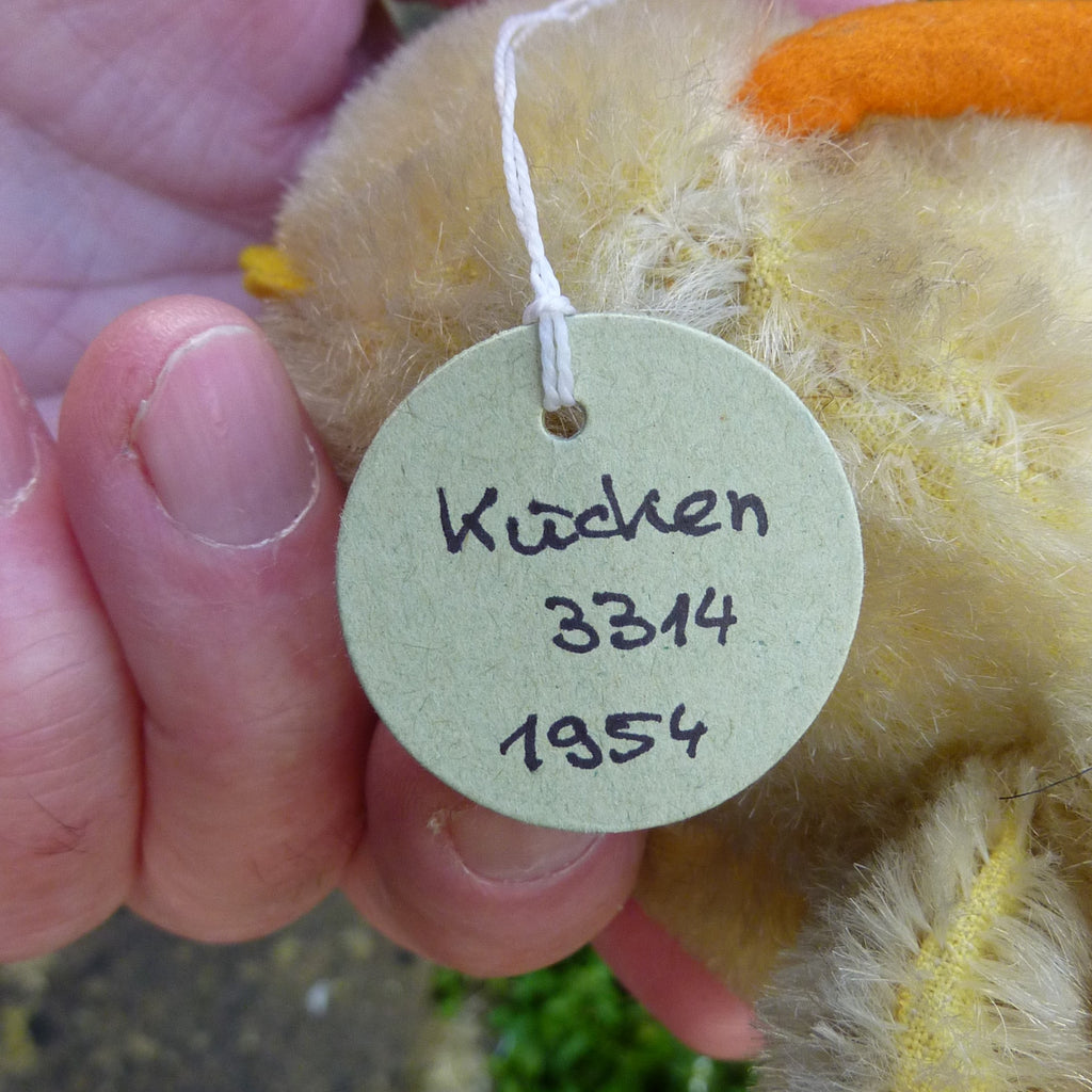 This delightful chick is made of pale yellow mohair with airbrushed markings, black glass eyes, a plastic beak and a felt crown, legs and feet. Never with button but in mint condition with chest tag and hand-written Steiff archive label dated 1954 (see photo).