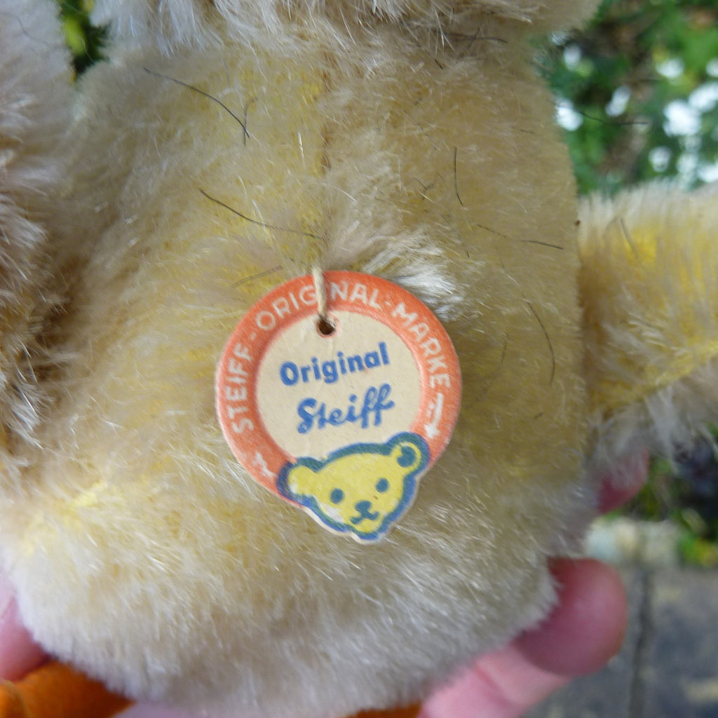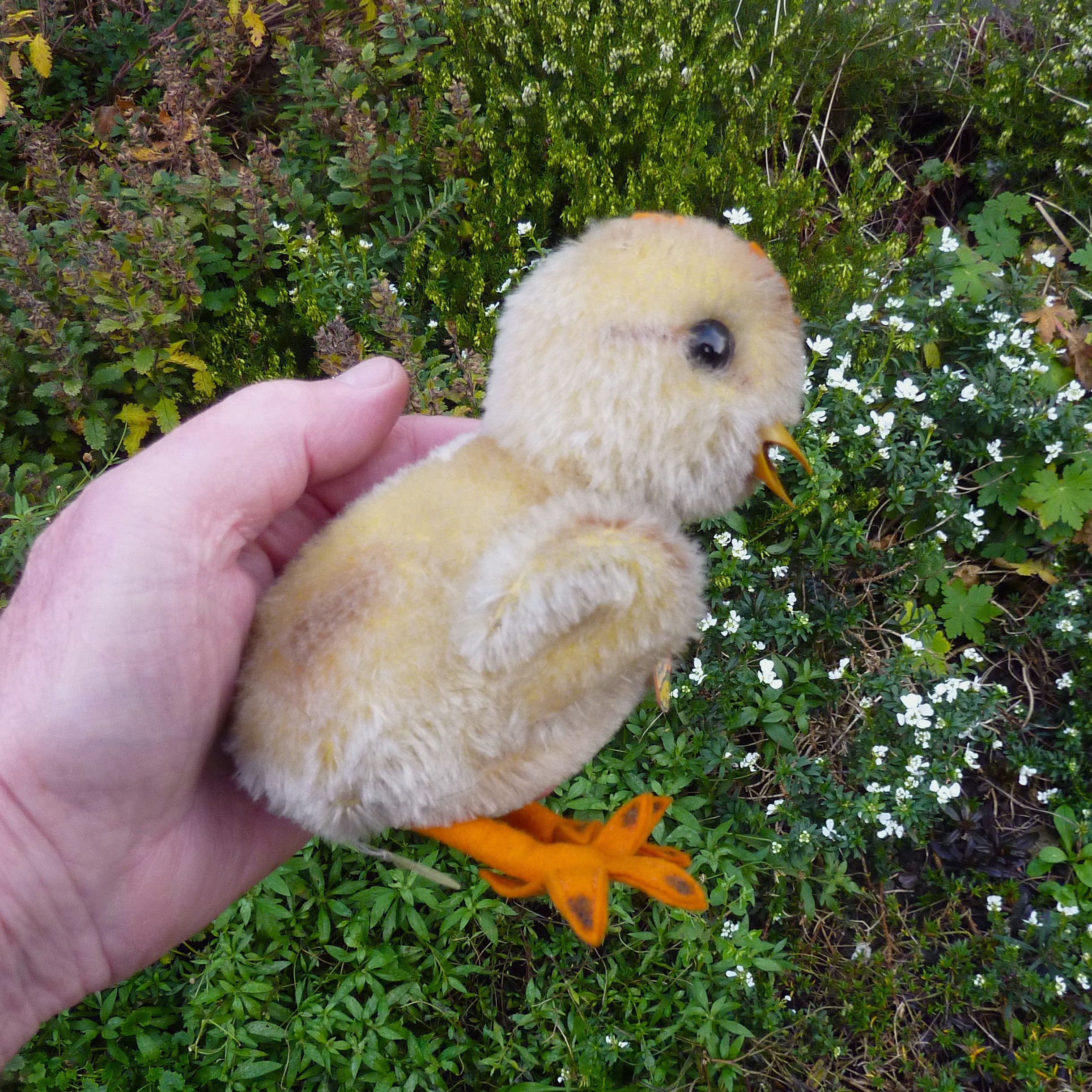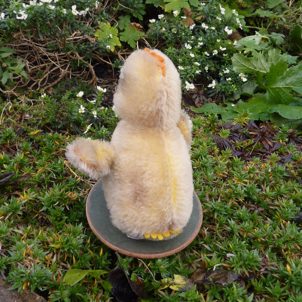 This delightful chick is made of pale yellow mohair with airbrushed markings, black glass eyes, a plastic beak and a felt crown, legs and feet. Never with button but in mint condition with chest tag and hand-written Steiff archive label dated 1954 (see photo).