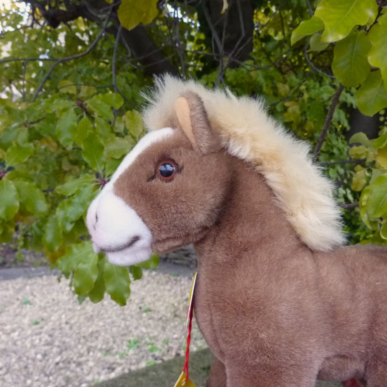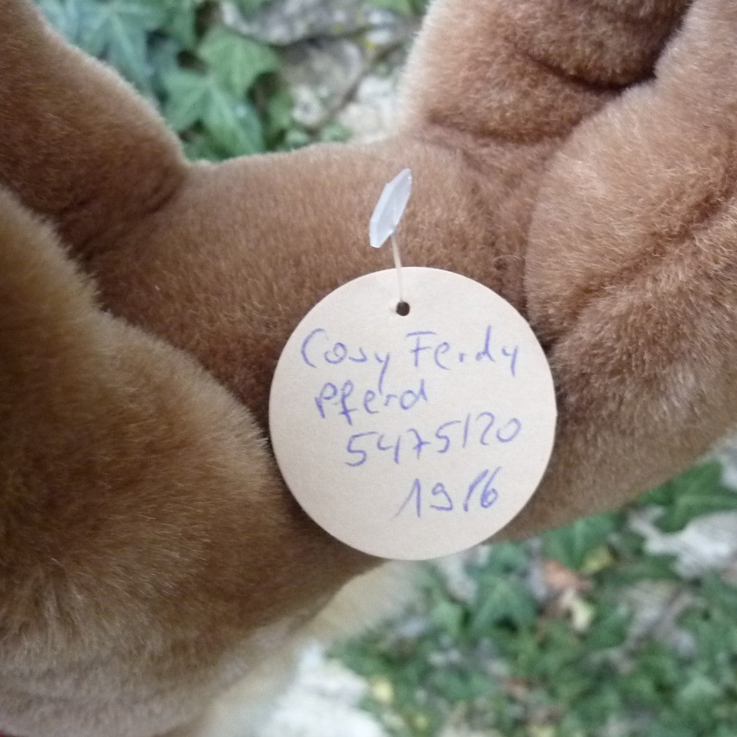 This standing pony is made of soft and dense, brown manmade plush with a white forelock, a blond mane and tail, and brown and black safety eyes. Never with button but in mint condition with chest tag and hand-written Steiff archive label dated 1986 (see photo).