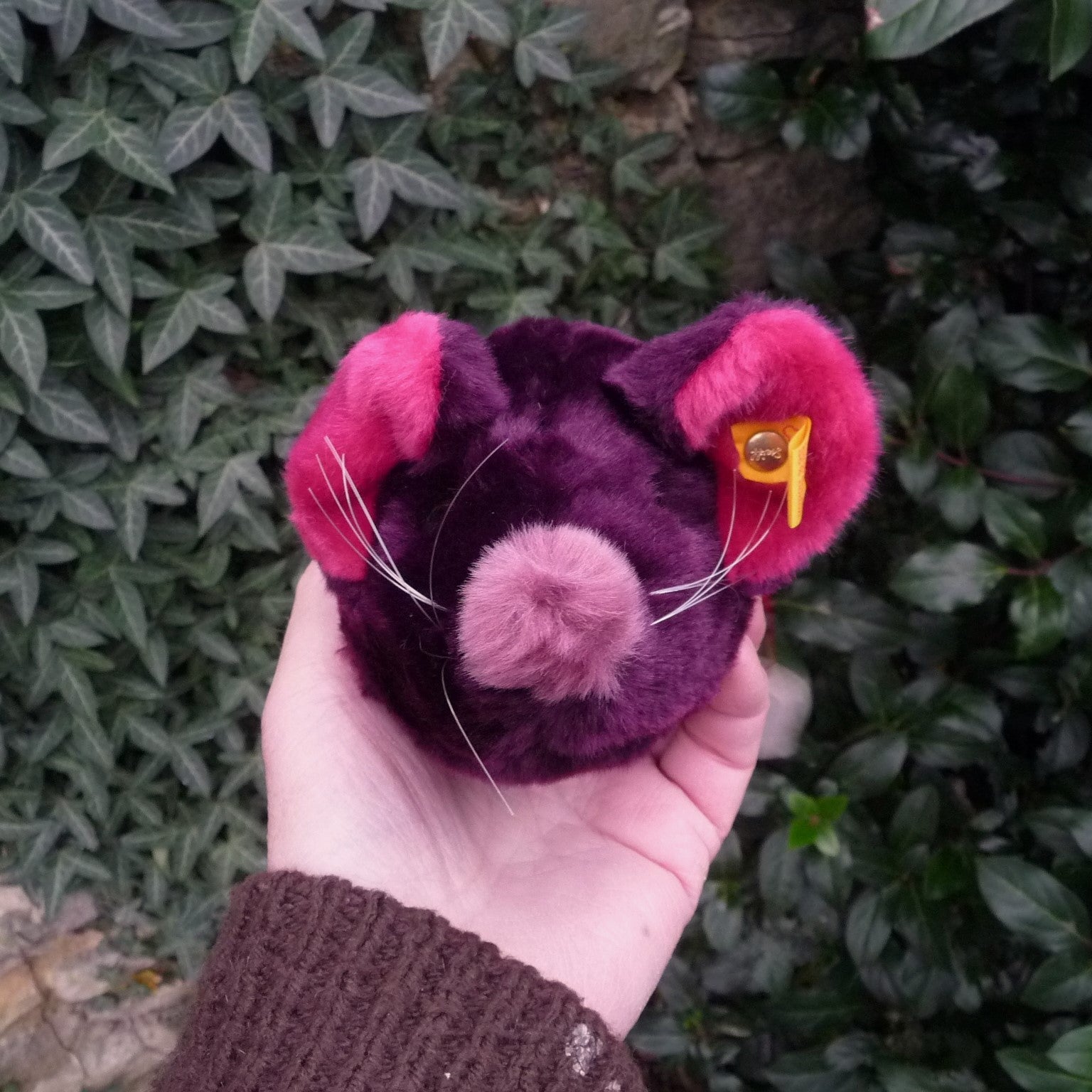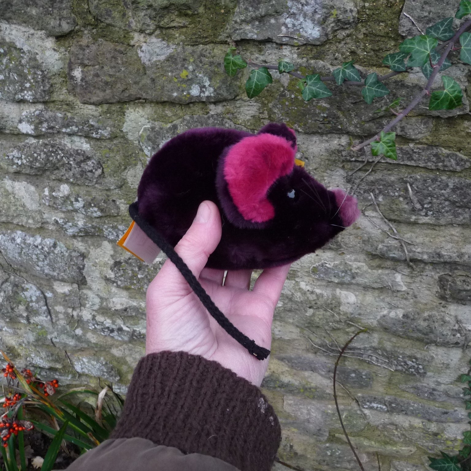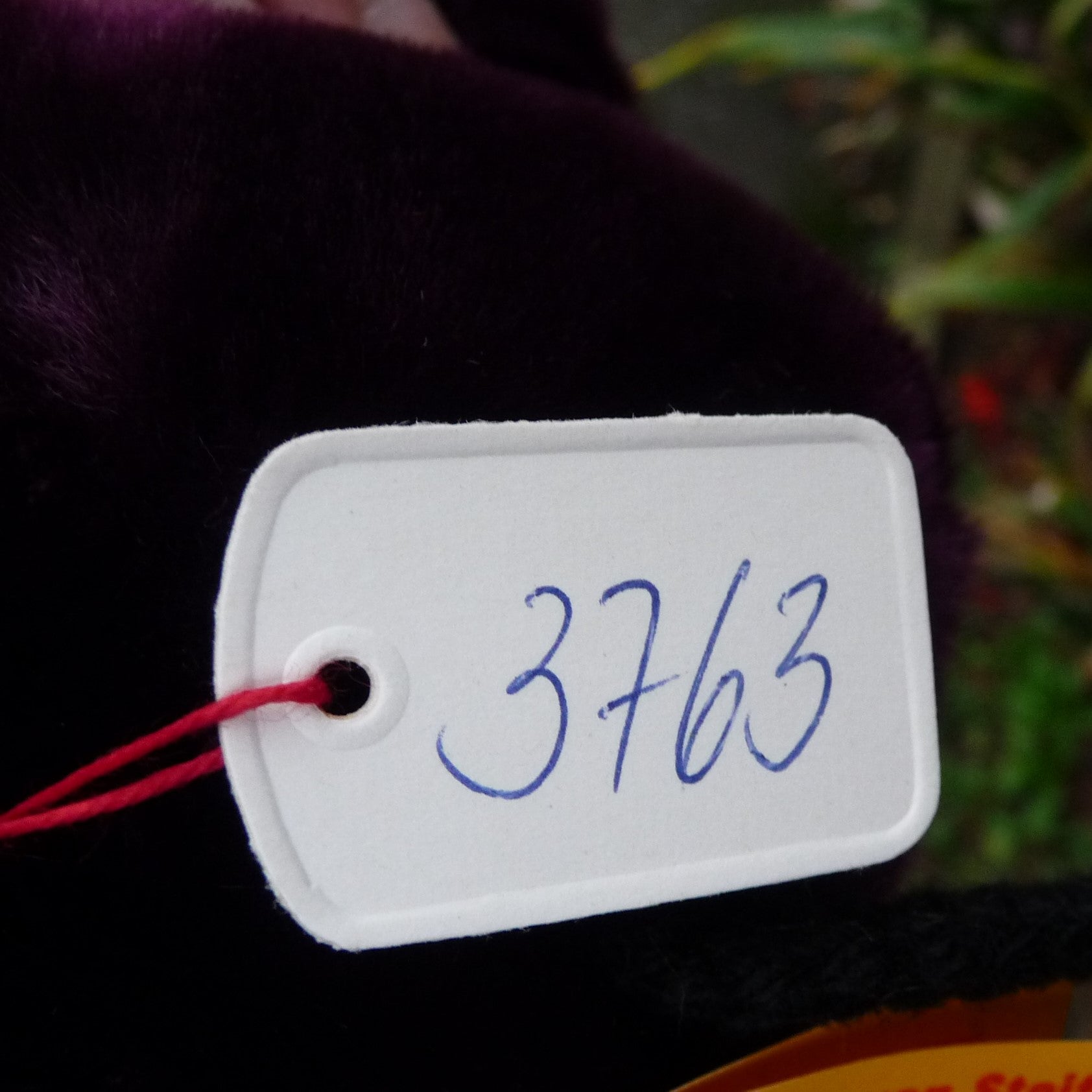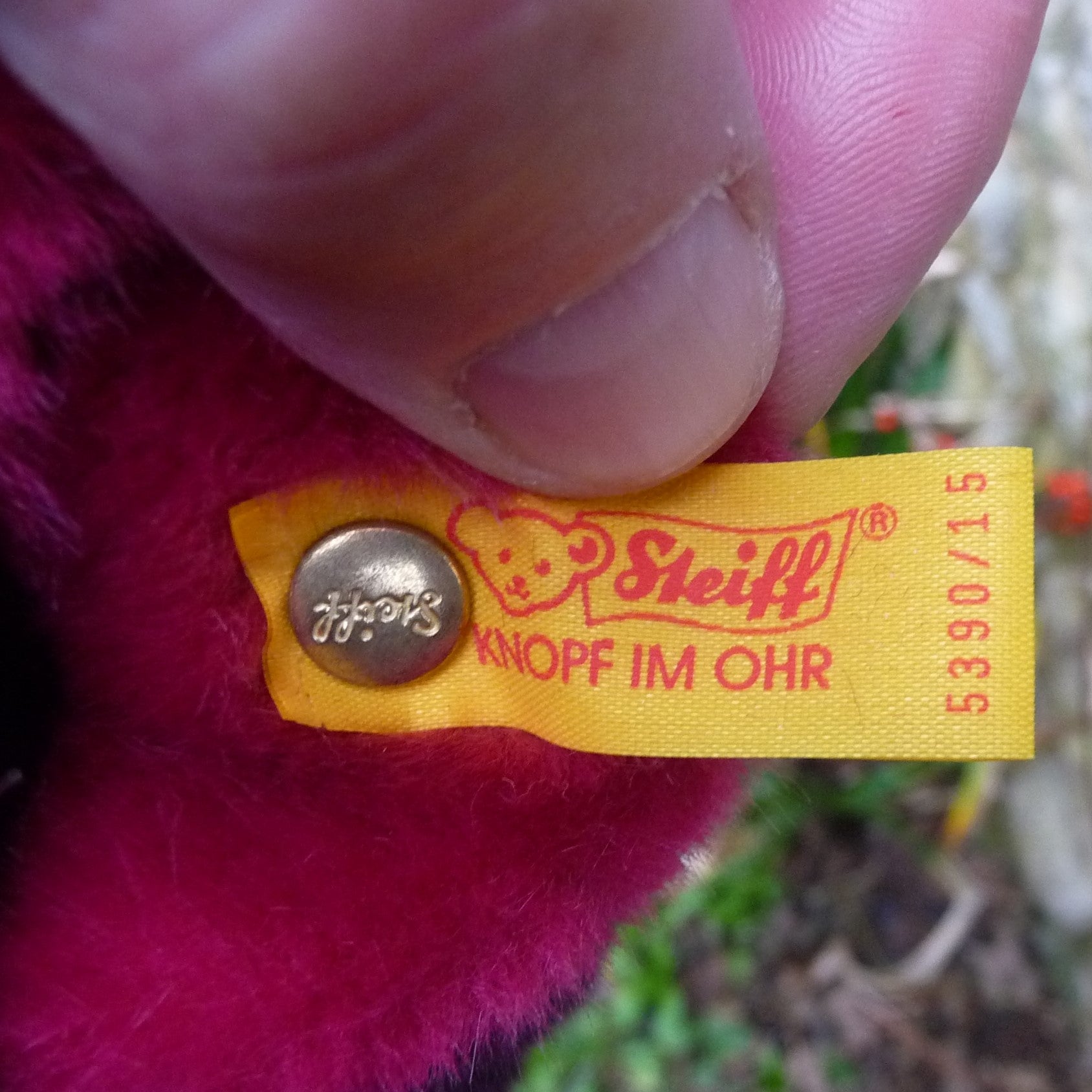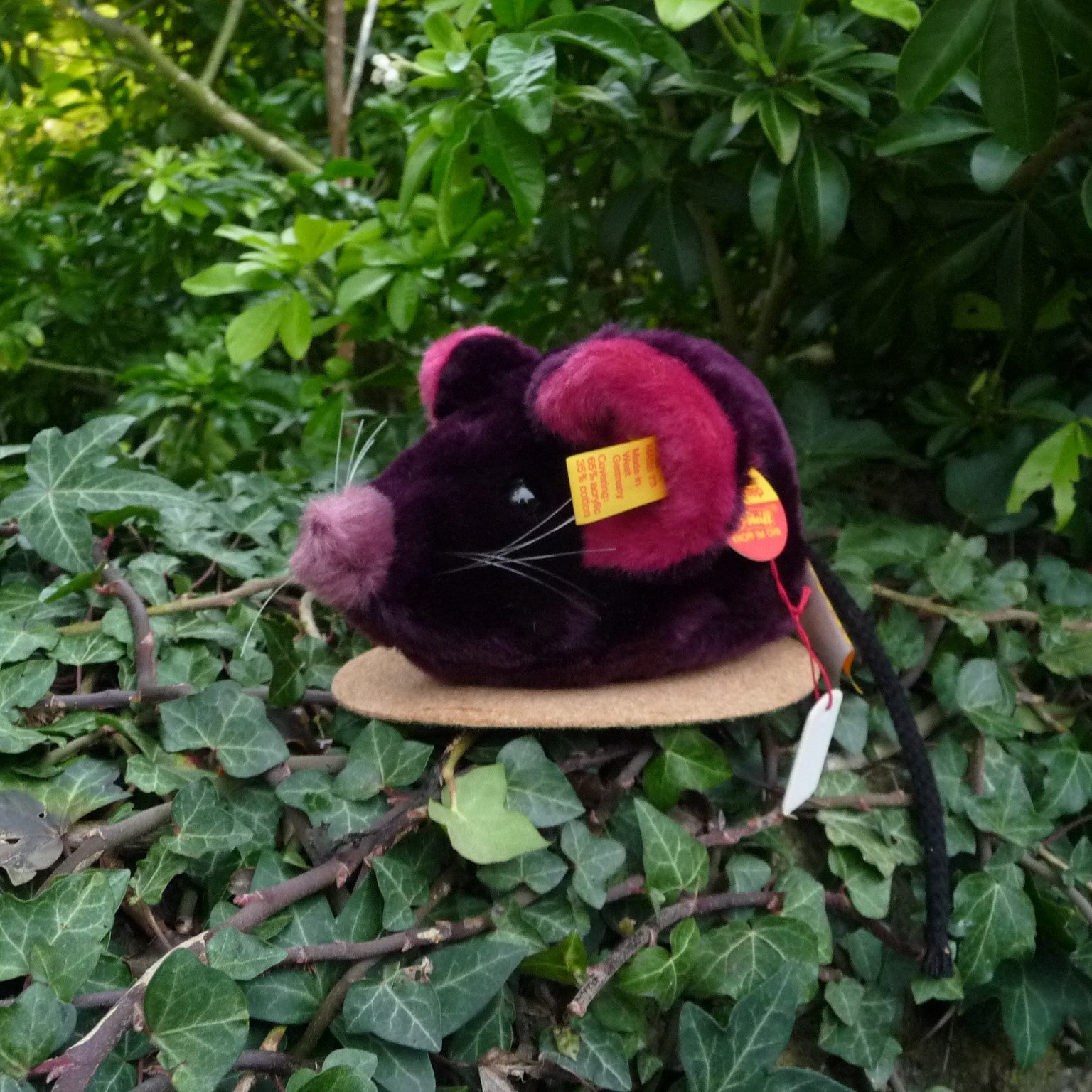 This eye-catching and ultra-soft mouse is made of dense and silky, purple and dark pink manmade plush with black plastic eyes, long whiskers and a cord tail. In mint condition with button, ear tag, side tag and a label, numbered 3763, which relates to Steiff’s patent registration application at the local court at Heidenheim (see photo).