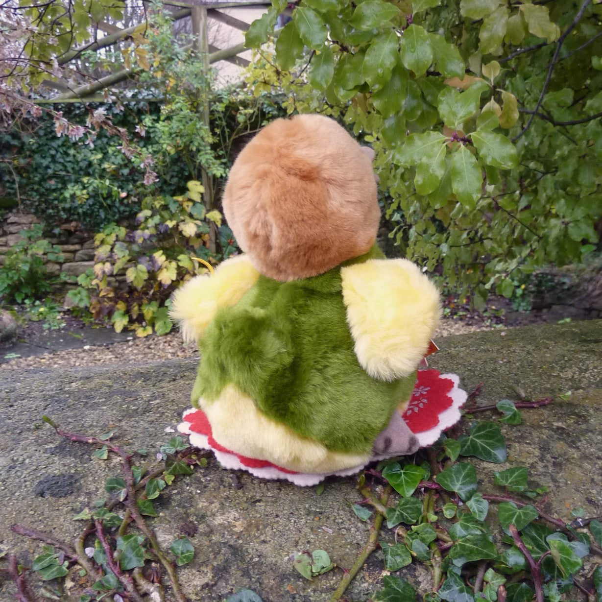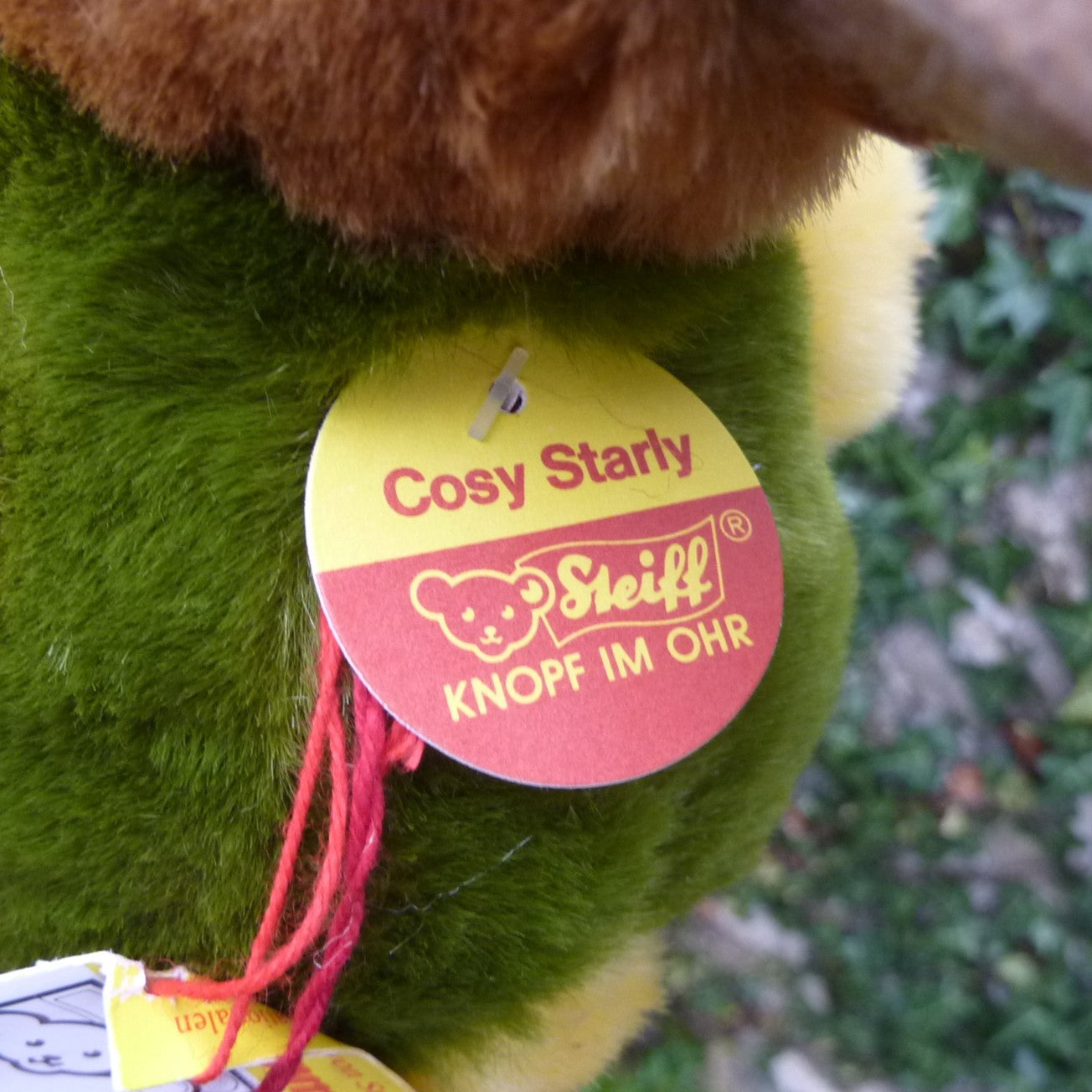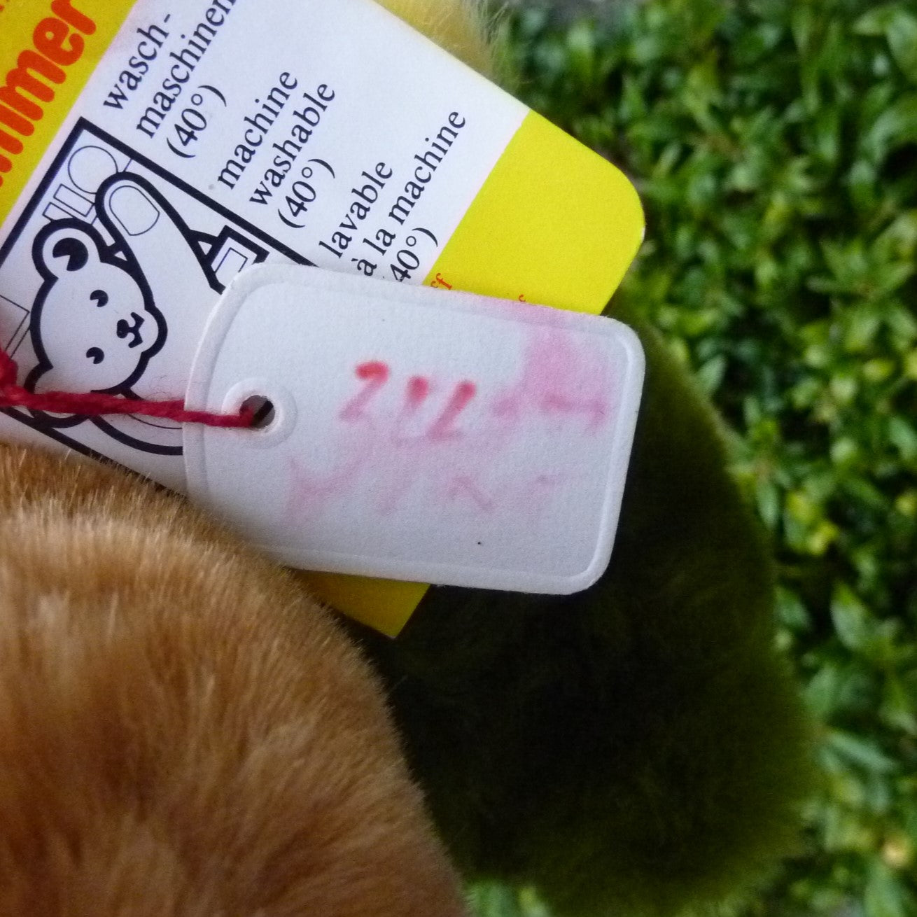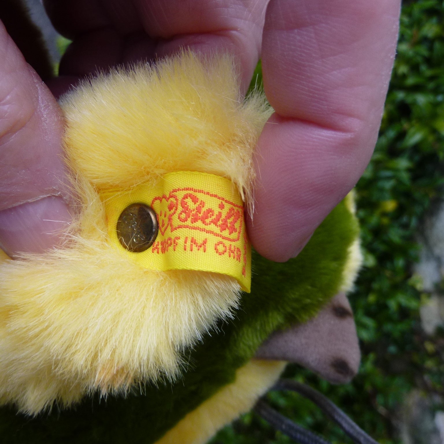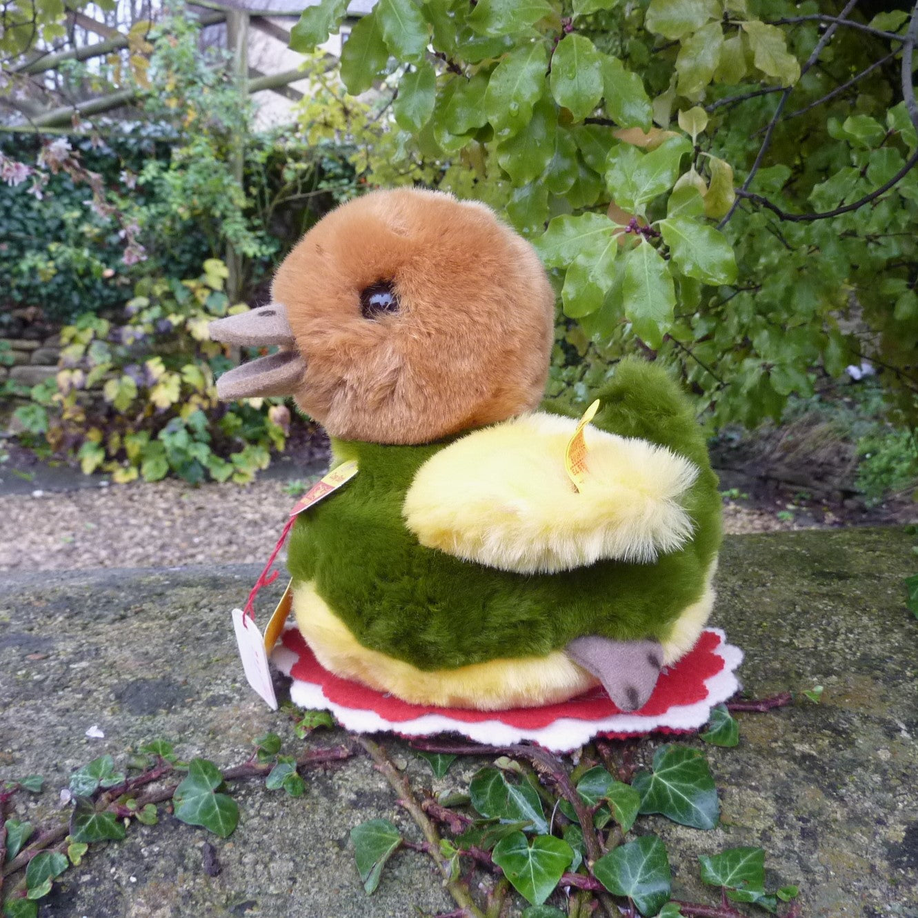 This lovely duckling is made of soft, brown, green and yellow manmade plush with black safety eyes, a felt beak and velour feet. Press his tummy and he squeaks! In mint condition with button and tag, chest tag and a (smudged) label, believed number 3427, which relates to Steiff’s registered design application at the local court at Heidenheim. (see photo).