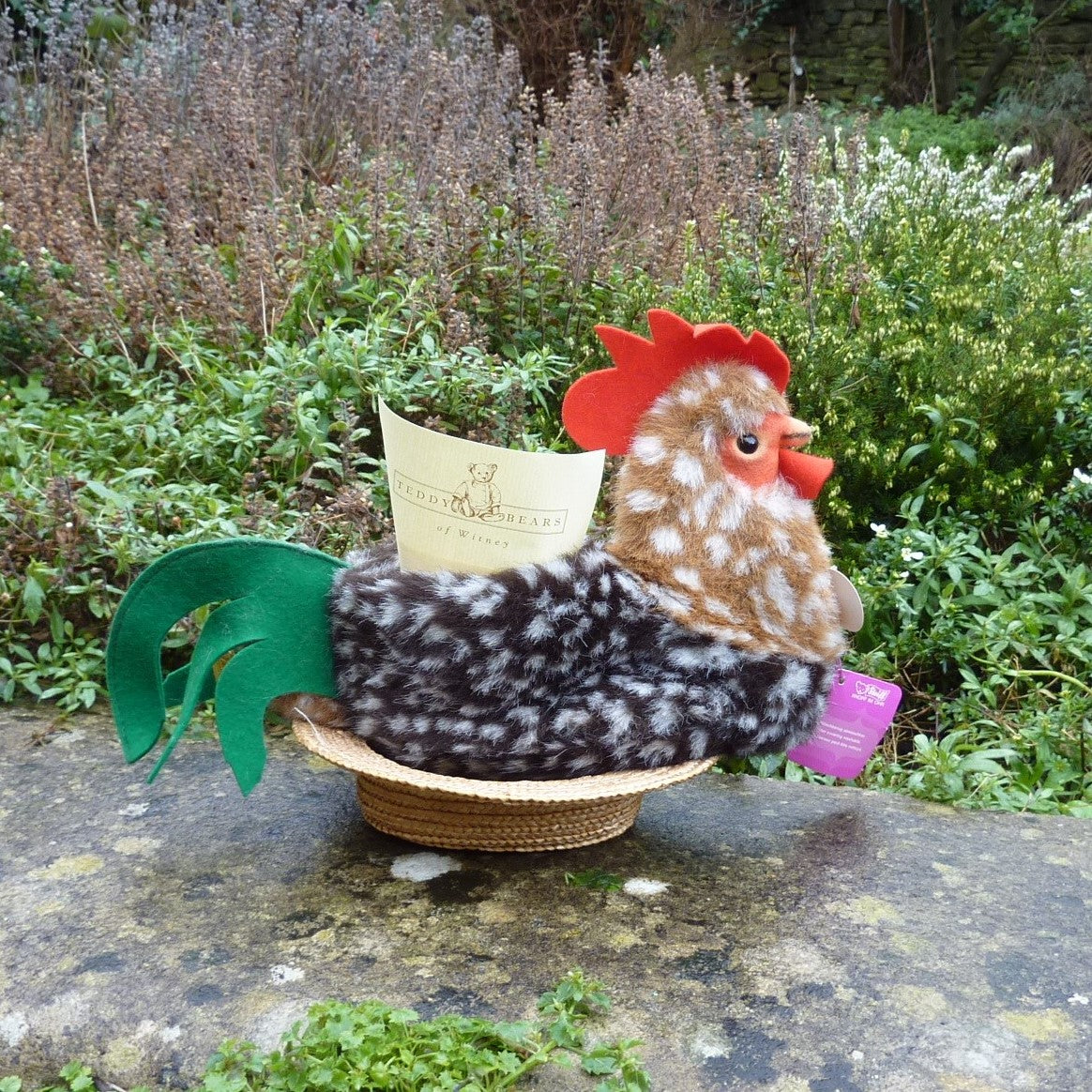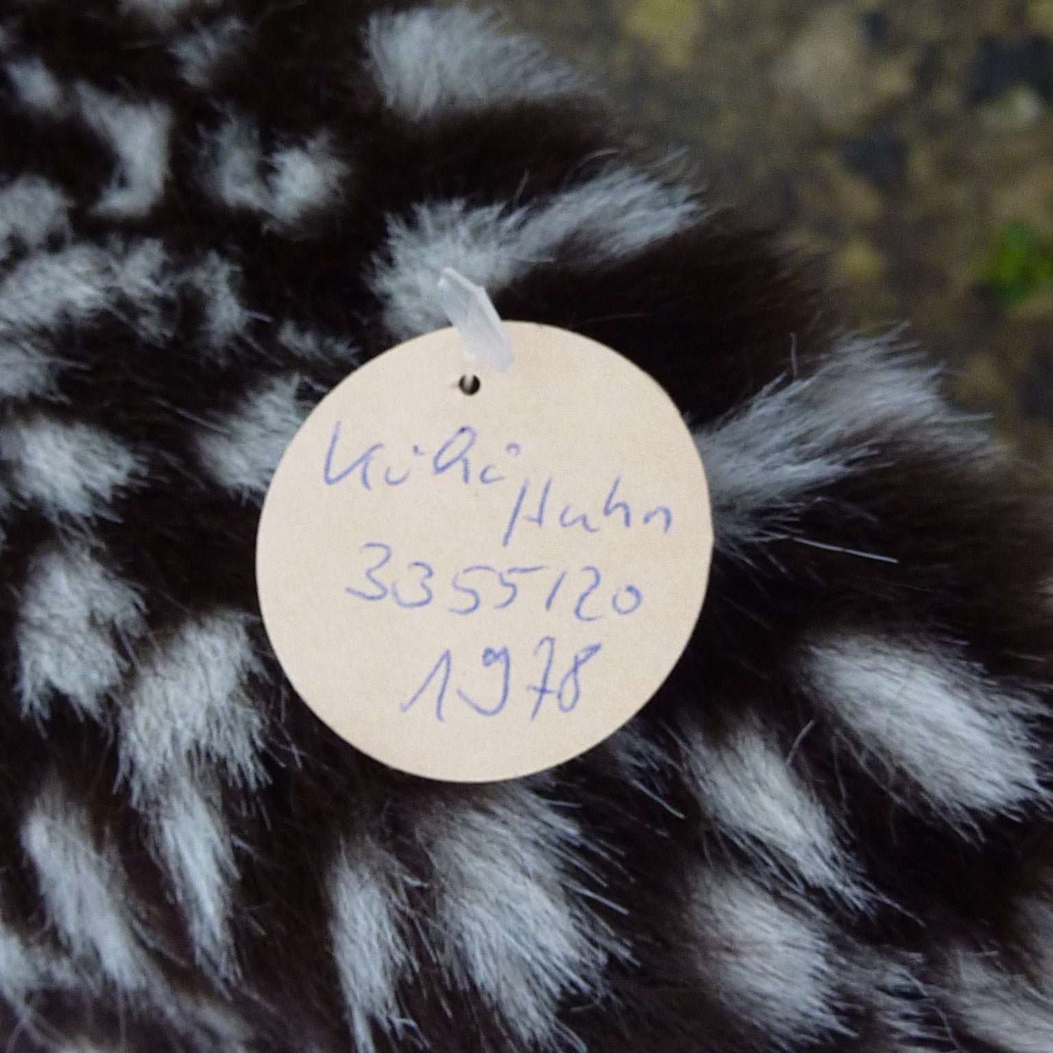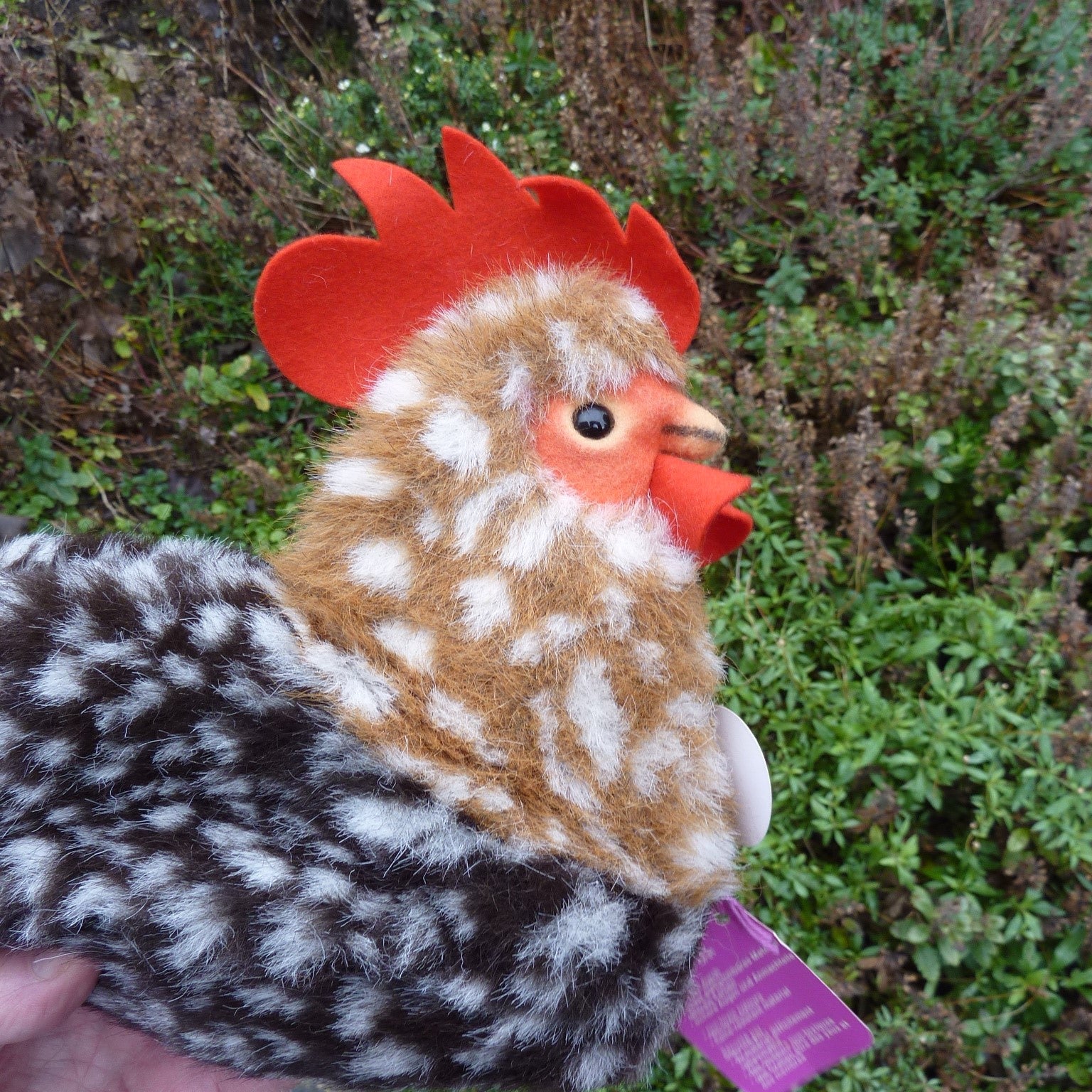 From the Steiff archives, unusual and eye-catching hen is made of speckled black and brown, manmade plush with a felt comb, wattle and tail feathers. His back opens as a pocket so that he can be used as an egg cosy. In mint condition with button, tag andoriginal, hand-written Steiff archive label dated 1978 (see photo).
