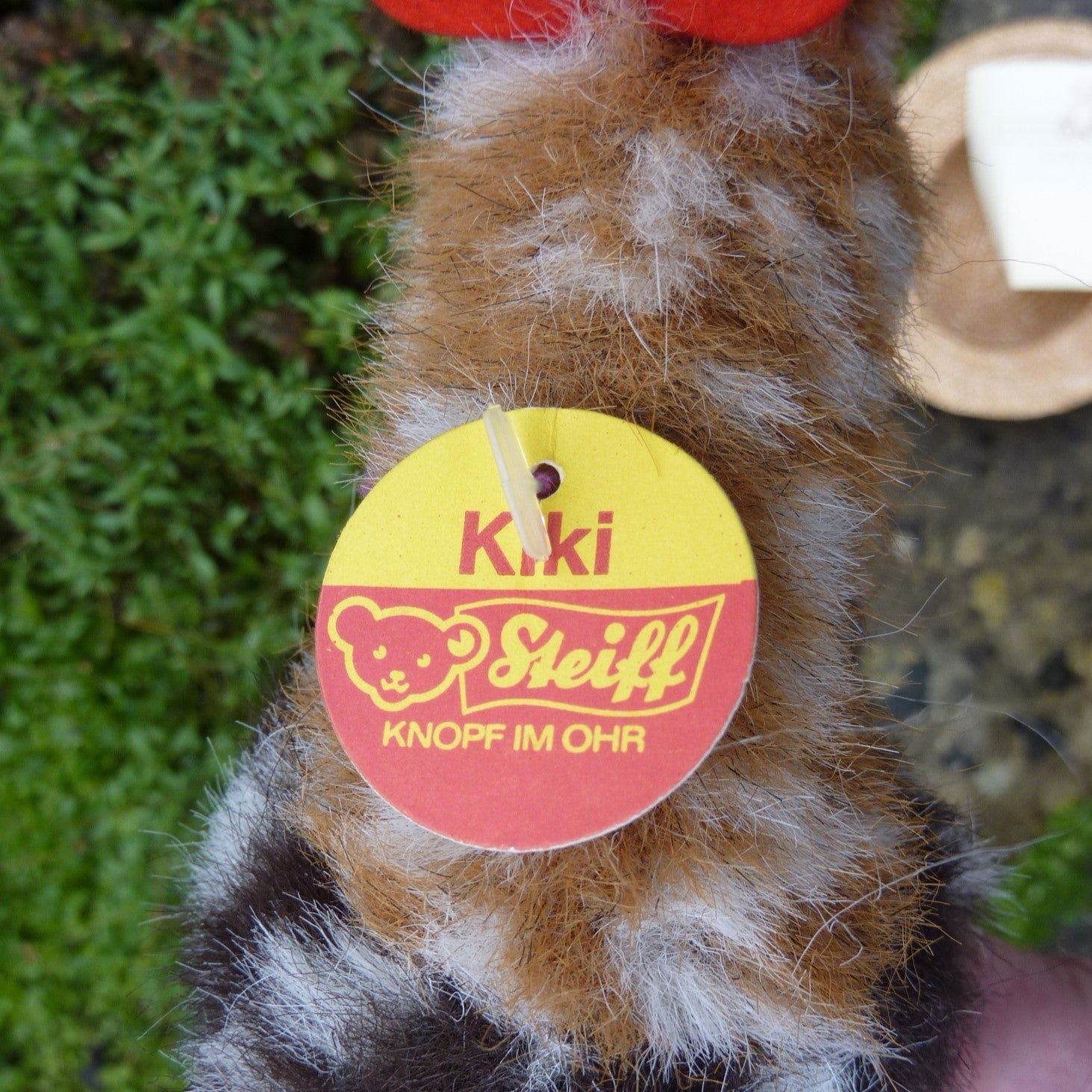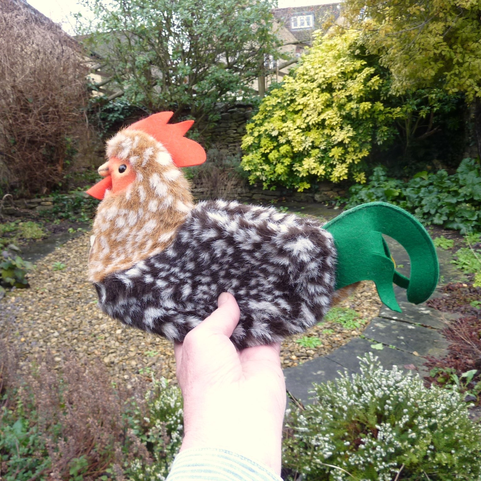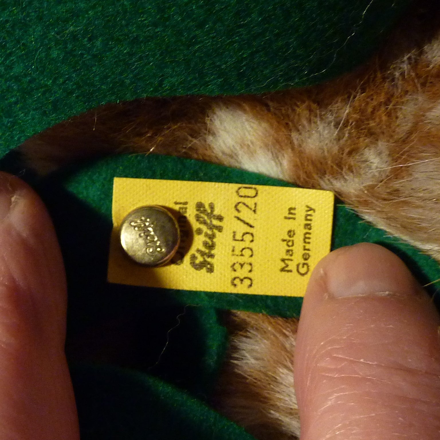 From the Steiff archives, unusual and eye-catching hen is made of speckled black and brown, manmade plush with a felt comb, wattle and tail feathers. His back opens as a pocket so that he can be used as an egg cosy. In mint condition with button, tag andoriginal, hand-written Steiff archive label dated 1978 (see photo).