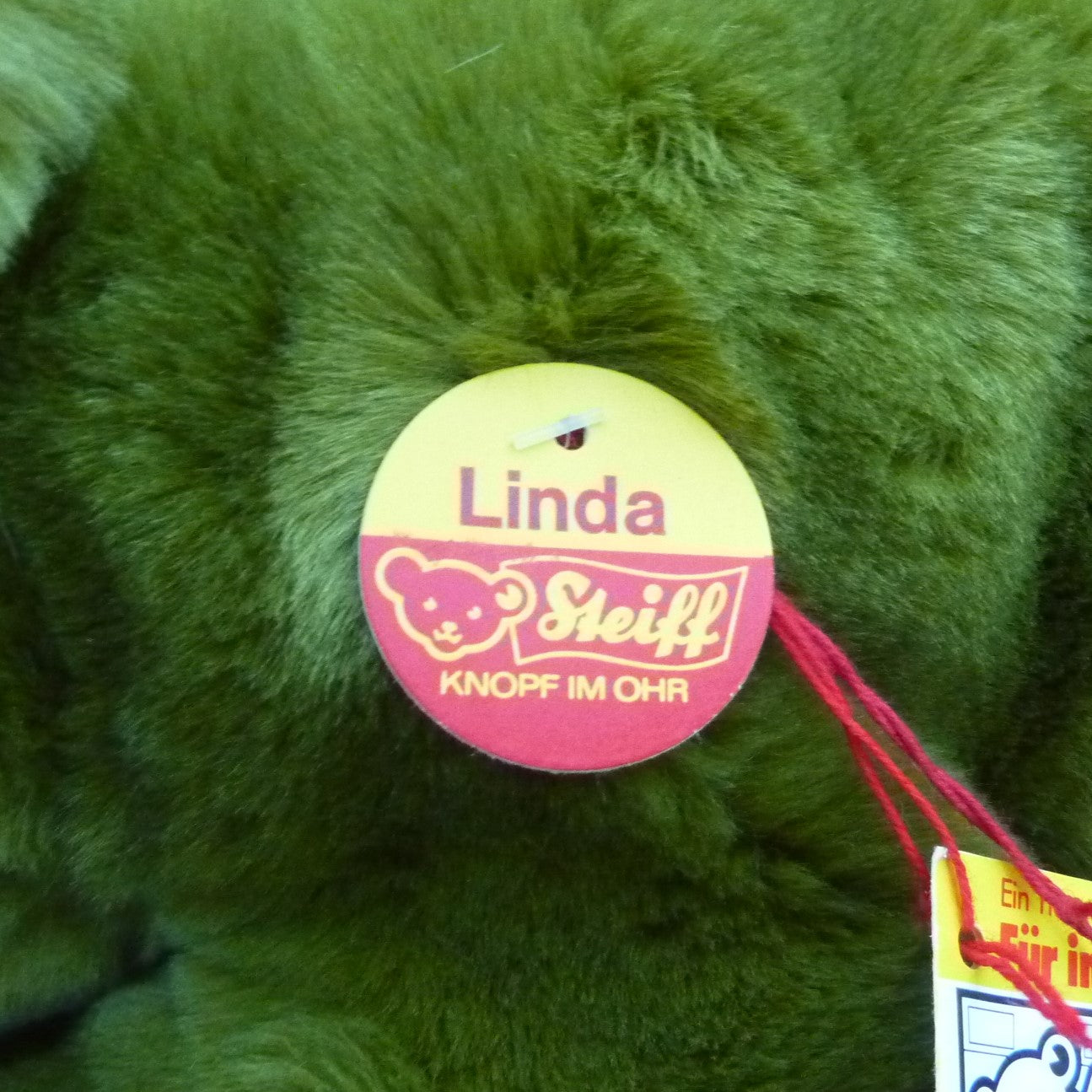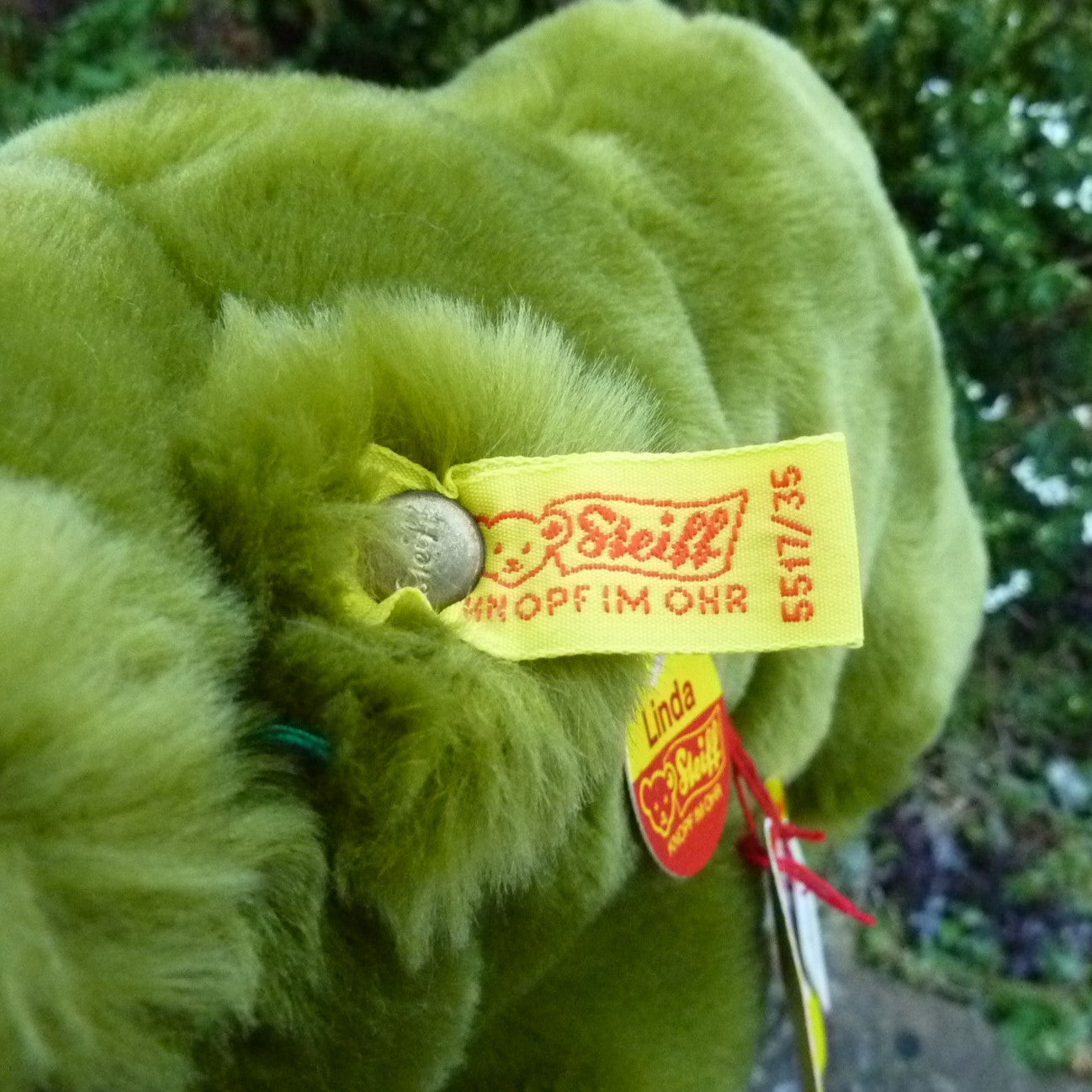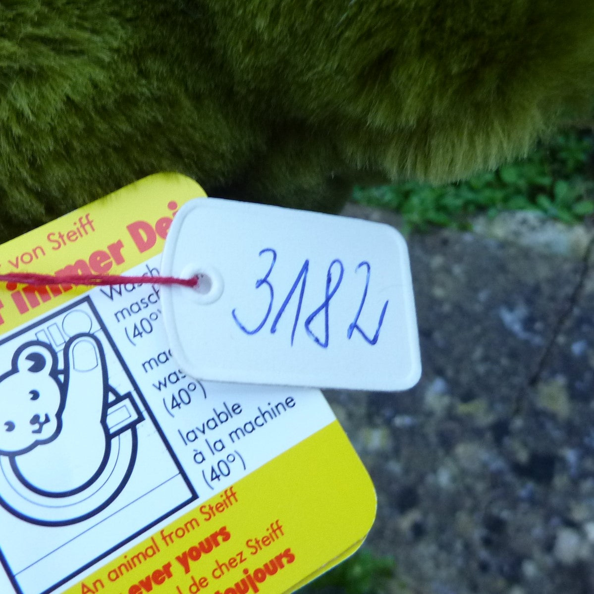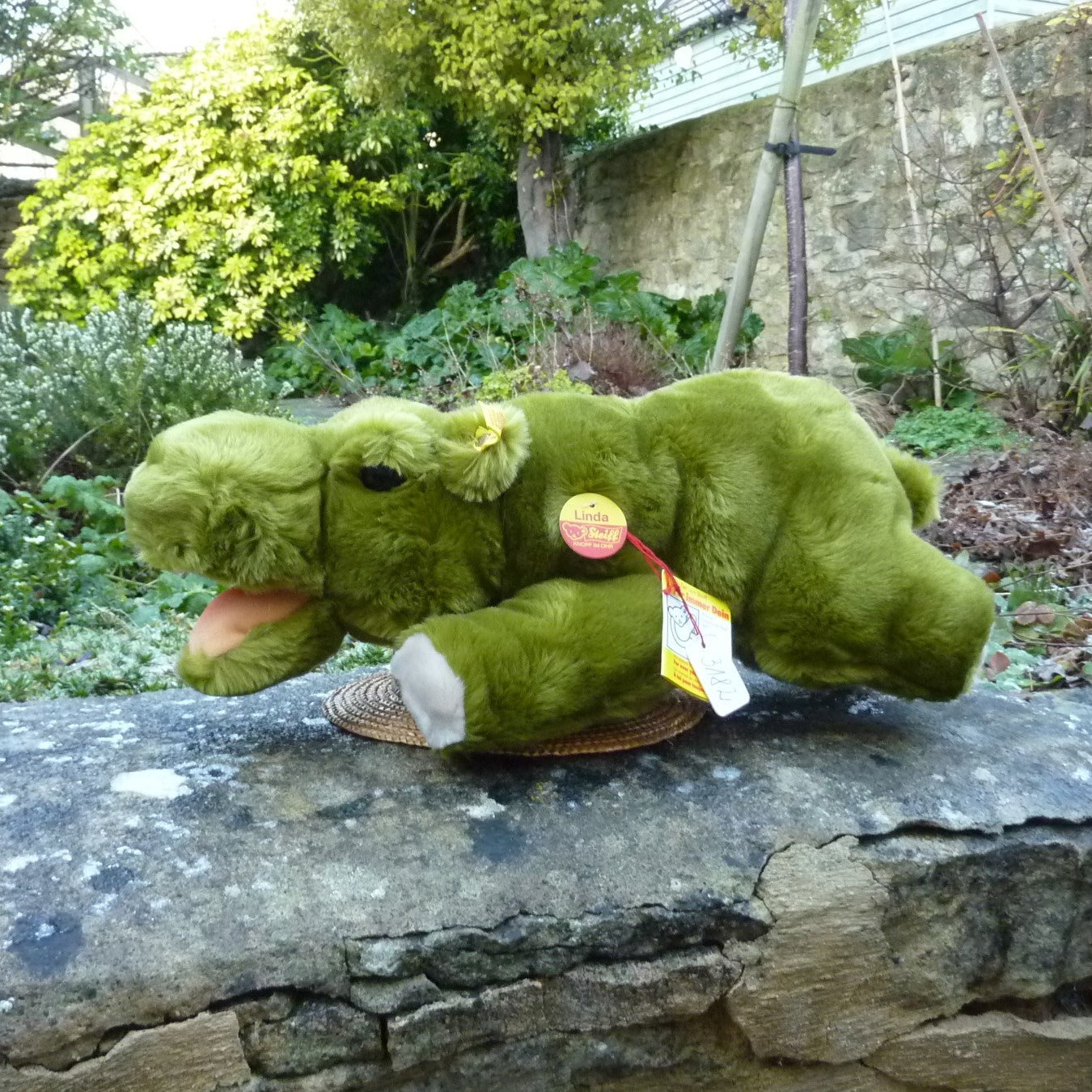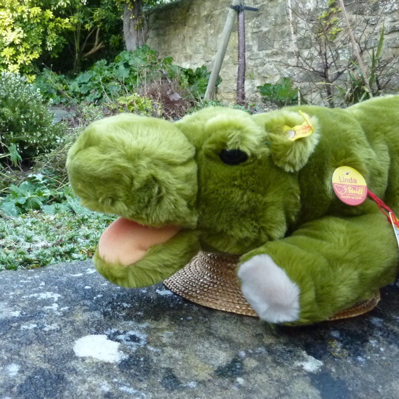 This lying hippo is made of soft and dense, green manmade plush with black safety eyes and an open mouth. As new with button, ear tag and side tag, as well as a label, numbered 3182, which relates to Steiff’s patent registration application at the local court at Heidenheim (see photo).