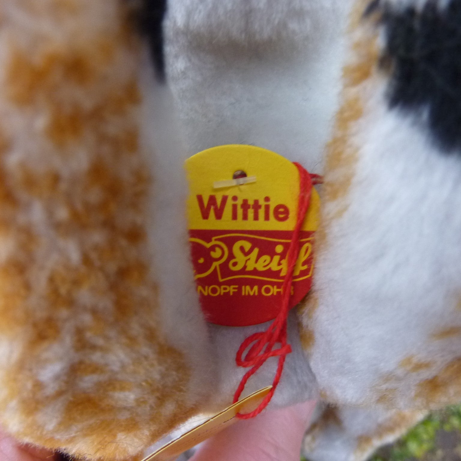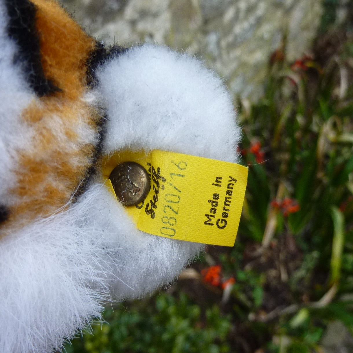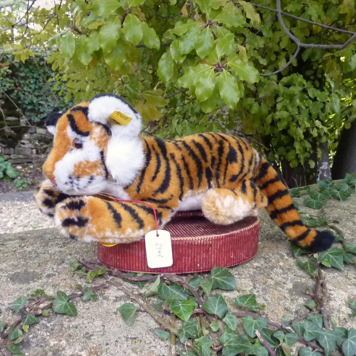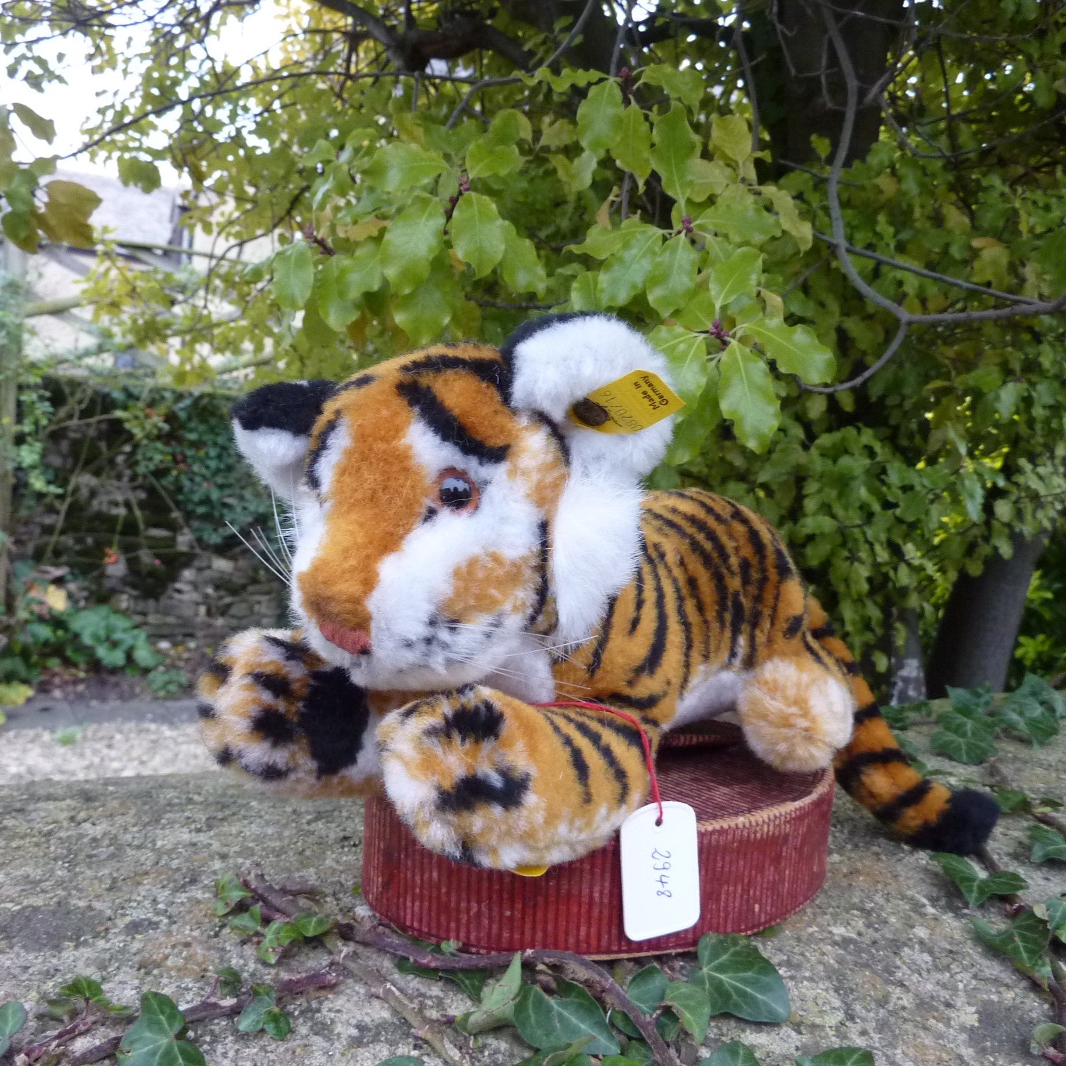 This sweet, lying tiger is made of soft, golden brown manmade plush with black airbrushed stripes, pale amber and black safety eyes, and long whiskers. In mint condition with button, crisp and fresh ear tag and chest label. No archive tag but with a label numbered 2948, which relates to Steiff’s patent registration application at the local court at Heidenheim.
