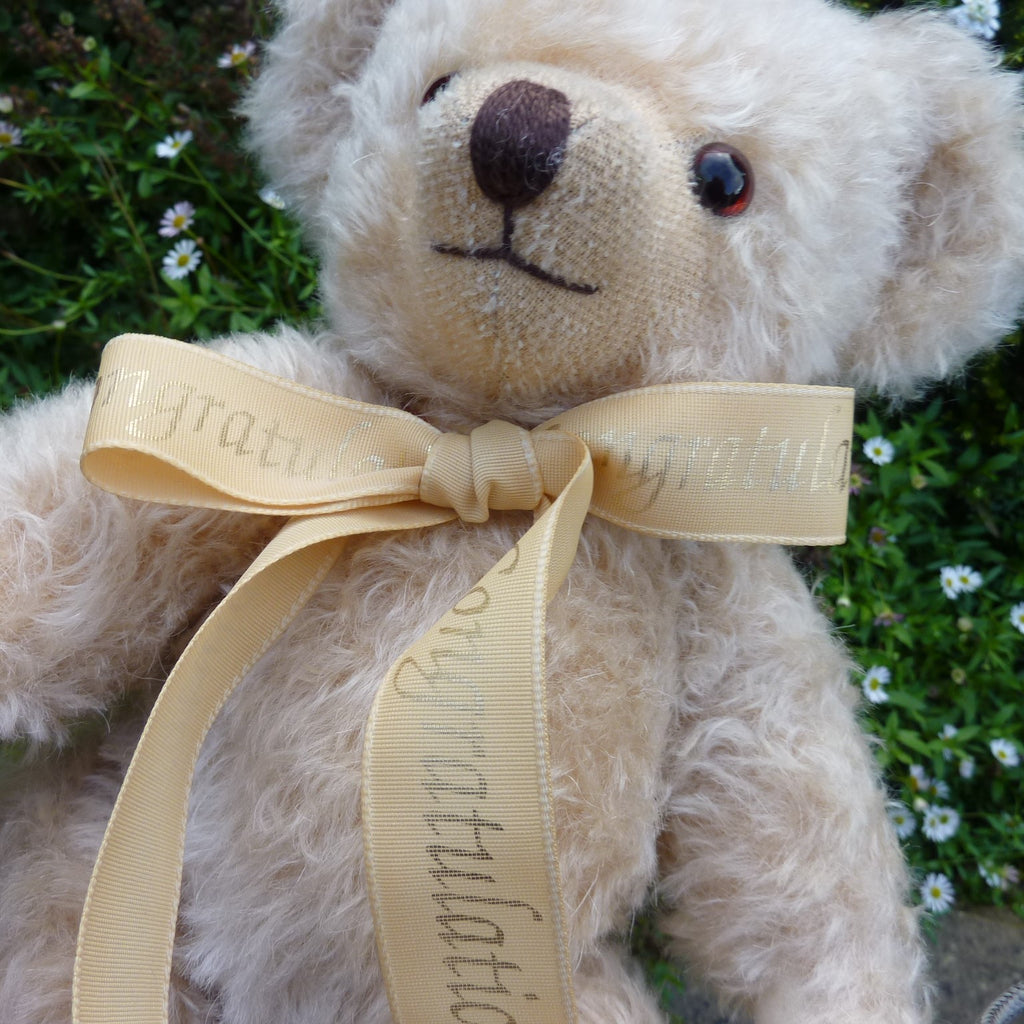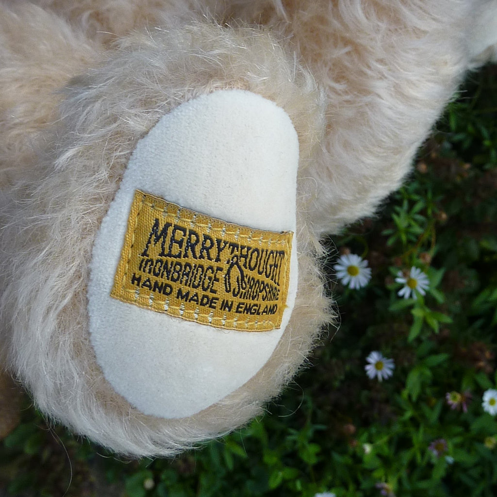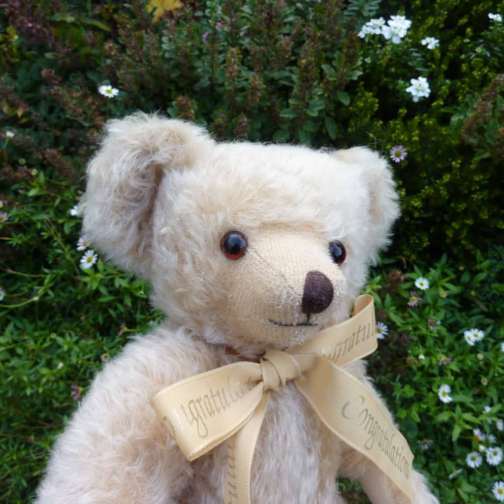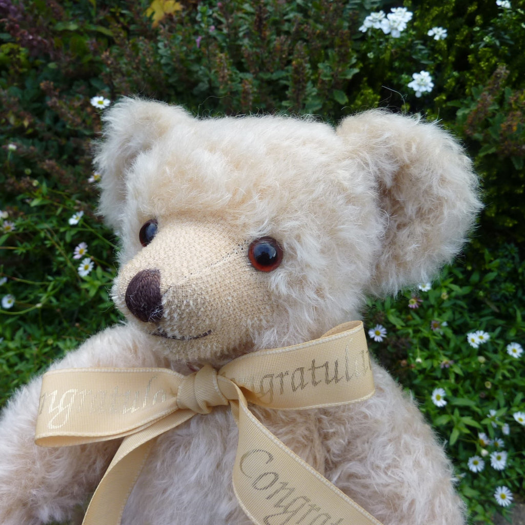 This attractive classic bear is made of distressed cream mohair with brown and black safety eyes and white velveteen paw pads. Not a limited edition, he wears a Congratulations-printed ribbon neck bow. In excellent condition with Merrythought sewn-in labels.