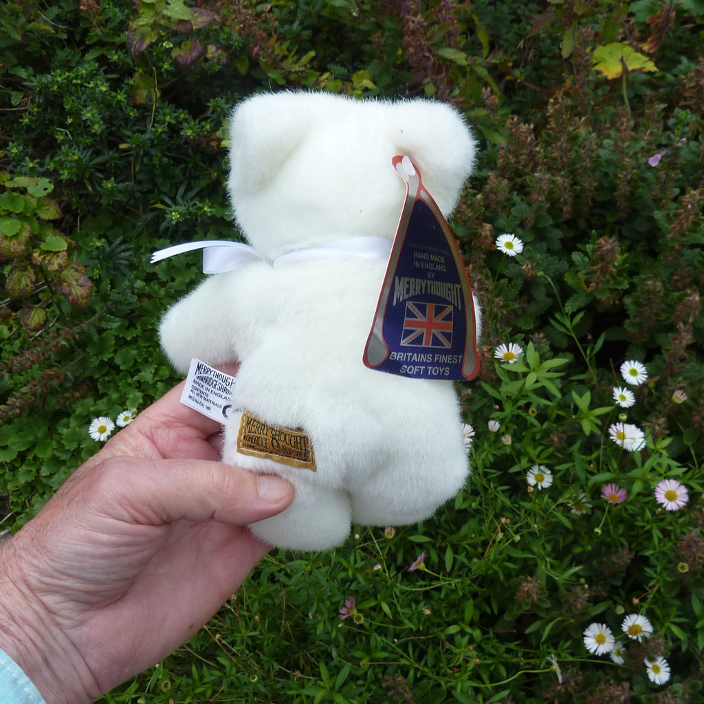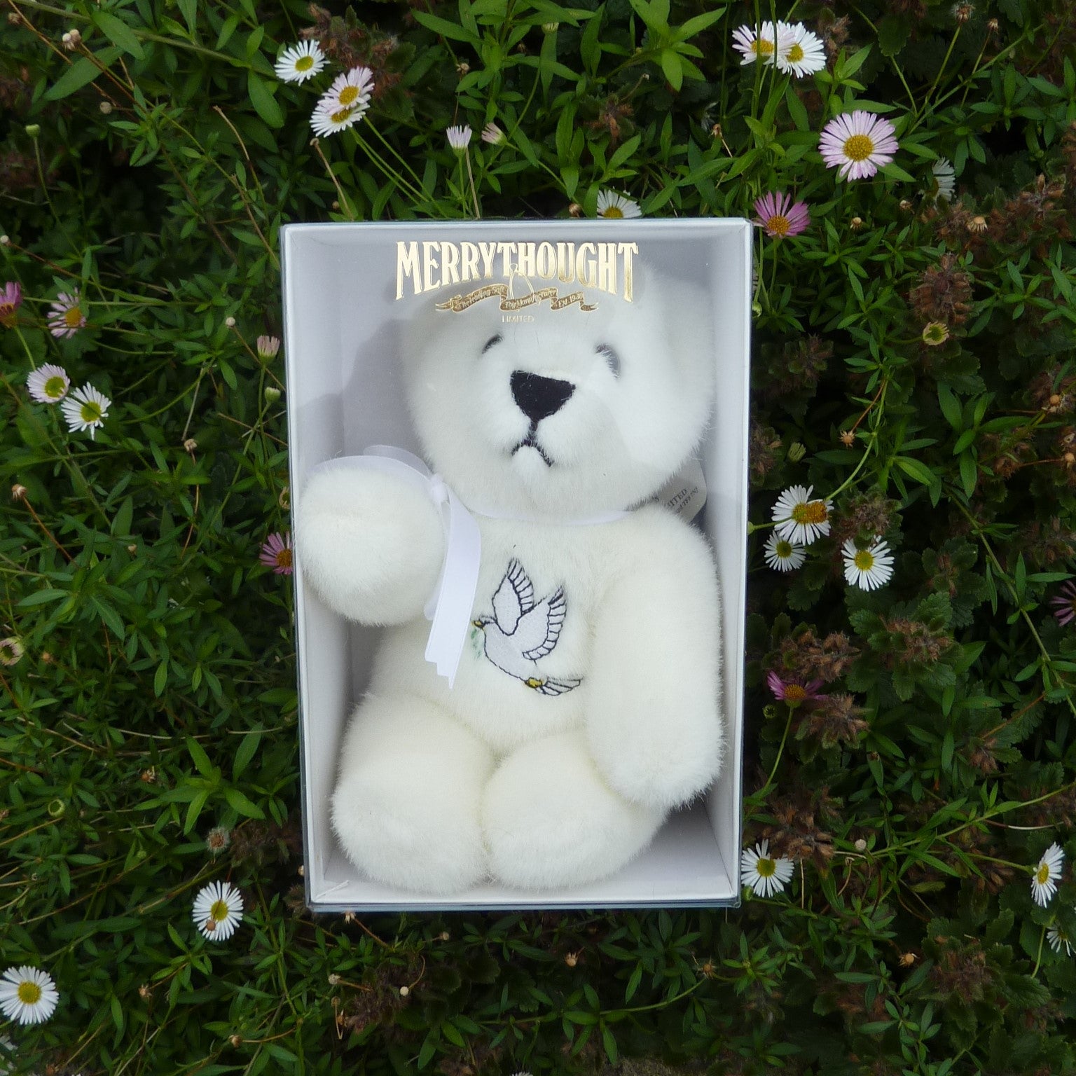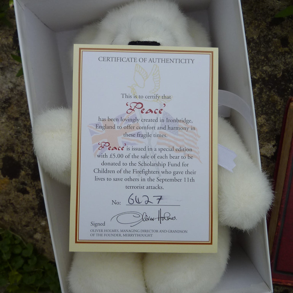 This small bear was made in a special numbered edition following the terrorist attacks in New York on September 11th 2001. £5 from the sale of each bear was donated to a scholarship fund for the children of firefighters whose lives were lost in the aftermath. Unjointed, Peace is made of dense white artificial plush and is softly pellet filled. A dove of peace is embroidered on the chest. As new, he is complete with all labels in the original box. Number 6427 of the edition.