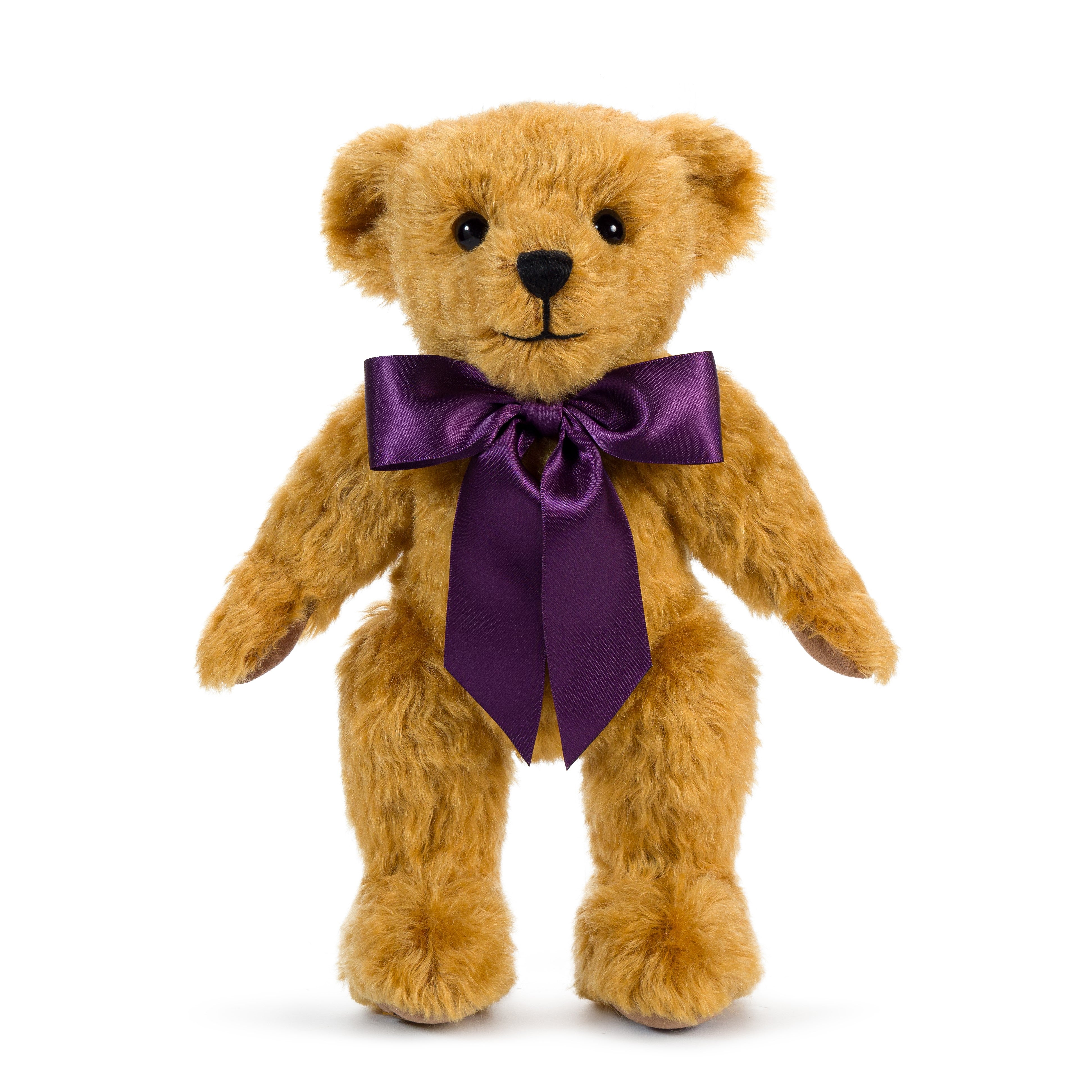 A luscious blackberry-coloured satin bow accessorises this charming bear.