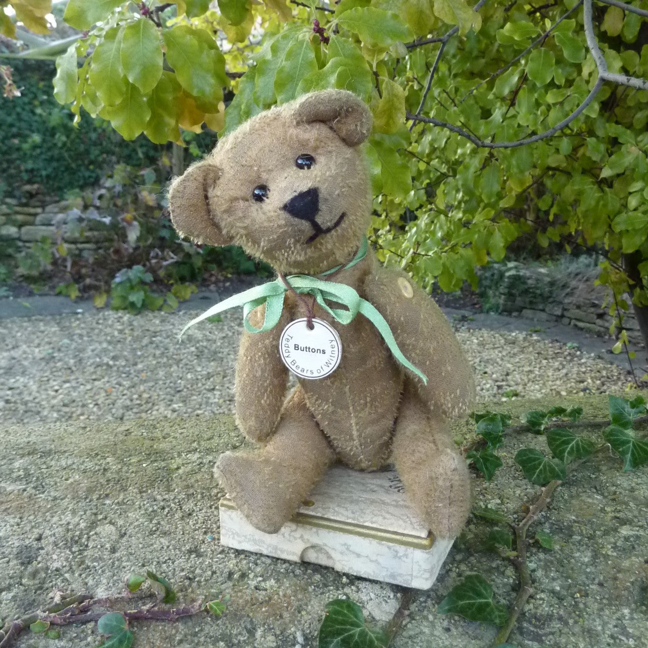 Inspired by a primitive 1920s American original, this small bear has simple button and thread arm and leg joints. His once old gold mohair has been so extensively plucked that he is almost bald. Buttons has shiny black glass eyes and, of course, buttons on his shoulders and thighs. He comes with a certificate signed by Ian Pout. Only one available.