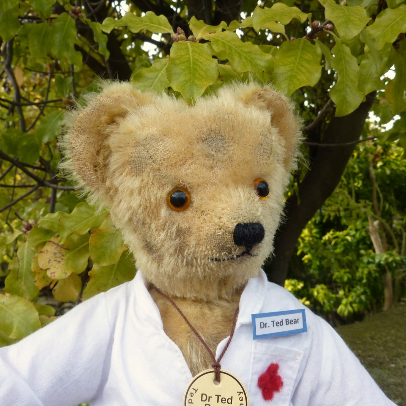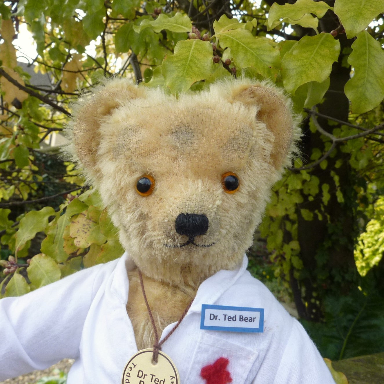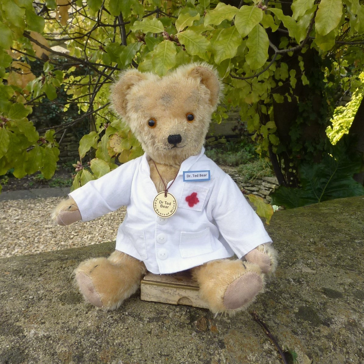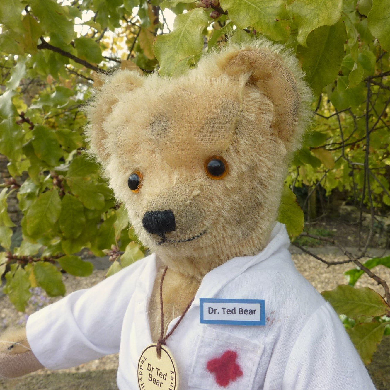 Made of aged, blond mohair, Dr Ted has pale amber and black glass eyes and cotton paw pads. He wears a cotton, doctor’s coat with a Dr Ted Bear badge. He comes with a certificate signed by Ian Pout.