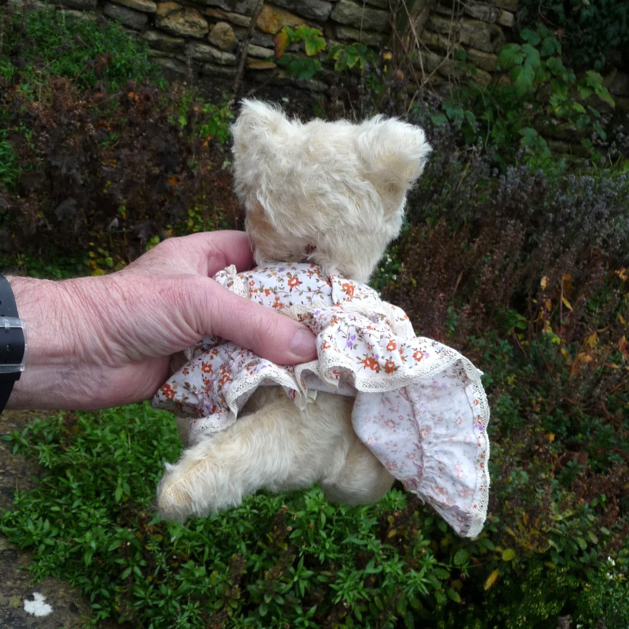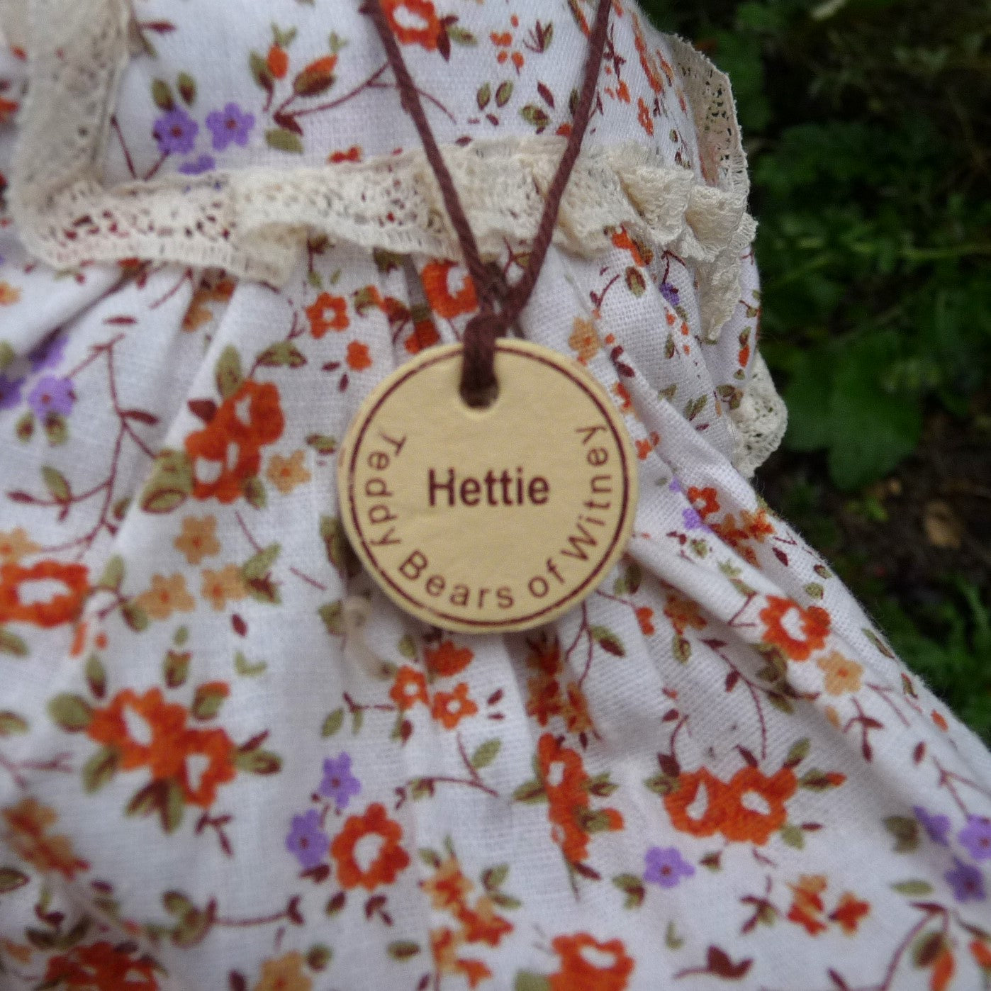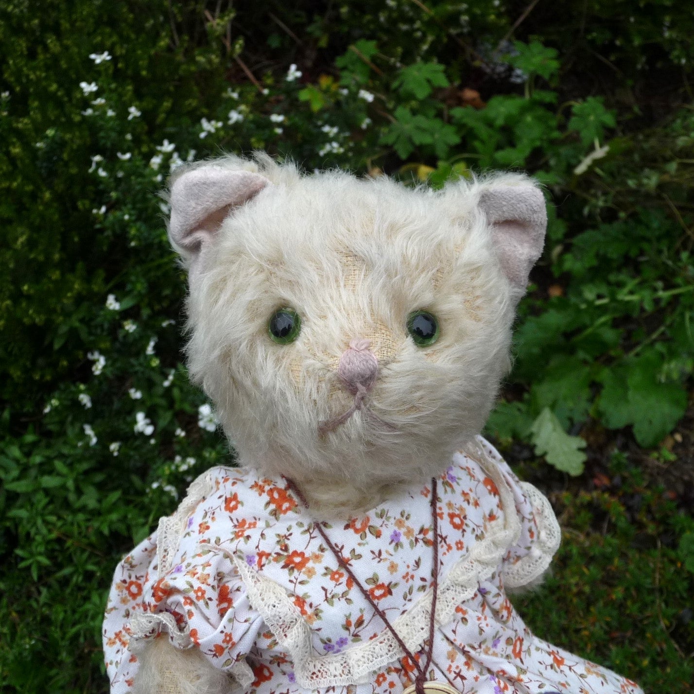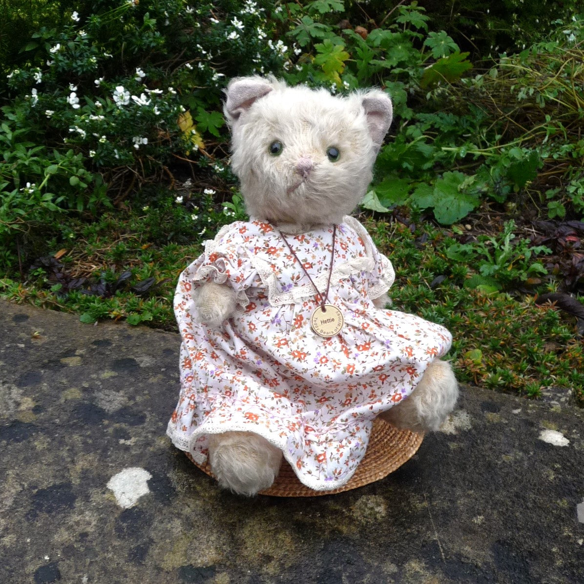 Made of distressed ivory mohair with subtle brown airbrushed markings, this sweet cat has green and black safety eyes, a pale pink stitched nose and mouth, and a mohair tail. Hettie wears a lace-trimmed, cotton, floral print dress. Press her tummy and she squeaks! She comes with a certificate signed by Ian Pout.